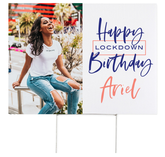 Idea 1) If you were stuck inside for your actual birthday, we suggest having a completely understandable and necessary SECOND birthday blowout. When our lockdown has been lifted, that means it’s YOUR time to shine. This includes sending a Virtual Invitation to your friends and curating the cutest cocktail napkins, classic matchbooks, stadium cups, deco coasters and more to scream, “It’s My Birthday, AGAIN!” To top it all off, ensure your neighbors and every passersby know that there’s a birthday gal or guy in the house, grab your fave picture of their face and plant it right on a personalized yard sign to let them know they better beep a “CONGRATS” as they drive-by!
