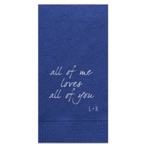 Zoom Show guides Loading product All of Me Loves All of You with Initials Napkin Square Cocktail Napkin Design ID: 457535 Click on swatch to see options Choose Your Product Color Active Color 3 ply 3 ply Top quality 3 ply. Dyed tissue. Sand Black Slate Platinum Platinum Pin Dot Dove Gray Dove Gray Borderless White White Borderless White Pin Dot White Scallop Ivory Ivory Borderless Mimosa Lemon Pin Dot Kiwi Kiwi Pin Dot Leaf Pin Dot Spruce Pin Dot Olive Pin Dot Light Navy Dark Turquoise Pin Dot Turquoise Powder Blue Pin Dot Lavender Lavender Pin Dot Purple Merlot Pin Dot Candy Pink Antique Pink Pin Dot Ballet Pink Ballet Pink Borderless Convertible Red Light Coral Merlot Out Until: 2025-12-22 Fuchsia Out Until: 2026-01-05 Linen Like* - Premium Product Linen Like* - Premium Product Absorbent. Dyed tissue. Airlaid. Premium pricing applies. Pebble Kraft Ash Grey Black Charcoal Stone Gray Metallic Silver Fog White Cream Buttercream Lemon Moss Green Hunter Green Pastel Green Lime Eucalyptus Dark Turquoise Bright Sky Powder Blue Navy Lavender Magenta Pink Pastel Pink Terracotta Peach Mango Metallic Copper Out Until: 2026-01-08 Brown Out Until: 2025-12-26 Ivory Out Until: 2026-01-02 Metallic Gold Out Until: 2025-12-24 Olive Green Out Until: 2025-12-26 Berry Out Until: 2025-12-28 Merlot Out Until: 2025-12-25 Lipstick Red Out Until: 2025-12-19 Crosshatch* - Premium Product Crosshatch* - Premium Product Absorbent. Printed tissue. Airlaid. Premium pricing applies. Crosshatch Black Crosshatch Gray Crosshatch Green Crosshatch Turquoise Crosshatch Violet Crosshatch Lipstick Red Crosshatch Stone Out Until: 2025-12-15 Crosshatch Key Lime Out Until: 2026-01-01 Crosshatch Navy Out Until: 2026-01-01 Crosshatch Fuchsia Out Until: 2025-12-27 Woven* - Premium Product Woven* - Premium Product Basketweave texture. Single-sided color. Premium pricing applies. Woven Sand Woven Copper Woven Black Woven Slate Woven Silver Woven Stone Woven Vanilla Woven White Woven Gold Woven Sage Woven Spruce Woven Powder Blue Woven Navy Woven Mauve Woven Convertible Red Woven Tumeric Patterned* - Premium Product Patterned* - Premium Product Exclusive FYP patterns. Single-sided color. Pindot embossed edge. Product pricing applies. Oak Wood Walnut Wood Ebony Wood Ash Wood Birch Wood Marble Sand Marble Gray Marble Navy Marble Taupe Marble Blush Ombre Black Ombre Navy Ombre Robin’s Egg Blue Ombre Rose Petal Ombre Coral Watercolor Sea Glass Watercolor Ocean Watercolor Nightfall Watercolor Sangria Watercolor Hibiscus Watercolor Rose Watercolor Sunrise Leaf Sand Leaf Fern Leaf Rain Leaf Rose Tie Dye Sunflower Tie Dye Leaf Tie Dye Turquoise Tie Dye Fuchsia Shimmer* - Premium Product Shimmer* - Premium Product Elegant European Stardream with iridescent finish. Single-sided color. Pindot embossed edge. Premium pricing applies. Champagne Soft Black Galvanized Silver Crystal White Ivory Pearl Gold Sage Navy Amethyst Herringbone* - Premium Product Herringbone* - Premium Product Absorbent. Printed Herringbone pattern. Airlaid. Premium pricing applies. Herringbone Vanilla Mocha Herringbone Gray Onyx Choose Your Imprint Foil Color Active Color Shiny Foil Shiny Foil Metallic, lustrous finish. *Specialty patterned foil may vary on final print Shiny Champagne Shiny Sterling Silver Shiny 18 Kt Gold Shiny Kiwi / Lime Shiny Leaf Shiny Jade Shiny Royal Blue Shiny Amethyst Shiny Fuchsia Shiny Rose Quartz Shiny Rose Gold NEW Shiny Merlot Shiny Convertible Red Shiny Poppy Shiny Copper *Shiny Holographic Gold *Shiny Holographic Silver *Shiny Rainbow Matte Foil Matte Foil Flat finish. Matte NEW Chocolate Matte Black Matte Slate Gray Matte Dove Grey Matte White Matte Ivory Matte Mimosa Yellow Matte Sunflower Matte Key Lime Matte Leaf Matte Spruce Matte Teal/Peacock Matte Azure Matte Royal Blue Matte Navy Matte Amethyst Matte Pastel Pink Matte Ballet Pink Matte Fuchsia Matte Lipstick Red Matte Merlot Matte Tangerine Satin Foil Satin Foil Muted sheen, brushed finish. Satin Sterling Silver Satin 18 Kt. Gold Satin Copper Penny Satin Fuchsia Satin Lipstick Red Satin Leaf Satin Teal / Peacock Satin French Blue Satin Plum Personalize Your Text Line 1 Personalize further with different fonts, graphics, positioning, and sizes. (Optional) Customize More Choose Your Quantity Subtotal PRICE INCLUDES: Select a Proof Option: Print As Is I confirm that I have reviewed my design and I understand it will be produced as shown and no proof will be provided. Digital Proof + $15 I would like an expert FYP designer to look at my design, make minor corrections if necessary, and send me a black and white proof before the order is produced. Orders delivered as soon as 12.19.2025. Exclusions apply. Share Your Design About This Design Personalized Light Navy Cocktail Napkin with Matte Dove Grey Foil will give your party the personalized touch every host desires. Product Details Product Details Classic 3-ply tissue, 4.75” or 5” square Colors vary Signature foil stamp included Bulk discounts available Expedited shipping options available. Product Description Product Description Classic Cocktail Napkins are the perfect companion for any event. Add a touch of refinement to your cocktail parties, weddings, or birthday celebrations. Whether you're sipping a Martini, Old Fashioned, or a signature cocktail, these beverage napkins are the perfect accompaniment to elevate your drink service to new heights.Traditionally designed with a classic pleated edge, highly absorbent, durable, crafted from high-quality, premium-grade paper, our Classic Cocktail Napkins are an excellent, timeless choice. They are soft to the touch, keeping your guests' hands dry and your furniture protected. Once used, simply discard them, making cleanup a breeze. Explore our Cocktail Napkins Collection to find the perfect option for your event. Due to the complexities of manufacturing, the size of the embossed border on our 3-ply napkins may vary slightly. These discrepancies are a natural part of the manufacturing p