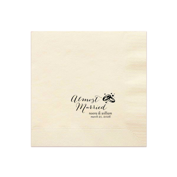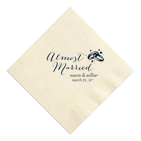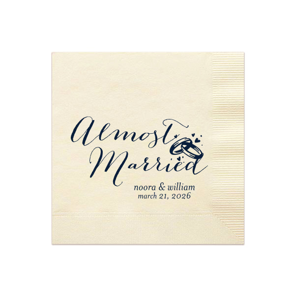 Zoom Show guides Loading product Almost Married Napkin Square Cocktail Napkin Design ID: 2385 Click on swatch to see options Choose Your Product Color Active Color 3 ply 3 ply Top quality 3 ply. Dyed tissue. Sand Black Slate Platinum Platinum Pin Dot Dove Gray Dove Gray Borderless White White Borderless White Pin Dot White Scallop Ivory Ivory Borderless Mimosa Lemon Pin Dot Kiwi Kiwi Pin Dot Leaf Pin Dot Spruce Pin Dot Olive Pin Dot Light Navy Dark Turquoise Pin Dot Turquoise Powder Blue Pin Dot Lavender Lavender Pin Dot Purple Merlot Pin Dot Candy Pink Antique Pink Pin Dot Ballet Pink Ballet Pink Borderless Convertible Red Light Coral Merlot Out Until: 2025-12-22 Fuchsia Out Until: 2026-01-05 Linen Like* - Premium Product Linen Like* - Premium Product Absorbent. Dyed tissue. Airlaid. Premium pricing applies. Pebble Kraft Ash Grey Black Charcoal Stone Gray Metallic Silver Fog White Cream Buttercream Lemon Moss Green Hunter Green Pastel Green Lime Eucalyptus Dark Turquoise Bright Sky Powder Blue Navy Lavender Magenta Pink Pastel Pink Terracotta Peach Mango Metallic Copper Out Until: 2026-01-08 Brown Out Until: 2025-12-26 Ivory Out Until: 2026-01-02 Metallic Gold Out Until: 2025-12-24 Olive Green Out Until: 2025-12-26 Berry Out Until: 2025-12-28 Merlot Out Until: 2025-12-25 Lipstick Red Out Until: 2025-12-19 Crosshatch* - Premium Product Crosshatch* - Premium Product Absorbent. Printed tissue. Airlaid. Premium pricing applies. Crosshatch Black Crosshatch Gray Crosshatch Green Crosshatch Turquoise Crosshatch Violet Crosshatch Lipstick Red Crosshatch Stone Out Until: 2026-01-15 Crosshatch Key Lime Out Until: 2026-01-01 Crosshatch Navy Out Until: 2026-01-01 Crosshatch Fuchsia Out Until: 2025-12-27 Woven* - Premium Product Woven* - Premium Product Basketweave texture. Single-sided color. Premium pricing applies. Woven Sand Woven Copper Woven Black Woven Slate Woven Silver Woven Stone Woven Vanilla Woven White Woven Gold Woven Sage Woven Spruce Woven Powder Blue Woven Navy Woven Mauve Woven Convertible Red Woven Tumeric Patterned* - Premium Product Patterned* - Premium Product Exclusive FYP patterns. Single-sided color. Pindot embossed edge. Product pricing applies. Oak Wood Walnut Wood Ebony Wood Ash Wood Birch Wood Marble Sand Marble Gray Marble Navy Marble Taupe Marble Blush Ombre Black Ombre Navy Ombre Robin’s Egg Blue Ombre Rose Petal Ombre Coral Watercolor Sea Glass Watercolor Ocean Watercolor Nightfall Watercolor Sangria Watercolor Hibiscus Watercolor Rose Watercolor Sunrise Leaf Sand Leaf Fern Leaf Rain Leaf Rose Tie Dye Sunflower Tie Dye Leaf Tie Dye Turquoise Tie Dye Fuchsia Shimmer* - Premium Product Shimmer* - Premium Product Elegant European Stardream with iridescent finish. Single-sided color. Pindot embossed edge. Premium pricing applies. Champagne Soft Black Galvanized Silver Crystal White Ivory Pearl Gold Sage Navy Amethyst Herringbone* - Premium Product Herringbone* - Premium Product Absorbent. Printed Herringbone pattern. Airlaid. Premium pricing applies. Herringbone Vanilla Mocha Herringbone Gray Onyx Choose Your Imprint Foil Color Active Color Shiny Foil Shiny Foil Metallic, lustrous finish. *Specialty patterned foil may vary on final print Shiny Champagne Shiny Sterling Silver Shiny 18 Kt Gold Shiny Kiwi / Lime Shiny Leaf Shiny Jade Shiny Royal Blue Shiny Amethyst Shiny Fuchsia Shiny Rose Quartz Shiny Rose Gold NEW Shiny Merlot Shiny Convertible Red Shiny Poppy Shiny Copper *Shiny Holographic Gold *Shiny Holographic Silver *Shiny Rainbow Matte Foil Matte Foil Flat finish. Matte NEW Chocolate Matte Black Matte Slate Gray Matte Dove Grey Matte White Matte Ivory Matte Mimosa Yellow Matte Sunflower Matte Key Lime Matte Leaf Matte Spruce Matte Teal/Peacock Matte Azure Matte Royal Blue Matte Navy Matte Amethyst Matte Pastel Pink Matte Ballet Pink Matte Fuchsia Matte Lipstick Red Matte Merlot Matte Tangerine Satin Foil Satin Foil Muted sheen, brushed finish. Satin Sterling Silver Satin 18 Kt. Gold Satin Copper Penny Satin Fuchsia Satin Lipstick Red Satin Leaf Satin Teal / Peacock Satin French Blue Satin Plum Personalize Your Text Line 3 Line 4 Personalize further with different fonts, graphics, positioning, and sizes. (Optional) Customize More Choose Your Quantity Subtotal PRICE INCLUDES: Select a Proof Option: Print As Is I confirm that I have reviewed my design and I understand it will be produced as shown and no proof will be provided. Digital Proof + $15 I would like an expert FYP designer to look at my design, make minor corrections if necessary, and send me a black and white proof before the order is produced. Orders delivered as soon as 12.22.2025. Exclusions apply. Share Your Design About This Design You're Almost Married! Add a sunny touch to the bar, dessert table or passed appetizers at your engagement party, couples shower or rehearsal dinner with this personalized napkin. Pair your names and date with our elegant calligraphy and Wedding Rings graphic for a detail guests will adore. Product Details Product Details Classic 3-ply tissue, 4.75” or 5” square Colors vary Signature foil stamp included Bulk discounts available Expedited shipping options available. Product Description Product Description Classic Cocktail Napkins are the perfect companion for any event. Add a touch of refinement to your cocktail parties, weddings, or birthday celebrations. Whether you're sipping a Martini, Old Fashioned, or a signature cocktail, these beverage napkins are the perfect accompaniment to elevate your drink service to new heights.Traditionally designed with a classic pleated edge, highly absorbent, durable, crafted from high-quality, premium-grade paper, our Classic Cocktail Napkins are an excellent, timeless choice. They are soft to the touch, keeping your guests' hands dry and your furniture protected. Once used, simply discard them, making cleanup a breeze. Explore our Cocktail Napkins Collection to find the perfect option for your event. Due to the complexities of manufac