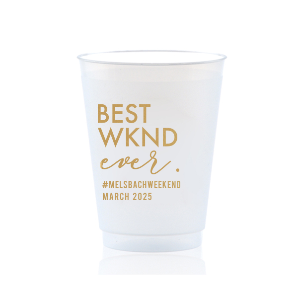 Zoom Show guides Loading product Best Weekend Cup 12-oz. Frosted Cup Design ID: 1057598 Click on swatch to see options Choose Your Screen Print Active Color Metallic Cup Ink Metallic Cup Ink Silver Ink Gold Ink Copper Ink Matte Cup Ink Matte Cup Ink Matte Chocolate Ink Matte Black Ink Matte Slate Gray Ink Matte White Ink Matte Sunflower Ink Matte Moss Green Ink Matte Sage Ink Matte Leaf Ink Matte Spruce Matte Teal/Peacock Ink Matte Sky Blue Ink Matte French Blue Ink Matte Royal Blue Ink Matte Navy Ink Matte Cobalt Ink Matte Lavender Ink Matte Ballet Pink Ink Matte Fuchsia Ink Matte Lipstick Red Ink Matte Merlot Ink Matte Tangerine Ink Personalize Your Text Line 1 Line 2 Personalize further with different fonts, graphics, positioning, and sizes. (Optional) Customize More Choose Your Quantity Subtotal PRICE INCLUDES: Select a Proof Option: Print As Is I confirm that I have reviewed my design and I understand it will be produced as shown and no proof will be provided. Digital Proof + $15 I would like an expert FYP designer to look at my design, make minor corrections if necessary, and send me a black and white proof before the order is produced. Orders delivered as soon as 11.05.2025. Exclusions apply. Share Your Design About This Design Our Best Weekend Cup will impress guests like no other. Make this party unforgettable. Product Details Product Details Minimum order of 50 Measures 4.25" tall and 3.25" wide at the top Holds 11.10 oz flush fill volume Perfect for mixed drinks and signature cocktails BPA-free and recyclable Shatterproof and top-rack dishwasher safe Bulk discounts available Expedited shipping options available. Product Description Product Description Frost flex cups from For Your Party are a perfect accessory for any event, from weddings to birthdays. Their translucent plastic complements any drink or color scheme, and can have any art you can imagine. They’re also reusable, so your guests can have a keepsake from your special day. Like our 10 oz. frost flex cups, our 12 oz. frost flex cups are made in the USA, BPA free, and can be hand-washed again and again to remember your event. Our 12 oz. size has the same shape as our 10 oz. size, and is perfect for when you want just a little more space. It has a flush fill volume of 11.1 oz. Product Options 12-oz. Frosted Cup 16-oz. Frosted Cup 24-oz. Frosted Cup Related Products 12-oz. Frosted Cup 16-oz. Frosted Cup 24-oz. Frosted Cup