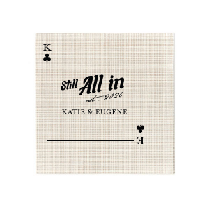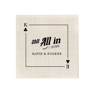 Zoom Show guides Loading product Clubs Playing Card Still All In Napkin Square Linen Like Cocktail Napkin Design ID: 2875243 Click on swatch to see options Choose Your Product Color Active Color Linen Like* - Premium Product Linen Like* - Premium Product Absorbent. Dyed tissue. Airlaid. Premium pricing applies. Pebble Kraft Ash Grey Brown Black Stone Gray Fog White Ivory Cream Olive Green Hunter Green Pastel Green Lime Eucalyptus Dark Turquoise Bright Sky Powder Blue Navy Lavender Magenta Pink Pastel Pink Lipstick Red Terracotta Peach Mango Metallic Silver Metallic Gold Metallic Copper Charcoal Out Until: 2026-05-23 Buttercream Out Until: 2026-05-24 Lemon Out Until: 2026-05-19 Moss Green Out Until: 2026-05-28 Berry Out Until: 2026-05-15 Merlot Crosshatch* - Premium Product Crosshatch* - Premium Product Absorbent. Printed tissue. Airlaid. Premium pricing applies. Crosshatch Black Crosshatch Gray Crosshatch Stone Crosshatch Key Lime Crosshatch Green Crosshatch Turquoise Crosshatch Navy Crosshatch Violet Crosshatch Fuchsia Crosshatch Lipstick Red Herringbone* - Premium Product Herringbone* - Premium Product Absorbent. Printed Herringbone pattern. Airlaid. Premium pricing applies. Herringbone Gray Onyx Herringbone Vanilla Mocha Out Until: 2026-05-22 Choose Your Imprint Foil Color Active Color Shiny Foil Shiny Foil Metallic, lustrous finish. *Specialty patterned foil may vary on final print Shiny Champagne Shiny Sterling Silver Shiny 18 Kt Gold Shiny Kiwi / Lime Shiny Leaf Shiny Spruce Shiny Jade Shiny Royal Blue Shiny Amethyst Shiny Fuchsia Shiny Rose Quartz Shiny Rose Gold NEW Shiny Merlot Shiny Convertible Red Shiny Poppy Shiny Copper *Shiny Holographic Gold *Shiny Holographic Silver *Shiny Rainbow Matte Foil Matte Foil Flat finish. Matte NEW Chocolate Matte Black Matte Slate Gray Matte Dove Grey Matte White Matte Ivory Matte Mimosa Yellow Matte Sunflower Matte Key Lime Matte Leaf Matte Teal/Peacock Matte Azure Matte Royal Blue Matte Navy Matte Amethyst Matte Pastel Pink Matte Ballet Pink Matte Fuchsia Matte Lipstick Red Matte Merlot Matte Tangerine Satin Foil Satin Foil Muted sheen, brushed finish. Satin Sterling Silver Satin 18 Kt. Gold Satin Copper Penny Satin Fuchsia Satin Lipstick Red Satin Leaf Satin Teal / Peacock Satin French Blue Satin Plum Personalize Your Text Line 1 Line 2 Line 3 Line 4 Personalize further with different fonts, graphics, positioning, and sizes. (Optional) Customize More Choose Your Quantity Subtotal PRICE INCLUDES: Select a Proof Option: Print As Is I confirm that I have reviewed my design and I understand it will be produced as shown and no proof will be provided. Digital Proof + $15 I would like an expert FYP designer to look at my design, make minor corrections if necessary, and send me a black and white proof before the order is produced. Orders delivered as soon as 05.12.2026. Exclusions apply. Share Your Design About This Design Showcase your winning partnership with the Clubs Playing Card Still All In Anniversary Napkin. The clubs playing card design, surrounding the bold affirmation "Still All In," is ready for customization with your initials, while the memorable year is gracefully scripted below. Complete this elegant tableau with the couple's name for a tailored touch to your anniversary festivities. Product Details Product Details Deluxe air laid paper Measures approximately 5" x 5" Signature foil stamp included Bulk discounts available Expedited shipping options available. Product Description Product Description Introducing our custom Linen-Like Cocktail Napkins, the epitome of elegance and refinement for your sophisticated gatherings. Whether you're hosting a formal wedding reception or a chic cocktail soirée, these linen cocktail napkins effortlessly complement any table setting. Their soft and gentle touch will leave a lasting impression on guests, showcasing your commitment to providing a truly upscale experience. Meticulously crafted, these napkins exude the luxurious look and feel of fine linen while offering the convenience of being disposable. Crafted from premium-quality materials, they are highly absorbent and the same dimensions as our classic cocktail napkins. With the perfect blend of functionality and elegance, you can elevate any upscale bar or lounge. Product Options Square Linen Like Cocktail Napkin Square Crosshatch Cocktail Napkin Square Cocktail Napkin Patterned Square Cocktail Napkin Woven Square Cocktail Napkin Square Petite Napkin Square Shimmer Cocktail Napkin Related Products Square Linen Like Cocktail Napkin Square Crosshatch Cocktail Napkin Square Cocktail Napkin Patterned Square Cocktail Napkin Woven Square Cocktail Napkin Square Petite Napkin Square Shimmer Cocktail Napkin