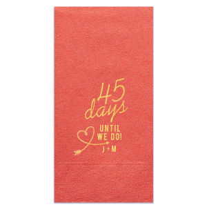 Zoom Show guides Loading product Days Until We Do Initial Napkin Patterned Square Cocktail Napkin Design ID: 691214 Click on swatch to see options Choose Your Product Color Active Color Patterned* - Premium Product Patterned* - Premium Product Exclusive FYP patterns. Single-sided color. Pindot embossed edge. Product pricing applies. Oak Wood Walnut Wood Ebony Wood Ash Wood Birch Wood Marble Sand Marble Gray Marble Navy Marble Taupe Marble Blush Ombre Black Ombre Navy Ombre Robin’s Egg Blue Ombre Rose Petal Ombre Coral Watercolor Sea Glass Watercolor Ocean Watercolor Nightfall Watercolor Sangria Watercolor Hibiscus Watercolor Rose Watercolor Sunrise Leaf Sand Leaf Fern Leaf Rain Leaf Rose Tie Dye Sunflower Tie Dye Leaf Tie Dye Turquoise Tie Dye Fuchsia Choose Your Imprint Foil Color Active Color Shiny Foil Shiny Foil Metallic, lustrous finish. *Specialty patterned foil may vary on final print Shiny Champagne Shiny Sterling Silver Shiny 18 Kt Gold Shiny Kiwi / Lime Shiny Leaf Shiny Jade Shiny Royal Blue Shiny Amethyst Shiny Fuchsia Shiny Rose Quartz Shiny Rose Gold NEW Shiny Merlot Shiny Convertible Red Shiny Poppy Shiny Copper *Shiny Holographic Gold *Shiny Holographic Silver *Shiny Rainbow Matte Foil Matte Foil Flat finish. Matte NEW Chocolate Matte Black Matte Slate Gray Matte Dove Grey Matte White Matte Ivory Matte Mimosa Yellow Matte Sunflower Matte Key Lime Matte Leaf Matte Spruce Matte Teal/Peacock Matte Azure Matte Royal Blue Matte Navy Matte Amethyst Matte Pastel Pink Matte Ballet Pink Matte Fuchsia Matte Lipstick Red Matte Merlot Matte Tangerine Satin Foil Satin Foil Muted sheen, brushed finish. Satin Sterling Silver Satin 18 Kt. Gold Satin Copper Penny Satin Fuchsia Satin Lipstick Red Satin Leaf Satin Teal / Peacock Satin French Blue Satin Plum Personalize Your Text Line 1 Line 2 Line 3 Personalize further with different fonts, graphics, positioning, and sizes. (Optional) Customize More Choose Your Quantity Subtotal PRICE INCLUDES: Select a Proof Option: Print As Is I confirm that I have reviewed my design and I understand it will be produced as shown and no proof will be provided. Digital Proof + $15 I would like an expert FYP designer to look at my design, make minor corrections if necessary, and send me a black and white proof before the order is produced. Orders delivered as soon as 11.07.2025. Exclusions apply. Share Your Design About This Design Celebrate the countdown to "I do" with the Days Until We Do Initial Napkin. This design features a bold countdown number, a whimsical arrow-heart, and "UNTIL WE DO!" in vibrant lettering. Completed by the couple's initials joined by a plus sign, it's perfect for pre-wedding festivities and showers. Product Details Product Details Classic 3-ply tissue with pindot embossed edge Measures approximately 4.75" x 4.75" Signature foil stamp included Bulk discounts available Expedited shipping options available. Product Description Product Description Our Patterned Cocktail Napkins showcase a variety of captivating designs that suit different themes and aesthetics. They feature eye-catching patterns that effortlessly elevate the visual appeal of your table setting. Whether you're hosting a formal dinner party, a casual get-together, or a themed event, our Patterned Cocktail Napkins complement any occasion. Their versatility and visual impact allow you to create a memorable atmosphere that reflects your unique taste and style. Embrace the beauty of these intricately patterned napkins and create an ambiance that exudes fun and sophistication. Product Options Patterned Square Cocktail Napkin Square Luncheon Napkin Paper Guest Towel Square Shimmer Luncheon Napkin Square Linen Like Luncheon Napkin Square Cocktail Napkin Related Products Patterned Square Cocktail Napkin Square Luncheon Napkin Paper Guest Towel Square Shimmer Luncheon Napkin Square Linen Like Luncheon Napkin Square Cocktail Napkin