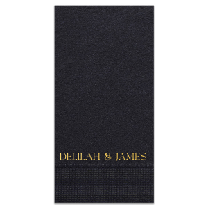 Zoom Show guides Loading product Deluxe Couples Name Napkin Square Linen Like Dinner Napkin Design ID: 3628753 Click on swatch to see options Choose Your Product Color Active Color Linen Like* - Premium Product Linen Like* - Premium Product Absorbent. Dyed tissue. Airlaid. Premium pricing applies. Brown Black Stone Gray Fog White Ivory Cream Buttercream Lemon Moss Green Olive Green Hunter Green Pastel Green Lime Eucalyptus Dark Turquoise Bright Sky Powder Blue Navy Lavender Berry Merlot Magenta Pastel Pink Lipstick Red Terracotta Peach Metallic Silver Metallic Gold Metallic Copper Pebble Out Until: 2026-04-17 Kraft Out Until: 2026-05-05 Ash Grey Out Until: 2026-04-17 Plum Out Until: 2026-05-02 Choose Your Imprint Foil Color Active Color Shiny Foil Shiny Foil Metallic, lustrous finish. *Specialty patterned foil may vary on final print Shiny Champagne Shiny Sterling Silver Shiny 18 Kt Gold Shiny Kiwi / Lime Shiny Leaf Shiny Spruce Shiny Jade Shiny Royal Blue Shiny Amethyst Shiny Fuchsia Shiny Rose Quartz Shiny Rose Gold NEW Shiny Merlot Shiny Convertible Red Shiny Poppy Shiny Copper *Shiny Holographic Gold *Shiny Holographic Silver *Shiny Rainbow Matte Foil Matte Foil Flat finish. Matte NEW Chocolate Matte Black Matte Slate Gray Matte Dove Grey Matte White Matte Ivory Matte Mimosa Yellow Matte Sunflower Matte Key Lime Matte Leaf Matte Teal/Peacock Matte Azure Matte Royal Blue Matte Navy Matte Amethyst Matte Pastel Pink Matte Ballet Pink Matte Fuchsia Matte Lipstick Red Matte Merlot Matte Tangerine Satin Foil Satin Foil Muted sheen, brushed finish. Satin Sterling Silver Satin 18 Kt. Gold Satin Copper Penny Satin Fuchsia Satin Lipstick Red Satin Leaf Satin Teal / Peacock Satin French Blue Satin Plum Personalize Your Text Line 1 Personalize further with different fonts, graphics, positioning, and sizes. (Optional) Customize More Choose Your Quantity Subtotal PRICE INCLUDES: Select a Proof Option: Print As Is I confirm that I have reviewed my design and I understand it will be produced as shown and no proof will be provided. Digital Proof + $15 I would like an expert FYP designer to look at my design, make minor corrections if necessary, and send me a black and white proof before the order is produced. Orders delivered as soon as 05.01.2026. Exclusions apply. Share Your Design About This Design Bring an air of elegance to your next party event with the Deluxe Couples Name Napkin. Customize the text with your choice of color and napkin style to elevate your function to the next level. The napkin design is perfect for momentous weddings, important anniversaries or even cozy home entertainment. Product Details Product Details Deluxe air laid paper Signature foil stamp included Bulk discounts available Expedited shipping options available. Product Description Product Description Introducing our Linen-Like Dinner Napkins, the epitome of sophistication and refinement for your dining occasions. Whether you're hosting a formal dinner party, an intimate family gathering, or a festive holiday feast, these are the perfect choice. Their soft and gentle touch will leave a lasting impression on your guests, showcasing your commitment to upscale dining experiences. They provide the look and feel of fine linen while offering the convenience of disposability. The generous size of our Linen-Like Dinner Napkins provides ample coverage. Whether it's spills, crumbs, or messy dishes, these napkins will efficiently handle any dining mishaps. Product Options Square Linen Like Dinner Napkin Square Linen Like Luncheon Napkin Square Linen Like Cocktail Napkin Square Cocktail Napkin Square Luncheon Napkin Square Dinner Napkin Linen Like Guest Towel Guest Towel Square Petite Napkin Related Products Square Linen Like Dinner Napkin Square Linen Like Luncheon Napkin Square Linen Like Cocktail Napkin Square Cocktail Napkin Square Luncheon Napkin Square Dinner Napkin Linen Like Guest Towel Guest Towel Square Petite Napkin
