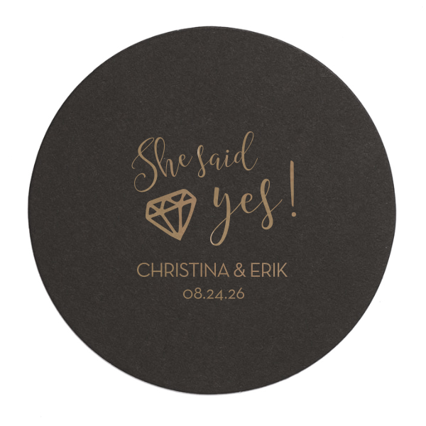 Zoom Show guides Loading product Diamond Yes Coaster Diamond 4" Coaster Design ID: 144723 Click on swatch to see options Choose Your Product Color Active Color Coaster Colors Coaster Colors Black White Eggshell Choose Your Imprint Foil Color Active Color Shiny Foil Shiny Foil Metallic, lustrous finish. *Specialty patterned foil may vary on final print Shiny Champagne Shiny Sterling Silver Shiny 18 Kt Gold Shiny Kiwi / Lime Shiny Leaf Shiny Jade Shiny Royal Blue Shiny Amethyst Shiny Fuchsia Shiny Rose Quartz Shiny Rose Gold NEW Shiny Merlot Shiny Convertible Red Shiny Poppy Shiny Copper *Shiny Holographic Gold *Shiny Holographic Silver *Shiny Rainbow Matte Foil Matte Foil Flat finish. Matte NEW Chocolate Matte Black Matte Slate Gray Matte Dove Grey Matte White Matte Ivory Matte Mimosa Yellow Matte Sunflower Matte Key Lime Matte Leaf Matte Spruce Matte Teal/Peacock Matte Azure Matte Royal Blue Matte Navy Matte Amethyst Matte Pastel Pink Matte Ballet Pink Matte Fuchsia Matte Lipstick Red Matte Merlot Matte Tangerine Satin Foil Satin Foil Muted sheen, brushed finish. Satin Sterling Silver Satin 18 Kt. Gold Satin Copper Penny Satin Fuchsia Satin Lipstick Red Satin Leaf Satin Teal / Peacock Satin French Blue Satin Plum Personalize Your Text Line 1 Line 2 Personalize further with different fonts, graphics, positioning, and sizes. (Optional) Customize More Choose Your Quantity Subtotal PRICE INCLUDES: Select a Proof Option: Print As Is I confirm that I have reviewed my design and I understand it will be produced as shown and no proof will be provided. Digital Proof + $15 I would like an expert FYP designer to look at my design, make minor corrections if necessary, and send me a black and white proof before the order is produced. Orders delivered as soon as 12.16.2025. Exclusions apply. Share Your Design About This Design ForYourParty's elegant White Square Coaster with Shiny Champagne Foil has a Diamond graphic and is good for use in Wedding, Bridal Shower themed parties and can be customized to complement every last detail of your party. Product Details Product Details Minimum order of 50 Measures 4" square Made from reusable uncoated pulp board Bulk discounts available Expedited shipping options available. Product Description Product Description Custom Square Coasters are the perfect choice to elevate your event's ambiance while protecting your surfaces in style. These customizable coasters are a versatile addition to weddings, anniversary parties, cocktail soirées, and more. They not only shield your furniture but also serve as chic décor pieces that impress your guests. Crafted from pulp board, our Square Coasters exude premium quality, featuring a smooth texture that adds a touch of elegance to any setting and are made for multiple uses. Their square shape provides ample space for glasses and mugs of all sizes, ensuring convenience during your event. Personalize these coasters with your unique design or event details, making them a memorable keepsake for your guests. Explore our other barware. Product Options Diamond 4" Coaster Round Coaster Related Products Diamond 4" Coaster Round Coaster Material Pulp Board