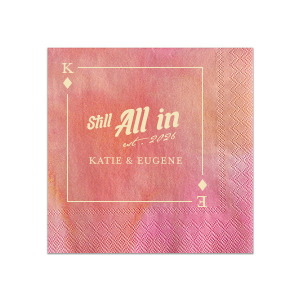 Zoom Show guides Loading product Diamonds Playing Card Still All In Napkin Square Linen Like Cocktail Napkin Design ID: 2875280 Click on swatch to see options Choose Your Product Color Active Color Linen Like* - Premium Product Linen Like* - Premium Product Absorbent. Dyed tissue. Airlaid. Premium pricing applies. Pebble Kraft Ash Grey Brown Black Stone Gray Fog White Ivory Cream Olive Green Hunter Green Pastel Green Lime Eucalyptus Dark Turquoise Bright Sky Powder Blue Navy Lavender Magenta Pink Pastel Pink Lipstick Red Terracotta Peach Mango Metallic Silver Metallic Gold Metallic Copper Charcoal Out Until: 2026-05-23 Buttercream Out Until: 2026-05-24 Lemon Out Until: 2026-05-19 Moss Green Out Until: 2026-05-28 Berry Out Until: 2026-05-15 Merlot Crosshatch* - Premium Product Crosshatch* - Premium Product Absorbent. Printed tissue. Airlaid. Premium pricing applies. Crosshatch Black Crosshatch Gray Crosshatch Stone Crosshatch Key Lime Crosshatch Green Crosshatch Turquoise Crosshatch Navy Crosshatch Violet Crosshatch Fuchsia Crosshatch Lipstick Red Herringbone* - Premium Product Herringbone* - Premium Product Absorbent. Printed Herringbone pattern. Airlaid. Premium pricing applies. Herringbone Gray Onyx Herringbone Vanilla Mocha Out Until: 2026-05-22 Choose Your Imprint Foil Color Active Color Shiny Foil Shiny Foil Metallic, lustrous finish. *Specialty patterned foil may vary on final print Shiny Champagne Shiny Sterling Silver Shiny 18 Kt Gold Shiny Kiwi / Lime Shiny Leaf Shiny Spruce Shiny Jade Shiny Royal Blue Shiny Amethyst Shiny Fuchsia Shiny Rose Quartz Shiny Rose Gold NEW Shiny Merlot Shiny Convertible Red Shiny Poppy Shiny Copper *Shiny Holographic Gold *Shiny Holographic Silver *Shiny Rainbow Matte Foil Matte Foil Flat finish. Matte NEW Chocolate Matte Black Matte Slate Gray Matte Dove Grey Matte White Matte Ivory Matte Mimosa Yellow Matte Sunflower Matte Key Lime Matte Leaf Matte Teal/Peacock Matte Azure Matte Royal Blue Matte Navy Matte Amethyst Matte Pastel Pink Matte Ballet Pink Matte Fuchsia Matte Lipstick Red Matte Merlot Matte Tangerine Satin Foil Satin Foil Muted sheen, brushed finish. Satin Sterling Silver Satin 18 Kt. Gold Satin Copper Penny Satin Fuchsia Satin Lipstick Red Satin Leaf Satin Teal / Peacock Satin French Blue Satin Plum Personalize Your Text Line 1 Line 2 Line 3 Line 4 Personalize further with different fonts, graphics, positioning, and sizes. (Optional) Customize More Choose Your Quantity Subtotal PRICE INCLUDES: Select a Proof Option: Print As Is I confirm that I have reviewed my design and I understand it will be produced as shown and no proof will be provided. Digital Proof + $15 I would like an expert FYP designer to look at my design, make minor corrections if necessary, and send me a black and white proof before the order is produced. Orders delivered as soon as 05.12.2026. Exclusions apply. Share Your Design About This Design Celebrate the luster of your lasting love with the Diamonds Playing Card Still All In Anniversary Napkin. Encased within the diamond suit, your initials take center stage, complemented by the bold "Still All In" phrase, the treasured year in script, and the couple's name below. A timeless keepsake for your cherished anniversary festivity. Product Details Product Details Deluxe air laid paper Measures approximately 5" x 5" Signature foil stamp included Bulk discounts available Expedited shipping options available. Product Description Product Description Introducing our custom Linen-Like Cocktail Napkins, the epitome of elegance and refinement for your sophisticated gatherings. Whether you're hosting a formal wedding reception or a chic cocktail soirée, these linen cocktail napkins effortlessly complement any table setting. Their soft and gentle touch will leave a lasting impression on guests, showcasing your commitment to providing a truly upscale experience. Meticulously crafted, these napkins exude the luxurious look and feel of fine linen while offering the convenience of being disposable. Crafted from premium-quality materials, they are highly absorbent and the same dimensions as our classic cocktail napkins. With the perfect blend of functionality and elegance, you can elevate any upscale bar or lounge. Product Options Square Linen Like Cocktail Napkin Square Crosshatch Cocktail Napkin Square Cocktail Napkin Patterned Square Cocktail Napkin Woven Square Cocktail Napkin Square Shimmer Cocktail Napkin Related Products Square Linen Like Cocktail Napkin Square Crosshatch Cocktail Napkin Square Cocktail Napkin Patterned Square Cocktail Napkin Woven Square Cocktail Napkin Square Shimmer Cocktail Napkin