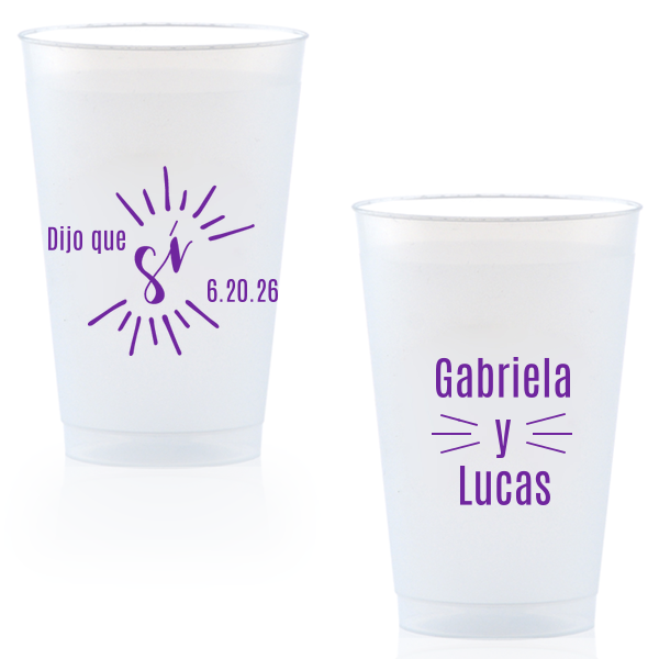 Zoom Show guides Loading product Dijo Que Sí Cup 9-oz. Frosted Cup Design ID: 3223 Click on swatch to see options Choose Your Screen Print Active Color Metallic Cup Ink Metallic Cup Ink Silver Ink Gold Ink Copper Ink Matte Cup Ink Matte Cup Ink Matte Chocolate Ink Matte Black Ink Matte Slate Gray Ink Matte White Ink Matte Sunflower Ink Matte Moss Green Ink Matte Sage Ink Matte Leaf Ink Matte Spruce Matte Teal/Peacock Ink Matte Sky Blue Ink Matte French Blue Ink Matte Royal Blue Ink Matte Navy Ink Matte Cobalt Ink Matte Lavender Ink Matte Ballet Pink Ink Matte Fuchsia Ink Matte Lipstick Red Ink Matte Merlot Ink Matte Tangerine Ink Personalize Your Text Front - Line 1 Front - Line 2 Back - Line 1 Back - Line 2 Back - Line 3 Personalize further with different fonts, graphics, positioning, and sizes. (Optional) Customize More Choose Your Quantity Subtotal PRICE INCLUDES: Select a Proof Option: Print As Is I confirm that I have reviewed my design and I understand it will be produced as shown and no proof will be provided. Digital Proof + $15 I would like an expert FYP designer to look at my design, make minor corrections if necessary, and send me a black and white proof before the order is produced. Orders delivered as soon as 12.22.2025. Exclusions apply. Share Your Design About This Design "Cheers to love with the Dijo Que Sí Cup , where 'Sí' beams brightly, symbolizing joyful affirmation. 'Y' artistically unites the couple's names, each side radiating with the warmth and vibrancy of a love celebrated in any language." Product Details Product Details Minimum order of 50 Measures 2.75" tall and 3.4" wide at the top Holds 8.7 oz flush fill volume Ideal for wine and spirits on the rocks BPA-free and recyclable Shatterproof and top-rack dishwasher safe Bulk discounts available Expedited shipping options available. Product Description Product Description Custom printed frost flex cups from For Your Party are a classic standby for any event, from weddings to birthdays. Their translucent plastic complements any drink or decor, and are reusable, so your guests can have a keepsake from your special day. Like our 5 oz. frost flex cups, our 9 oz. frost flex cups are made in the USA, BPA free, and can be hand-washed again and again to remember your event. Our 9 oz. size is a little wider, great for wine or drinks on the rocks, and has a flush fill volume of 8.7 oz. Product Options 9-oz. Frosted Cup 10-oz.Frosted Cup 12-oz. Frosted Cup 14-oz.Frosted Cup 16-oz. Frosted Cup 24-oz. Frosted Cup Related Products 9-oz. Frosted Cup 10-oz.Frosted Cup 12-oz. Frosted Cup 14-oz.Frosted Cup 16-oz. Frosted Cup 24-oz. Frosted Cup