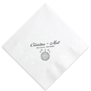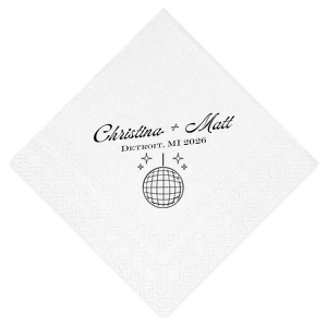 Zoom Show guides Loading product Disco Sparkle Wedding Napkin Diamond Extra Large Dinner Napkin Design ID: 2778241 Click on swatch to see options Choose Your Napkin Color Active Color Linen Like* - Premium Product Linen Like* - Premium Product Absorbent. Dyed tissue. Airlaid. Premium pricing applies. Black White Lipstick Red Choose Your Imprint Foil Color Active Color Shiny Foil Shiny Foil Metallic, lustrous finish. *Specialty patterned foil may vary on final print Shiny Champagne Shiny Sterling Silver Shiny 18 Kt Gold Shiny Kiwi / Lime Shiny Leaf Shiny Spruce Shiny Jade Shiny Royal Blue Shiny Amethyst Shiny Fuchsia Shiny Rose Quartz Shiny Rose Gold NEW Shiny Merlot Shiny Convertible Red Shiny Poppy Shiny Copper *Shiny Holographic Gold *Shiny Holographic Silver *Shiny Rainbow Matte Foil Matte Foil Flat finish. Matte NEW Chocolate Matte Black Matte Slate Gray Matte Dove Grey Matte White Matte Ivory Matte Mimosa Yellow Matte Sunflower Matte Key Lime Matte Leaf Matte Teal/Peacock Matte Azure Matte Royal Blue Matte Navy Matte Amethyst Matte Pastel Pink Matte Ballet Pink Matte Fuchsia Matte Lipstick Red Matte Merlot Matte Tangerine Satin Foil Satin Foil Muted sheen, brushed finish. Satin Sterling Silver Satin 18 Kt. Gold Satin Copper Penny Satin Fuchsia Satin Lipstick Red Satin Leaf Satin Teal / Peacock Satin French Blue Satin Plum Personalize Your Text Line 1 Line 2 Personalize further with different fonts, graphics, positioning, and sizes. (Optional) Customize More Choose Your Quantity Subtotal PRICE INCLUDES: Select a Proof Option: Print As Is I confirm that I have reviewed my design and I understand it will be produced as shown and no proof will be provided. Digital Proof + $15 I would like an expert FYP designer to look at my design, make minor corrections if necessary, and send me a black and white proof before the order is produced. Orders delivered as soon as 05.01.2026. Exclusions apply. Share Your Design About This Design Dance the night away with the Disco Sparkle Wedding Napkin, personalized with the couple's names, year, and wedding location, all set against a backdrop of a dazzling disco ball and sparkles. An unforgettable accent for your celebratory soiree. Product Details Product Details Deluxe air laid paper Measures approximately 9.5" x 9.25" Signature foil stamp included Bulk discounts available Expedited shipping options available. Product Description Product Description Introducing our largest napkin, the Extra Large Linen-Like Dinner Napkins, the epitome of elegance and luxury for your grand dining occasions. Whether you're hosting a grand banquet, an extravagant wedding reception, or a lavish holiday feast, our Extra Large Linen-Like Dinner Napkins elevate the ambiance of any dining experience.The soft and sumptuous touch of these napkins will impress your guests, showcasing your commitment to providing a truly upscale dining experience while still showcasing your design beautifully across its large portions. They also provide generous coverage, making them perfect for larger plates and for creating an impressive table presentation. Product Options Diamond Linen Like Cocktail Napkin Diamond Linen Like Dinner Napkin Diamond Bottom Scalloped Luncheon Napkin Diamond Extra Large Dinner Napkin Diamond Petite Napkin Diamond Dinner Napkin Woven Diamond Cocktail Napkin Patterned Diamond Cocktail Napkin Diamond Shimmer Luncheon Napkin Diamond Cocktail Napkin Related Products Diamond Linen Like Cocktail Napkin Diamond Linen Like Dinner Napkin Diamond Bottom Scalloped Luncheon Napkin Diamond Extra Large Dinner Napkin Diamond Petite Napkin Diamond Dinner Napkin Woven Diamond Cocktail Napkin Patterned Diamond Cocktail Napkin Diamond Shimmer Luncheon Napkin Diamond Cocktail Napkin