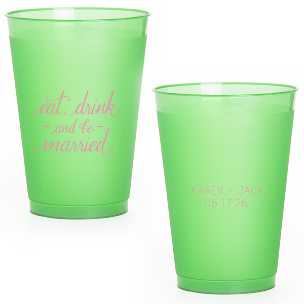 Zoom Show guides Loading product Eat, Drink And Be Married Cup 9-oz. Frosted Cup Design ID: 73198 Click on swatch to see options Choose Your Screen Print Active Color Metallic Cup Ink Metallic Cup Ink Silver Ink Gold Ink Copper Ink Matte Cup Ink Matte Cup Ink Matte Chocolate Ink Matte Black Ink Matte Slate Gray Ink Matte White Ink Matte Sunflower Ink Matte Moss Green Ink Matte Sage Ink Matte Leaf Ink Matte Spruce Matte Teal/Peacock Ink Matte Sky Blue Ink Matte French Blue Ink Matte Royal Blue Ink Matte Navy Ink Matte Cobalt Ink Matte Lavender Ink Matte Ballet Pink Ink Matte Fuchsia Ink Matte Lipstick Red Ink Matte Merlot Ink Matte Tangerine Ink Personalize Your Text Line 1 - Back Line 2 - Back Personalize further with different fonts, graphics, positioning, and sizes. (Optional) Customize More Choose Your Quantity Subtotal PRICE INCLUDES: Select a Proof Option: Print As Is I confirm that I have reviewed my design and I understand it will be produced as shown and no proof will be provided. Digital Proof + $15 I would like an expert FYP designer to look at my design, make minor corrections if necessary, and send me a black and white proof before the order is produced. Orders delivered as soon as 01.09.2026. Exclusions apply. Share Your Design About This Design Toast to wedded bliss with the Eat, Drink and Be Married Cup, where a gentle cascade of words invites a night of celebration. The couple's names and wedding date on the reverse side add a personal seal to this jubilant toast. Product Details Product Details Minimum order of 50 Measures 2.75" tall and 3.4" wide at the top Holds 8.7 oz flush fill volume Ideal for wine and spirits on the rocks BPA-free and recyclable Shatterproof and top-rack dishwasher safe Bulk discounts available Expedited shipping options available. Product Description Product Description Custom printed frost flex cups from For Your Party are a classic standby for any event, from weddings to birthdays. Their translucent plastic complements any drink or decor, and are reusable, so your guests can have a keepsake from your special day. Like our 5 oz. frost flex cups, our 9 oz. frost flex cups are made in the USA, BPA free, and can be hand-washed again and again to remember your event. Our 9 oz. size is a little wider, great for wine or drinks on the rocks, and has a flush fill volume of 8.7 oz. Product Options 9-oz. Frosted Cup 10-oz.Frosted Cup 12-oz. Frosted Cup 12oz Frost Flex Color 14-oz.Frosted Cup 16-oz. Frosted Cup 16oz Frost Flex Color 24-oz. Frosted Cup Related Products 9-oz. Frosted Cup 10-oz.Frosted Cup 12-oz. Frosted Cup 12oz Frost Flex Color 14-oz.Frosted Cup 16-oz. Frosted Cup 16oz Frost Flex Color 24-oz. Frosted Cup