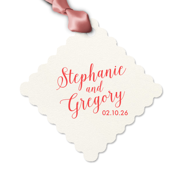 Zoom Show guides Loading product Elegant Script Names Letterpress Gift Tag Diamond Gift Tag Design ID: 2143199 Click on swatch to see options Choose Your Paper Color Active Color Natural Natural Smooth, matte finish. Double-sided color. 100lb+ cover stock. Natural NEW Frost White Natural Ivory Choose Your Letterpress Inks Active Color Letterpress Inks Letterpress Inks Platinum Black Hot Pink Chocolate Ivy Mint Violet Slate Mint Light Coral Lipstick Red Navy Liberty Blue Teal/Peacock Mustard Gold Choose Your Ribbon Color Active Color Ribbons - Additional Charge Ribbons - Additional Charge Champagne Copper Brownie Black Slate Sterling Silver White Ivory Pearl Gold Mimosa Sunflower Forest Olive Pistachio Green Tea Peacock Robin’s Egg Blue Turquoise Dark Turquoise Navy Royal Blue Glacier Blue Sky Blue Lavender Violet Amethyst Cranberry Merlot Plum Candy Pink Ballet Pink Rose Petal Brick Convertible Red None Espresso Out Until: 2026-01-05 Gold Out Until: 2026-01-07 Kiwi Out Until: 2026-01-04 Leaf Out Until: 2025-12-24 Fuchsia Out Until: 2026-01-06 Tangerine Out Until: 2026-01-06 Personalize Your Text Line 1 Line 2 Line 3 Personalize further with different fonts, graphics, positioning, and sizes. (Optional) Customize More Choose Your Quantity Subtotal PRICE INCLUDES: Select a Proof Option: Print As Is I confirm that I have reviewed my design and I understand it will be produced as shown and no proof will be provided. Digital Proof + $15 I would like an expert FYP designer to look at my design, make minor corrections if necessary, and send me a black and white proof before the order is produced. Orders delivered as soon as 01.07.2026. Exclusions apply. Share Your Design About This Design Add sophistication to your event with the personalized Elegant Script Names Letterpress Gift Tag. Ideal for luxurious weddings and other events. Product Details Product Details 25 minimum 2.75" w X 2.75" h Volume discounts Expedited options available Product Description Product Description Add a facet of brilliance to your celebrations with our Custom Letterpress Diamond Gift Tags, crafted to shimmer with uniqueness. Ideal for Christmas parties, luxurious weddings, diamond anniversaries, and sparkling soirees, these tags epitomize refinement. Demonstrating artisanal precision, each tag boasts the deeply textured and exquisite feel that only letterpress offers. Their diamond-shaped design not only ensures distinction but also promises lasting impressions. By integrating personal elegance with utility, these tags present shoppers with the dual advantage of customization and sophistication. Enhance your event's radiant theme with coordinating items from our custom gift bags collection. Product Options Diamond Gift Tag Large Scalloped Gift Tag Diamond Jewel Gift Tag Related Products Diamond Gift Tag Large Scalloped Gift Tag Diamond Jewel Gift Tag