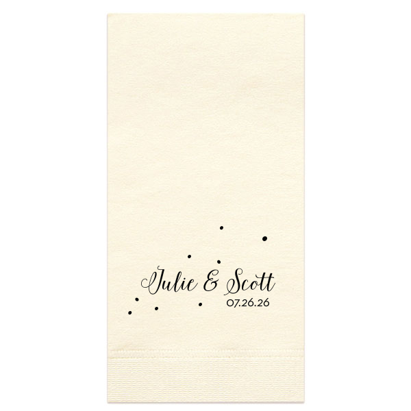 Zoom Show guides Loading product Fun Script Polka Dot Napkin Paper Guest Towel Design ID: 555910 Click on swatch to see options Choose Your Product Color Active Color 3 ply 3 ply Top quality 3 ply. Dyed tissue. Sand Bronze Black Slate Dove Gray Dove Gray Borderless White Ivory Ivory Borderless Mimosa Leaf Light Navy Sky Blue Lavender Purple Merlot Fuchsia Candy Pink Ballet Pink Ballet Pink Borderless Convertible Red Tangerine Platinum Out Until: 2026-01-05 White Borderless Out Until: 2025-12-24 Kiwi Out Until: 2026-01-02 Turquoise Out Until: 2025-12-14 Coral Linen Like* - Premium Product Linen Like* - Premium Product Absorbent. Dyed tissue. Airlaid. Premium pricing applies. Linen Like Black Linen Like Stone Gray Linen Like White Linen Like Ivory Linen Like Powder Blue Linen Like Navy Linen Like Pebble Out Until: 2026-01-16 Crosshatch* - Premium Product Crosshatch* - Premium Product Absorbent. Printed tissue. Airlaid. Premium pricing applies. Crosshatch Stone Shimmer* - Premium Product Shimmer* - Premium Product Elegant European Stardream with iridescent finish. Single-sided color. Pindot embossed edge. Premium pricing applies. Champagne Soft Black Galvanized Silver Crystal White Ivory Navy Amethyst Herringbone* - Premium Product Herringbone* - Premium Product Absorbent. Printed Herringbone pattern. Airlaid. Premium pricing applies. Herringbone Vanilla Mocha Herringbone Gray Onyx Choose Your Imprint Foil Color Active Color Shiny Foil Shiny Foil Metallic, lustrous finish. *Specialty patterned foil may vary on final print Shiny Champagne Shiny Sterling Silver Shiny 18 Kt Gold Shiny Kiwi / Lime Shiny Leaf Shiny Jade Shiny Royal Blue Shiny Amethyst Shiny Fuchsia Shiny Rose Quartz Shiny Rose Gold NEW Shiny Merlot Shiny Convertible Red Shiny Poppy Shiny Copper *Shiny Holographic Gold *Shiny Holographic Silver *Shiny Rainbow Matte Foil Matte Foil Flat finish. Matte NEW Chocolate Matte Black Matte Slate Gray Matte Dove Grey Matte White Matte Ivory Matte Mimosa Yellow Matte Sunflower Matte Key Lime Matte Leaf Matte Spruce Matte Teal/Peacock Matte Azure Matte Royal Blue Matte Navy Matte Amethyst Matte Pastel Pink Matte Ballet Pink Matte Fuchsia Matte Lipstick Red Matte Merlot Matte Tangerine Satin Foil Satin Foil Muted sheen, brushed finish. Satin Sterling Silver Satin 18 Kt. Gold Satin Copper Penny Satin Fuchsia Satin Lipstick Red Satin Leaf Satin Teal / Peacock Satin French Blue Satin Plum Personalize Your Text Line 1 Line 2 Personalize further with different fonts, graphics, positioning, and sizes. (Optional) Customize More Choose Your Quantity Subtotal PRICE INCLUDES: Select a Proof Option: Print As Is I confirm that I have reviewed my design and I understand it will be produced as shown and no proof will be provided. Digital Proof + $15 I would like an expert FYP designer to look at my design, make minor corrections if necessary, and send me a black and white proof before the order is produced. Orders delivered as soon as 12.19.2025. Exclusions apply. Share Your Design About This Design Our custom Ivory Guest Towel with Matte Black Foil can be personalized to match your party's exact theme and tempo. Product Details Product Details Classic 3-ply tissue Measures approximately 4.25" x 8.5" Signature foil stamp included Bulk discounts available Expedited shipping options available. Product Description Product Description Our Classic Guest Hand Towels are the perfect detail for your bathroom or kitchen. They work great with a simple design for entertaining at home, but they can also be dressed up for weddings, showers, and more! The same material as our classic cocktail napkins, our Classic Guest Hand Towels are sized so that you only need one to dry your hands. Having these in your bathroom or kitchen is a surefire way to elevate your home decor game! Note that large areas of solid printing can occasionally bleed color. Product Options Paper Guest Towel Square Cocktail Napkin Square Luncheon Napkin Related Products Paper Guest Towel Square Cocktail Napkin Square Luncheon Napkin