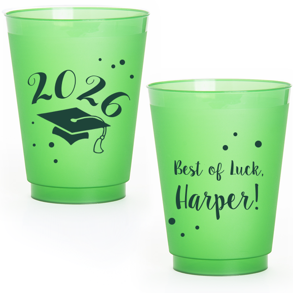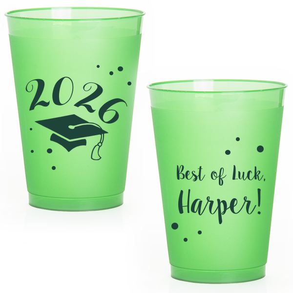 Zoom Show guides Loading product Good Luck Grad Cup 16-oz. Frosted Cup Design ID: 5657 Click on swatch to see options Choose Your Screen Print Active Color Metallic Cup Ink Metallic Cup Ink Silver Ink Gold Ink Copper Ink Matte Cup Ink Matte Cup Ink Matte Chocolate Ink Matte Black Ink Matte Slate Gray Ink Matte White Ink Matte Sunflower Ink Matte Moss Green Ink Matte Sage Ink Matte Leaf Ink Matte Spruce Matte Teal/Peacock Ink Matte Sky Blue Ink Matte French Blue Ink Matte Royal Blue Ink Matte Navy Ink Matte Cobalt Ink Matte Lavender Ink Matte Ballet Pink Ink Matte Fuchsia Ink Matte Lipstick Red Ink Matte Merlot Ink Matte Tangerine Ink Personalize Your Text Front - Line 1 Back - Line 2 Personalize further with different fonts, graphics, positioning, and sizes. (Optional) Customize More Choose Your Quantity Subtotal PRICE INCLUDES: Select a Proof Option: Print As Is I confirm that I have reviewed my design and I understand it will be produced as shown and no proof will be provided. Digital Proof + $15 I would like an expert FYP designer to look at my design, make minor corrections if necessary, and send me a black and white proof before the order is produced. Orders delivered as soon as 12.19.2025. Exclusions apply. Share Your Design About This Design Celebrate commencement with the Good Luck Grad Cup, featuring a soaring graduation cap against a shower of confetti. 'Best of Luck' wishes on the back, alongside the graduate's name, toast to future endeavors with exuberant cheer. Product Details Product Details Minimum order of 50 Measures 4.5" tall and 3.5" wide at the top Holds 15.1 oz flush fill volume Ideal for beer BPA-free and recyclable Shatterproof and top-rack dishwasher safe Bulk discounts available Expedited shipping options available. Product Description Product Description Frost flex cups from For Your Party are a perfect accent to any event, from weddings to birthdays. Their translucent plastic complements any drink or color scheme, and can have any art you can imagine. They’re also reusable, so your guests can have a keepsake from your special day. Like our 14 oz. frost flex cups , our 16 oz. frost flex cups are made in the USA, BPA free, and can be hand-washed again and again to remember your event. Our 16 oz. size is perfect for beer or signature cocktails, and has a flush fill volume of 15.1 oz. Product Options 16-oz. Frosted Cup 14-oz.Frosted Cup 12-oz. Frosted Cup 12oz Frost Flex Color 16oz Frost Flex Color 24-oz. Frosted Cup Related Products 16-oz. Frosted Cup 14-oz.Frosted Cup 12-oz. Frosted Cup 12oz Frost Flex Color 16oz Frost Flex Color 24-oz. Frosted Cup