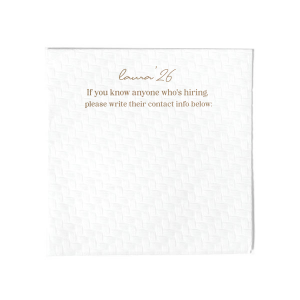 Zoom Show guides Loading product Graduation Soiree Career Connect Napkin Square Linen Like Luncheon Napkin Design ID: 2846462 Click on swatch to see options Choose Your Product Color Active Color Linen Like* - Premium Product Linen Like* - Premium Product Absorbent. Dyed tissue. Airlaid. Premium pricing applies. Kraft Black Fog White Olive Green Bright Sky Merlot Out Until: 2025-11-21 Choose Your Imprint Foil Color Active Color Shiny Foil Shiny Foil Metallic, lustrous finish. *Specialty patterned foil may vary on final print Shiny Champagne Shiny Sterling Silver Shiny 18 Kt Gold Shiny Kiwi / Lime Shiny Leaf Shiny Jade Shiny Royal Blue Shiny Amethyst Shiny Fuchsia Shiny Rose Quartz Shiny Rose Gold NEW Shiny Merlot Shiny Convertible Red Shiny Poppy Shiny Copper *Shiny Holographic Gold *Shiny Holographic Silver *Shiny Rainbow Matte Foil Matte Foil Flat finish. Matte NEW Chocolate Matte Black Matte Slate Gray Matte Dove Grey Matte White Matte Ivory Matte Mimosa Yellow Matte Sunflower Matte Key Lime Matte Leaf Matte Spruce Matte Teal/Peacock Matte Azure Matte Royal Blue Matte Navy Matte Amethyst Matte Pastel Pink Matte Ballet Pink Matte Fuchsia Matte Lipstick Red Matte Merlot Matte Tangerine Satin Foil Satin Foil Muted sheen, brushed finish. Satin Sterling Silver Satin 18 Kt. Gold Satin Copper Penny Satin Fuchsia Satin Lipstick Red Satin Leaf Satin Teal / Peacock Satin French Blue Satin Plum Personalize Your Text Line 1 Line 2 Line 3 Personalize further with different fonts, graphics, positioning, and sizes. (Optional) Customize More Choose Your Quantity Subtotal PRICE INCLUDES: Select a Proof Option: Print As Is I confirm that I have reviewed my design and I understand it will be produced as shown and no proof will be provided. Digital Proof + $15 I would like an expert FYP designer to look at my design, make minor corrections if necessary, and send me a black and white proof before the order is produced. Orders delivered as soon as 11.04.2025. Exclusions apply. Share Your Design About This Design Network in style with the Graduation Soiree Career Connect Napkin, inviting future opportunities with "If you know anyone who's hiring, please write their contact info below:" beneath the grad's name and graduation year in a chic script. A practical and innovative addition to any graduation party. Product Details Product Details Deluxe air laid paper Measures approximately 6.5" x 6.5" Signature foil stamp included Bulk discounts available Expedited shipping options available. Product Description Product Description For Your Party’s Linen Like Luncheon Napkins are an elegant and refined detail for any event, from a stunning birthday party to a sophisticated luncheon or bridal shower. Their softness and slightly heavier weight exudes luxury and distinction, and are a great way to showcase your party hosting abilities. Expertly designed and crafted, these Linen Like Luncheon Napkins have the weight and feel of fine linen while still being disposable—no laundry needed! They are highly absorbent, and, at 6.5” x 6.5”, are the same size as our Classic Luncheon Napkins. Between their functionality and beauty, these Linen Like Luncheon Napkins are a wonderful detail for any event. Product Options Square Linen Like Luncheon Napkin Square Cocktail Napkin Square Luncheon Napkin Square Shimmer Luncheon Napkin Patterned Square Cocktail Napkin Woven Square Cocktail Napkin Square Dinner Napkin Square Petite Napkin Square Extra Large Dinner Napkin Square Shimmer Cocktail Napkin Square Linen Like Cocktail Napkin Square Crosshatch Cocktail Napkin Square Linen Like Dinner Napkin Related Products Square Linen Like Luncheon Napkin Square Cocktail Napkin Square Luncheon Napkin Square Shimmer Luncheon Napkin Patterned Square Cocktail Napkin Woven Square Cocktail Napkin Square Dinner Napkin Square Petite Napkin Square Extra Large Dinner Napkin Square Shimmer Cocktail Napkin Square Linen Like Cocktail Napkin Square Crosshatch Cocktail Napkin Square Linen Like Dinner Napkin