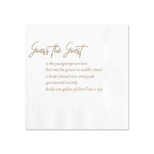 Zoom Show guides Loading product Guess The Guest Game Napkin Square Cocktail Napkin Design ID: 1990145 Click on swatch to see options Choose Your Product Color Active Color 3 ply 3 ply Top quality 3 ply. Dyed tissue. Sand Black Slate Platinum Pin Dot Dove Gray Dove Gray Borderless White White Borderless White Pin Dot White Scallop Ivory Ivory Borderless Mimosa Kiwi Kiwi Pin Dot Leaf Pin Dot Spruce Pin Dot Olive Pin Dot Dark Navy Pin Dot Light Navy Dark Turquoise Pin Dot Turquoise Powder Blue Pin Dot Lavender Pin Dot Merlot Pin Dot Antique Pink Pin Dot Ballet Pink Ballet Pink Borderless Convertible Red Light Coral Tangerine Pin Dot Platinum Out Until: 2026-04-18 Lemon Pin Dot Out Until: 2026-05-13 Lavender Out Until: 2026-04-17 Merlot Out Until: 2026-05-13 Fuchsia Out Until: 2026-04-21 Candy Pink Out Until: 2026-05-01 Linen Like* - Premium Product Linen Like* - Premium Product Absorbent. Dyed tissue. Airlaid. Premium pricing applies. Pebble Kraft Metallic Copper Ash Grey Brown Black Charcoal Stone Gray Metallic Silver Fog White Ivory Cream Buttercream Metallic Gold Lemon Moss Green Olive Green Hunter Green Pastel Green Lime Eucalyptus Dark Turquoise Bright Sky Powder Blue Navy Lavender Magenta Pink Pastel Pink Lipstick Red Terracotta Peach Mango Berry Out Until: 2026-05-15 Merlot Crosshatch* - Premium Product Crosshatch* - Premium Product Absorbent. Printed tissue. Airlaid. Premium pricing applies. Crosshatch Black Crosshatch Gray Crosshatch Stone Crosshatch Key Lime Crosshatch Green Crosshatch Navy Crosshatch Turquoise Out Until: 2026-05-10 Crosshatch Violet Out Until: 2026-05-14 Crosshatch Fuchsia Out Until: 2026-01-29 Crosshatch Lipstick Red Out Until: 2026-04-16 Woven* - Premium Product Woven* - Premium Product Basketweave texture. Single-sided color. Premium pricing applies. Woven Sand Woven Copper Woven Black Woven Slate Woven Silver Woven Stone Woven Vanilla Woven White Woven Gold Woven Sage Woven Spruce Woven Powder Blue Woven Navy Woven Mauve Woven Convertible Red Woven Tumeric Patterned* - Premium Product Patterned* - Premium Product Exclusive FYP patterns. Single-sided color. Pindot embossed edge. Product pricing applies. Oak Wood Walnut Wood Ebony Wood Ash Wood Birch Wood Marble Sand Marble Gray Marble Navy Marble Taupe Marble Blush Ombre Black Ombre Navy Ombre Robin’s Egg Blue Ombre Rose Petal Ombre Coral Watercolor Sea Glass Watercolor Ocean Watercolor Nightfall Watercolor Sangria Watercolor Hibiscus Watercolor Rose Watercolor Sunrise Leaf Sand Leaf Fern Leaf Rain Leaf Rose Tie Dye Sunflower Tie Dye Leaf Tie Dye Turquoise Tie Dye Fuchsia Shimmer* - Premium Product Shimmer* - Premium Product Elegant European Stardream with iridescent finish. Single-sided color. Pindot embossed edge. Premium pricing applies. Champagne Soft Black Galvanized Silver Crystal White Ivory Pearl Gold Sage Navy Amethyst Herringbone* - Premium Product Herringbone* - Premium Product Absorbent. Printed Herringbone pattern. Airlaid. Premium pricing applies. Herringbone Gray Onyx Herringbone Vanilla Mocha Out Until: 2026-04-21 Choose Your Imprint Foil Color Active Color Shiny Foil Shiny Foil Metallic, lustrous finish. *Specialty patterned foil may vary on final print Shiny Champagne Shiny Sterling Silver Shiny 18 Kt Gold Shiny Kiwi / Lime Shiny Leaf Shiny Spruce Shiny Jade Shiny Royal Blue Shiny Amethyst Shiny Fuchsia Shiny Rose Quartz Shiny Rose Gold NEW Shiny Merlot Shiny Convertible Red Shiny Poppy Shiny Copper *Shiny Holographic Gold *Shiny Holographic Silver *Shiny Rainbow Matte Foil Matte Foil Flat finish. Matte NEW Chocolate Matte Black Matte Slate Gray Matte Dove Grey Matte White Matte Ivory Matte Mimosa Yellow Matte Sunflower Matte Key Lime Matte Leaf Matte Teal/Peacock Matte Azure Matte Royal Blue Matte Navy Matte Amethyst Matte Pastel Pink Matte Ballet Pink Matte Fuchsia Matte Lipstick Red Matte Merlot Matte Tangerine Satin Foil Satin Foil Muted sheen, brushed finish. Satin Sterling Silver Satin 18 Kt. Gold Satin Copper Penny Satin Fuchsia Satin Lipstick Red Satin Leaf Satin Teal / Peacock Satin French Blue Satin Plum Personalize Your Text Line 1 Line 2 Line 3 Line 4 Line 5 Line 6 Personalize further with different fonts, graphics, positioning, and sizes. (Optional) Customize More Choose Your Quantity Subtotal PRICE INCLUDES: Select a Proof Option: Print As Is I confirm that I have reviewed my design and I understand it will be produced as shown and no proof will be provided. Digital Proof + $15 I would like an expert FYP designer to look at my design, make minor corrections if necessary, and send me a black and white proof before the order is produced. Orders delivered as soon as 04.30.2026. Exclusions apply. Share Your Design About This Design Play a fun guess the guest wedding game! Customize this napkin with fun facts about your guest, and have people guess who is who. This creative wedding game is the perfect way to join people from across the aisle or get your wedding tables to mingle. Product Details Product Details Classic 3-ply tissue, 4.75” or 5” square Colors vary Signature foil stamp included Bulk discounts available Expedited shipping options available. Product Description Product Description Classic Cocktail Napkins are the perfect companion for any event. Add a touch of refinement to your cocktail parties, weddings, or birthday celebrations. Whether you're sipping a Martini, Old Fashioned, or a signature cocktail, these beverage napkins are the perfect accompaniment to elevate your drink service to new heights.Traditionally designed with a classic pleated edge, highly absorbent, durable, crafted from high-quality, premium-grade paper, our Classic Cocktail Napkins are an excellent, timeless choice. They are soft to the touch, keeping your guests' hands dry and your furniture protected. Once used, simply discard them, making cleanup a breeze. Explore our Cocktail Napkins Collection to find the perfect option for your event. Due to the complexities of manufacturing, the size of