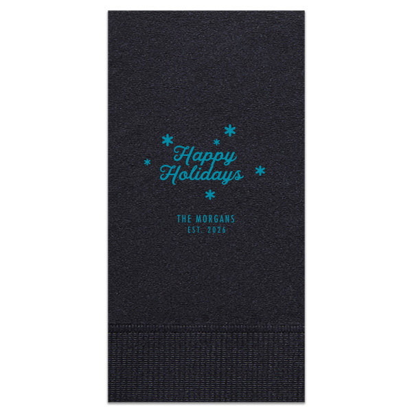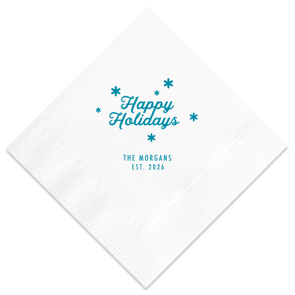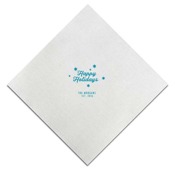 Zoom Show guides Loading product Happy Holidays Snowflake Napkin Diamond Cocktail Napkin Design ID: 7778 Click on swatch to see options Choose Your Napkin Color Active Color 3 ply 3 ply Top quality 3 ply. Dyed tissue. Sand Black Slate Platinum Platinum Pin Dot Dove Gray Dove Gray Borderless White White Borderless White Pin Dot White Scallop Ivory Ivory Borderless Mimosa Lemon Pin Dot Kiwi Kiwi Pin Dot Leaf Pin Dot Spruce Pin Dot Olive Pin Dot Light Navy Dark Turquoise Pin Dot Turquoise Powder Blue Pin Dot Lavender Lavender Pin Dot Purple Merlot Pin Dot Candy Pink Antique Pink Pin Dot Ballet Pink Ballet Pink Borderless Convertible Red Light Coral Merlot Out Until: 2025-12-22 Fuchsia Out Until: 2026-01-05 Linen Like* - Premium Product Linen Like* - Premium Product Absorbent. Dyed tissue. Airlaid. Premium pricing applies. Pebble Kraft Ash Grey Black Charcoal Stone Gray Metallic Silver Fog White Cream Buttercream Lemon Moss Green Hunter Green Pastel Green Lime Eucalyptus Dark Turquoise Bright Sky Powder Blue Navy Lavender Magenta Pastel Pink Pink Terracotta Peach Mango Metallic Copper Out Until: 2026-01-08 Brown Out Until: 2025-12-26 Ivory Out Until: 2026-01-02 Metallic Gold Out Until: 2025-12-24 Olive Green Out Until: 2025-12-24 Berry Out Until: 2025-12-28 Merlot Out Until: 2025-12-25 Lipstick Red Out Until: 2025-12-19 Crosshatch* - Premium Product Crosshatch* - Premium Product Absorbent. Printed tissue. Airlaid. Premium pricing applies. Crosshatch Black Crosshatch Gray Crosshatch Green Crosshatch Turquoise Crosshatch Violet Crosshatch Lipstick Red Crosshatch Stone Out Until: 2025-12-15 Crosshatch Key Lime Out Until: 2026-01-01 Crosshatch Navy Out Until: 2026-01-01 Crosshatch Fuchsia Out Until: 2025-12-27 Woven* - Premium Product Woven* - Premium Product Basketweave texture. Single-sided color. Premium pricing applies. Woven Sand Woven Copper Woven Black Woven Slate Woven Silver Woven Stone Woven Vanilla Woven White Woven Gold Woven Sage Woven Spruce Woven Powder Blue Woven Navy Woven Mauve Woven Convertible Red Woven Tumeric Patterned* - Premium Product Patterned* - Premium Product Exclusive FYP patterns. Single-sided color. Pindot embossed edge. Product pricing applies. Oak Wood Walnut Wood Ebony Wood Ash Wood Birch Wood Marble Sand Marble Gray Marble Navy Marble Taupe Marble Blush Ombre Black Ombre Navy Ombre Robin’s Egg Blue Ombre Rose petal Ombre Coral Watercolor Sea Glass Watercolor Ocean Watercolor Nightfall Watercolor Sangria Watercolor Hibiscus Watercolor Rose Watercolor Sunrise Leaf Sand Leaf Fern Leaf Rain Leaf Rose Tie Dye Sunflower Tie Dye Leaf Tie Dye Turquoise Tie Dye Fuchsia Shimmer* - Premium Product Shimmer* - Premium Product Elegant European Stardream with iridescent finish. Single-sided color. Pindot embossed edge. Premium pricing applies. Champagne Soft Black Galvanized Silver Crystal White Ivory Pearl Gold Sage Navy Amethyst Herringbone* - Premium Product Herringbone* - Premium Product Absorbent. Printed Herringbone pattern. Airlaid. Premium pricing applies. Herringbone Vanilla Mocha Herringbone Gray Onyx Choose Your Imprint Foil Color Active Color Shiny Foil Shiny Foil Metallic, lustrous finish. *Specialty patterned foil may vary on final print Shiny Champagne Shiny Sterling Silver Shiny 18 Kt Gold Shiny Kiwi / Lime Shiny Leaf Shiny Jade Shiny Royal Blue Shiny Amethyst Shiny Fuchsia Shiny Rose Quartz Shiny Rose Gold NEW Shiny Merlot Shiny Convertible Red Shiny Poppy Shiny Copper *Shiny Holographic Gold *Shiny Holographic Silver *Shiny Rainbow Matte Foil Matte Foil Flat finish. Matte NEW Chocolate Matte Black Matte Slate Gray Matte Dove Grey Matte White Matte Ivory Matte Mimosa Yellow Matte Sunflower Matte Key Lime Matte Leaf Matte Spruce Matte Teal/Peacock Matte Azure Matte Royal Blue Matte Navy Matte Amethyst Matte Pastel Pink Matte Ballet Pink Matte Fuchsia Matte Lipstick Red Matte Merlot Matte Tangerine Satin Foil Satin Foil Muted sheen, brushed finish. Satin Sterling Silver Satin 18 Kt. Gold Satin Copper Penny Satin Fuchsia Satin Lipstick Red Satin Leaf Satin Teal / Peacock Satin French Blue Satin Plum Personalize Your Text Line 1 Line 2 Personalize further with different fonts, graphics, positioning, and sizes. (Optional) Customize More Choose Your Quantity Subtotal PRICE INCLUDES: Select a Proof Option: Print As Is I confirm that I have reviewed my design and I understand it will be produced as shown and no proof will be provided. Digital Proof + $15 I would like an expert FYP designer to look at my design, make minor corrections if necessary, and send me a black and white proof before the order is produced. Orders delivered as soon as 12.19.2025. Exclusions apply. Share Your Design About This Design Sprinkle your holiday gatherings with the Happy Holidays Snowflake Napkin, where a cheerful greeting drifts among delicate snowflakes. Below, your family name and year established nestle, adding a personalized touch to seasonal joy. Product Details Product Details Classic 3-ply tissue, 4.75” or 5” square Colors vary Signature foil stamp included Bulk discounts available Expedited shipping options available. Product Description Product Description Classic Cocktail Napkins are the perfect companion for any event. Add a touch of refinement to your cocktail parties, weddings, or birthday celebrations. Whether you're sipping a Martini, Old Fashioned, or a signature cocktail, these beverage napkins are the perfect accompaniment to elevate your drink service to new heights.Traditionally designed with a classic pleated edge, highly absorbent, durable, crafted from high-quality, premium-grade paper, our Classic Cocktail Napkins are an excellent, timeless choice. They are soft to the touch, keeping your guests' hands dry and your furniture protected. Once used, simply discard them, making cleanup a breeze. Explore our Cocktail Napkins Collection to find the perfect option for your event. Due to the complexities of manufacturing, the size of the embossed border on our 3-