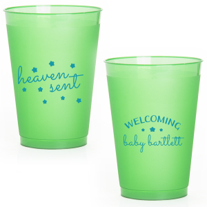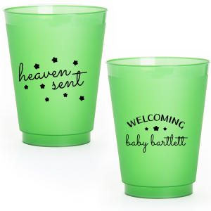 Zoom Show guides Loading product Heaven Sent Baby Shower Cup 9-oz. Frosted Cup Design ID: 258854 Click on swatch to see options Choose Your Screen Print Active Color Metallic Cup Ink Metallic Cup Ink Silver Ink Gold Ink Copper Ink Matte Cup Ink Matte Cup Ink Matte Chocolate Ink Matte Black Ink Matte Slate Gray Ink Matte White Ink Matte Sunflower Ink Matte Moss Green Ink Matte Sage Ink Matte Leaf Ink Matte Spruce Ink Matte Teal/Peacock Ink Matte Sky Blue Ink Matte French Blue Ink Matte Royal Blue Ink Matte Navy Ink Matte Cobalt Ink Matte Lavender Ink Matte Ballet Pink Ink Matte Fuchsia Ink Matte Lipstick Red Ink Matte Merlot Ink Matte Tangerine Ink Personalize Your Text Line 1-Back Line 2-Back Personalize further with different fonts, graphics, positioning, and sizes. (Optional) Customize More Choose Your Quantity Subtotal PRICE INCLUDES: Select a Proof Option: Print As Is I confirm that I have reviewed my design and I understand it will be produced as shown and no proof will be provided. Digital Proof + $15 I would like an expert FYP designer to look at my design, make minor corrections if necessary, and send me a black and white proof before the order is produced. Orders delivered as soon as 04.27.2026. Exclusions apply. Share Your Design About This Design Sip from the stars with the Heaven Sent Baby Shower Cup. "Heaven Sent" and stars dazzle on the front, symbolizing that perfect gift from above. The reverse warmly welcomes the baby's arrival with their name surrounded by stars, making each sip an ethereal celebration of joy! Product Details Product Details Minimum order of 50 Measures 2.75" tall and 3.4" wide at the top Holds 8.7 oz flush fill volume Ideal for wine and spirits on the rocks BPA-free and recyclable Shatterproof and top-rack dishwasher safe Bulk discounts available Expedited shipping options available. Product Description Product Description Custom printed frost flex cups from For Your Party are a classic standby for any event, from weddings to birthdays. Their translucent plastic complements any drink or decor, and are reusable, so your guests can have a keepsake from your special day. Like our 5 oz. frost flex cups, our 9 oz. frost flex cups are made in the USA, BPA free, and can be hand-washed again and again to remember your event. Our 9 oz. size is a little wider, great for wine or drinks on the rocks, and has a flush fill volume of 8.7 oz. Product Options 9-oz. Frosted Cup 10-oz.Frosted Cup 12-oz. Frosted Cup 12oz Frost Flex Color 14-oz.Frosted Cup 16-oz. Frosted Cup 16oz Frost Flex Color 24-oz. Frosted Cup 20-oz. Frosted Cup Related Products 9-oz. Frosted Cup 10-oz.Frosted Cup 12-oz. Frosted Cup 12oz Frost Flex Color 14-oz.Frosted Cup 16-oz. Frosted Cup 16oz Frost Flex Color 24-oz. Frosted Cup 20-oz. Frosted Cup