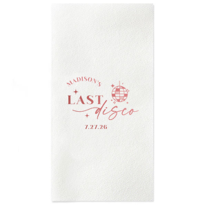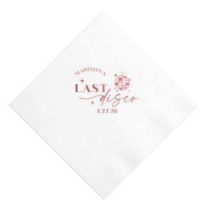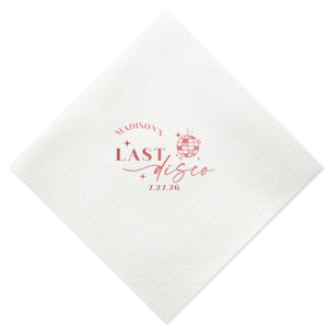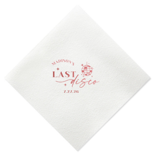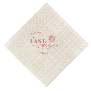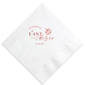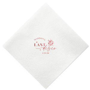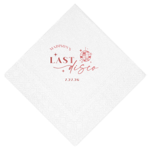 Zoom Show guides Loading product Last Disco Bachelorette Napkin Diamond Cocktail Napkin Design ID: 2442298 Click on swatch to see options Choose Your Napkin Color Active Color 3 ply 3 ply Top quality 3 ply. Dyed tissue. Sand Black Slate Platinum Pin Dot Dove Gray Dove Gray Borderless White White Borderless White Pin Dot White Scallop Ivory Ivory Borderless Kiwi Pin Dot Leaf Pin Dot Spruce Pin Dot Olive Pin Dot Dark Navy Pin Dot Light Navy Dark Turquoise Pin Dot Turquoise Powder Blue Pin Dot Lavender Pin Dot Merlot Pin Dot Antique Pink Pin Dot Ballet Pink Ballet Pink Borderless Convertible Red Light Coral Tangerine Pin Dot Platinum Out Until: 2026-05-20 Mimosa Out Until: 2026-05-23 Lemon Pin Dot Out Until: 2026-05-13 Kiwi Out Until: 2026-05-20 Lavender Out Until: 2026-04-17 Merlot Out Until: 2026-05-13 Fuchsia Out Until: 2026-04-21 Candy Pink Out Until: 2026-05-01 Linen Like* - Premium Product Linen Like* - Premium Product Absorbent. Dyed tissue. Airlaid. Premium pricing applies. Pebble Kraft Metallic Copper Ash Grey Brown Black Stone Gray Metallic Silver Fog White Ivory Cream Metallic Gold Moss Green Olive Green Hunter Green Pastel Green Lime Eucalyptus Dark Turquoise Out Until: 2026-05-01 Bright Sky Powder Blue Navy Lavender Magenta Pastel Pink Pink Lipstick Red Terracotta Peach Mango Charcoal Out Until: 2026-05-23 Buttercream Out Until: 2026-05-24 Lemon Out Until: 2026-05-19 Berry Out Until: 2026-05-15 Merlot Crosshatch* - Premium Product Crosshatch* - Premium Product Absorbent. Printed tissue. Airlaid. Premium pricing applies. Crosshatch Black Crosshatch Gray Crosshatch Stone Crosshatch Key Lime Crosshatch Green Crosshatch Turquoise Crosshatch Navy Crosshatch Violet Crosshatch Fuchsia Crosshatch Lipstick Red Woven* - Premium Product Woven* - Premium Product Basketweave texture. Single-sided color. Premium pricing applies. Woven Sand Woven Copper Woven Black Woven Slate Woven Silver Woven Stone Woven Vanilla Woven White Woven Gold Woven Sage Woven Spruce Woven Powder Blue Woven Navy Woven Mauve Woven Convertible Red Woven Tumeric Patterned* - Premium Product Patterned* - Premium Product Exclusive FYP patterns. Single-sided color. Pindot embossed edge. Product pricing applies. Oak Wood Walnut Wood Ebony Wood Ash Wood Birch Wood Marble Sand Marble Gray Marble Navy Marble Taupe Marble Blush Ombre Black Ombre Navy Ombre Robin’s Egg Blue Ombre Rose petal Ombre Coral Watercolor Sea Glass Watercolor Ocean Watercolor Nightfall Watercolor Sangria Watercolor Hibiscus Watercolor Rose Watercolor Sunrise Leaf Sand Leaf Fern Leaf Rain Leaf Rose Tie Dye Sunflower Tie Dye Leaf Tie Dye Turquoise Tie Dye Fuchsia Shimmer* - Premium Product Shimmer* - Premium Product Elegant European Stardream with iridescent finish. Single-sided color. Pindot embossed edge. Premium pricing applies. Champagne Soft Black Galvanized Silver Crystal White Ivory Pearl Gold Sage Navy Amethyst Out Until: 2026-05-22 Herringbone* - Premium Product Herringbone* - Premium Product Absorbent. Printed Herringbone pattern. Airlaid. Premium pricing applies. Herringbone Gray Onyx Herringbone Vanilla Mocha Out Until: 2026-04-21 Choose Your Imprint Foil Color Active Color Shiny Foil Shiny Foil Metallic, lustrous finish. *Specialty patterned foil may vary on final print Shiny Champagne Shiny Sterling Silver Shiny 18 Kt Gold Shiny Kiwi / Lime Shiny Leaf Shiny Spruce Shiny Jade Shiny Royal Blue Shiny Amethyst Shiny Fuchsia Shiny Rose Quartz Shiny Rose Gold NEW Shiny Merlot Shiny Convertible Red Shiny Poppy Shiny Copper *Shiny Holographic Gold *Shiny Holographic Silver *Shiny Rainbow Matte Foil Matte Foil Flat finish. Matte NEW Chocolate Matte Black Matte Slate Gray Matte Dove Grey Matte White Matte Ivory Matte Mimosa Yellow Matte Sunflower Matte Key Lime Matte Leaf Matte Teal/Peacock Matte Azure Matte Royal Blue Matte Navy Matte Amethyst Matte Pastel Pink Matte Ballet Pink Matte Fuchsia Matte Lipstick Red Matte Merlot Matte Tangerine Satin Foil Satin Foil Muted sheen, brushed finish. Satin Sterling Silver Satin 18 Kt. Gold Satin Copper Penny Satin Fuchsia Satin Lipstick Red Satin Leaf Satin Teal / Peacock Satin French Blue Satin Plum Personalize Your Text Line 1 Line 2 Personalize further with different fonts, graphics, positioning, and sizes. (Optional) Customize More Choose Your Quantity Subtotal PRICE INCLUDES: Select a Proof Option: Print As Is I confirm that I have reviewed my design and I understand it will be produced as shown and no proof will be provided. Digital Proof + $15 I would like an expert FYP designer to look at my design, make minor corrections if necessary, and send me a black and white proof before the order is produced. Orders delivered as soon as 05.08.2026. Exclusions apply. Share Your Design About This Design Celebrate the bride to be's last disco! This trendy disco themed bachelorette party is perfect for dancing the night away. Featuring a disco ball graphic, you can customize this napkin with a date and the name of the bride. Product Details Product Details Classic 3-ply tissue, 4.75” or 5” square Colors vary Signature foil stamp included Bulk discounts available Expedited shipping options available. Product Description Product Description Classic Cocktail Napkins are the perfect companion for any event. Add a touch of refinement to your cocktail parties, weddings, or birthday celebrations. Whether you're sipping a Martini, Old Fashioned, or a signature cocktail, these beverage napkins are the perfect accompaniment to elevate your drink service to new heights.Traditionally designed with a classic pleated edge, highly absorbent, durable, crafted from high-quality, premium-grade paper, our Classic Cocktail Napkins are an excellent, timeless choice. They are soft to the touch, keeping your guests' hands dry and your furniture protected. Once used, simply discard them, making cleanup a breeze. Explore our Cocktail Napkins Collection to find the perfect option for your event. Due to the complexities of manufacturin
