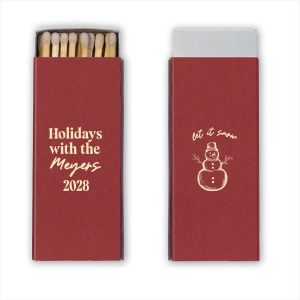 Zoom Show guides Loading product Let It Snowman Matchbox Classic Box Vertical Design ID: 3635367 Click on swatch to see options Choose Your Paper Color Active Color Linen Linen Slightly textured, matte finish. Double-sided color. 100lb+ cover stock. Linen Convertible Red Linen Black Linen Slate Linen Antique Gray Linen White Linen Eggshell Linen Ivory Linen Pearl Cream Linen Navy Blue Shiny Shiny Smooth, high-gloss finish. Single-sided color. 100lb+ cover stock. Shiny Black Shiny White Shiny Navy Blue Shiny Fuchsia Shiny Convertible Red Stardream Stardream European Stardream with iridescent finish. Double-sided color. 105lb+ cover stock. Stardream NEW Black Stardream Galvanized Silver Stardream Silver Stardream Crystal White Stardream Ivory Stardream 18k Gold Stardream Champagne Stardream Old Gold Stardream Super Gold Stardream Orange Stardream Rose Gold Stardream Blush Stardream Ballet Pink Stardream Plum Stardream Violet Stardream Lavender Stardream Denim Stardream NEW Peacock Stardream Robin's Egg Blue Poptone Poptone Soft felt texture with matte finish. Double-sided color. 100lb+ cover stock. Poptone Ballet Pink Poptone NEW Fuchsia Poptone Convertible Red Poptone Tangerine Poptone Sunflower Poptone Yellow Poptone Mimosa Poptone Mint Poptone Robin’s Egg Blue Poptone Dark Turquoise Poptone Sky Blue Poptone NEW French Blue Poptone Lavender Natural Natural Smooth, matte finish. Double-sided color. 100lb+ cover stock. Natural NEW Sand Natural Khaki Natural NEW Kraft Natural Mushroom Natural NEW Chocolate Natural Black Natural Slate Natural Gray Natural Smoke Natural NEW Frost White Natural Ivory Natural Leaf Natural Spruce Natural Olive Natural Dark Teal Natural NEW Amethyst Natural Scarlet Natural Antique Rose Natural Harvest Natural Dark Sage Textured Textured Variety of textures. Single-sided color. 110lb+ cover stock. Oak Wood Walnut Wood Ebony Wood Ash Wood Birch Wood Leather Like Tan Leather Like Black Leather Like Pearl Leather Like White Leather Like Night Blue Leather Like Lipstick Red Horizontal White Patterned* - Premium Product Patterned* - Premium Product Smooth, matte finish. Single-sided pattern with white back. Pattern and color may vary between products. 100 lb paper. Premium pricing applies. Marble Sand Marble Gray Marble Navy Marble Taupe Marble Blush Watercolor Seaglass Watercolor Ocean Watercolor Night Fall Watercolor Sangria Watercolor Hibiscus Watercolor Rose Watercolor Sunrise Leaf Sand Leaf Fern Leaf Rain Leaf Rose Blank Stock Blank Stock Blank Stock Glitter* - Premium Product Glitter* - Premium Product Sparkly with a slightly textured finish. Single-sided with a white back and 100lb+ cover stock. Premium pricing applies. Glitter NEW Black Glitter NEW Silver Glitter Champagne Glitter Rose Copper Glitter Night Fall Choose Your Imprint Foil Color Active Color Shiny Foil Shiny Foil Metallic, lustrous finish. *Specialty patterned foil may vary on final print Shiny Champagne Shiny Sterling Silver Shiny 18 Kt Gold Shiny Kiwi / Lime Shiny Leaf Shiny Jade Shiny Royal Blue Shiny Amethyst Shiny Fuchsia Shiny Rose Quartz Shiny Rose Gold NEW Shiny Merlot Shiny Convertible Red Shiny Poppy Shiny Copper *Shiny Holographic Gold *Shiny Holographic Silver *Shiny Rainbow Matte Foil Matte Foil Flat finish. Matte NEW Chocolate Matte Black Matte Slate Gray Matte Dove Grey Matte White Matte Ivory Matte Mimosa Yellow Matte Sunflower Matte Key Lime Matte Leaf Matte Spruce Matte Teal/Peacock Matte Azure Matte Royal Blue Matte Navy Matte Amethyst Matte Pastel Pink Matte Ballet Pink Matte Fuchsia Matte Lipstick Red Matte Merlot Matte Tangerine Satin Foil Satin Foil Muted sheen, brushed finish. Satin Sterling Silver Satin 18 Kt. Gold Satin Copper Penny Satin Fuchsia Satin Lipstick Red Satin Leaf Satin Teal / Peacock Satin French Blue Satin Plum Personalize Your Text Line 1 Line 2 Line 3 Line 4 Line 5 Personalize further with different fonts, graphics, positioning, and sizes. (Optional) Customize More Choose Your Quantity Subtotal PRICE INCLUDES: Select a Proof Option: Print As Is I confirm that I have reviewed my design and I understand it will be produced as shown and no proof will be provided. Digital Proof + $15 I would like an expert FYP designer to look at my design, make minor corrections if necessary, and send me a black and white proof before the order is produced. Orders delivered as soon as 12.16.2025. Exclusions apply. Share Your Design About This Design ForYourParty's personalized Natural Scarlet Classic Matchbox (Foil) with Matte Ivory Foil has a Snowman graphic and is good for use in Outdoors themed parties and will make your guests swoon. Personalize your party's theme today. Product Details Product Details Minimum order of 50 Measures 2.22" wide by 1.375" long by 0.46" high Includes approximately 19 matchsticks Expedited shipping options available. Product Description Product Description Our classic matchboxes are the perfect addition to your birthday, wedding, or any other event. A bowl of custom matchboxes is the perfect way to make an impression as a home decor accent or party favor. Your friends and guests will be impressed with your attention to detail!Like our square matchboxes, our classic matchboxes feature a sliding tray for the matches inside a durable cardboard case that’s covered in a paper of your choice. They’re long-lasting, reliable, and can be used with any one of our wide variety of paper colors. Product Options Classic Box Vertical Square Box Vertical Large Square Box Vertical Candle Box Vertical Cigar Box Vertical Related Products Classic Box Vertical Square Box Vertical Large Square Box Vertical Candle Box Vertical Cigar Box Vertical