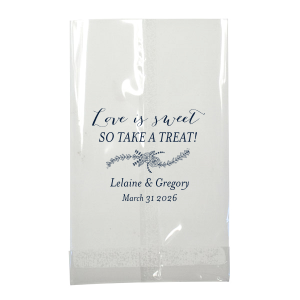 The Love is Sweet Rose Flourish Bag is a delightful token of gratitude for any celebration. Adorned with the heartfelt phrase "Love is Sweet, So take a Treat!" and a graceful rose garland, it's personalized with the couple's names and date, offering a charming way to share joyous treats.