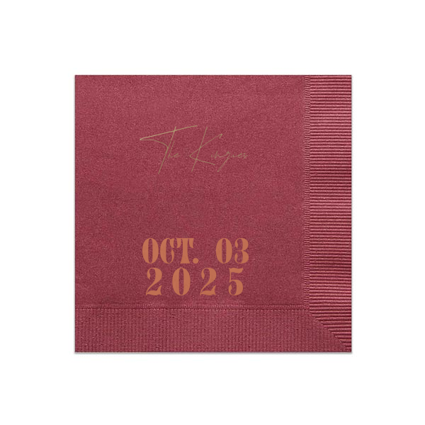 Zoom Show guides Loading product Modern Family Name and Date Napkin Square Cocktail Napkin - 2 color Design ID: 2404372 Click on swatch to see options Choose Your Product Color Active Color 3 ply 3 ply Top quality 3 ply. Dyed tissue. Sand Black Slate Platinum Dove Gray Dove Gray Borderless White White Borderless White Pin Dot White Scallop Ivory Ivory Borderless Mimosa Kiwi Light Navy Turquoise Lavender Purple Fuchsia Candy Pink Ballet Pink Ballet Pink Borderless Convertible Red Light Coral Merlot Out Until: 2025-11-06 Tangerine Out Until: 2025-10-28 Linen Like* - Premium Product Linen Like* - Premium Product Absorbent. Dyed tissue. Airlaid. Premium pricing applies. Pebble Kraft Ash Grey Black Charcoal Stone Gray Fog White Ivory Cream Buttercream Lemon Moss Green Olive Green Hunter Green Pastel Green Lime Eucalyptus Dark Turquoise Bright Sky Powder Blue Navy Lavender Berry Merlot Magenta Pastel Pink Pink Lipstick Red Terracotta Peach Mango Metallic Copper Metallic Gold Metallic Silver Brown Out Until: 2025-11-21 Plum Out Until: 2025-11-13 Crosshatch* - Premium Product Crosshatch* - Premium Product Absorbent. Printed tissue. Airlaid. Premium pricing applies. Crosshatch Black Crosshatch Gray Crosshatch Stone Crosshatch Turquoise Crosshatch Violet Crosshatch Fuchsia Crosshatch Lipstick Red Crosshatch Key Lime Out Until: 2025-11-26 Crosshatch Green Out Until: 2025-11-29 Crosshatch Navy Out Until: 2025-11-24 Woven* - Premium Product Woven* - Premium Product Basketweave texture. Single-sided color. Premium pricing applies. Woven Sand Woven Copper Woven Black Woven Slate Woven Silver Woven Stone Woven Vanilla Woven White Woven Gold Woven Sage Woven Spruce Woven Powder Blue Woven Navy Woven Mauve Woven Convertible Red Woven Tumeric Patterned* - Premium Product Patterned* - Premium Product Exclusive FYP patterns. Single-sided color. Pindot embossed edge. Product pricing applies. Oak Wood Walnut Wood Ebony Wood Ash Wood Birch Wood Marble Sand Marble Gray Marble Navy Marble Taupe Marble Blush Ombre Black Ombre Navy Ombre Robin’s Egg Blue Ombre Rose Petal Ombre Coral Watercolor Sea Glass Watercolor Ocean Watercolor Nightfall Watercolor Sangria Watercolor Hibiscus Watercolor Rose Watercolor Sunrise Leaf Sand Leaf Fern Leaf Rain Leaf Rose Tie Dye Sunflower Tie Dye Leaf Tie Dye Turquoise Tie Dye Fuchsia Shimmer* - Premium Product Shimmer* - Premium Product Elegant European Stardream with iridescent finish. Single-sided color. Pindot embossed edge. Premium pricing applies. Champagne Soft Black Galvanized Silver Crystal White Ivory Pearl Gold Sage Navy Amethyst Choose Your Foil Color 1 Active Color Shiny Foil Shiny Foil Metallic, lustrous finish. *Specialty patterned foil may vary on final print Shiny Champagne Matte Foil Matte Foil Flat finish. Matte Black Matte Slate Gray Matte White Matte Mimosa Yellow Matte Sunflower Matte Key Lime Matte Spruce Matte Royal Blue Matte Navy Matte Amethyst Matte Pastel Pink Matte Lipstick Red Matte Merlot Matte Tangerine Satin Foil Satin Foil Muted sheen, brushed finish. Satin Sterling Silver Satin 18 Kt. Gold Satin Copper Penny Choose Your Foil Color 2 Active Color Shiny Foil Shiny Foil Metallic, lustrous finish. *Specialty patterned foil may vary on final print Shiny Champagne Matte Foil Matte Foil Flat finish. Matte Black Matte Slate Gray Matte White Matte Mimosa Yellow Matte Sunflower Matte Key Lime Matte Spruce Matte Royal Blue Matte Navy Matte Amethyst Matte Pastel Pink Matte Lipstick Red Matte Merlot Matte Tangerine Satin Foil Satin Foil Muted sheen, brushed finish. Satin Sterling Silver Satin 18 Kt. Gold Satin Copper Penny Personalize Your Text Line 1 Line 2 Line 3 Personalize further with different fonts, graphics, positioning, and sizes. (Optional) Customize More Choose Your Quantity Subtotal PRICE INCLUDES: Select a Proof Option: Print As Is I confirm that I have reviewed my design and I understand it will be produced as shown and no proof will be provided. Digital Proof + $15 I would like an expert FYP designer to look at my design, make minor corrections if necessary, and send me a black and white proof before the order is produced. Orders delivered as soon as 11.04.2025. Exclusions apply. Share Your Design About This Design Meet our new Modern Family Name and Date Napkin with elegant vibe and trendy look. Put your name & date on it and you are good to go! Amaze your guests like never before! Product Details Product Details Classic 3-ply tissue 4.75” or 5” Square, Colors Vary Signature Foil Stamp Included Volume discounts Expedited options available Product Description Product Description Introducing our 2-Foil Print Cocktail Napkins, where your unique design is printed in not just one, but two different foil colors, creating a truly mesmerizing and glamorous addition to your cocktail parties and special events.In addition to their visual appeal, these napkins offer practicality and functionality. Printed on the same base as our Classic Cocktail Napkins, they are soft to the touch while being highly absorbent. Allow the captivating allure of these napkins and impress your guests with their stunning dual foil colors, making every moment of your event truly unforgettable.Due to the complexities of manufacturing, the size of the embossed border on our 3-ply napkins may vary slightly. These discrepancies are a natural part of the manufacturing process and do not impact the overall quality or functionality of the napkins. Product Options Square Cocktail Napkin - 2 color Square Luncheon Napkin - 2 color Related Products Square Cocktail Napkin - 2 color Square Luncheon Napkin - 2 color