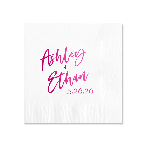 Zoom Show guides Loading product Modern Script Stacked Names & Date Napkin Square Cocktail Napkin Design ID: 617621 Click on swatch to see options Choose Your Product Color Active Color 3 ply 3 ply Top quality 3 ply. Dyed tissue. Sand Black Slate Platinum Pin Dot Dove Gray Dove Gray Borderless White White Borderless White Pin Dot White Scallop Ivory Ivory Borderless Kiwi Pin Dot Leaf Pin Dot Spruce Pin Dot Olive Pin Dot Dark Navy Pin Dot Light Navy Dark Turquoise Pin Dot Turquoise Powder Blue Pin Dot Lavender Pin Dot Merlot Pin Dot Antique Pink Pin Dot Ballet Pink Ballet Pink Borderless Convertible Red Light Coral Tangerine Pin Dot Platinum Out Until: 2026-04-18 Mimosa Out Until: 2026-05-04 Lemon Pin Dot Out Until: 2026-05-13 Kiwi Out Until: 2026-04-14 Lavender Out Until: 2026-04-17 Merlot Out Until: 2026-05-13 Fuchsia Out Until: 2026-04-21 Candy Pink Out Until: 2026-05-01 Linen Like* - Premium Product Linen Like* - Premium Product Absorbent. Dyed tissue. Airlaid. Premium pricing applies. Pebble Kraft Metallic Copper Ash Grey Brown Black Charcoal Stone Gray Metallic Silver Fog White Ivory Cream Buttercream Metallic Gold Lemon Moss Green Olive Green Hunter Green Pastel Green Lime Eucalyptus Dark Turquoise Bright Sky Powder Blue Navy Lavender Berry Magenta Pink Pastel Pink Lipstick Red Terracotta Peach Mango Merlot Crosshatch* - Premium Product Crosshatch* - Premium Product Absorbent. Printed tissue. Airlaid. Premium pricing applies. Crosshatch Black Crosshatch Gray Crosshatch Stone Crosshatch Key Lime Crosshatch Green Crosshatch Navy Crosshatch Turquoise Out Until: 2026-05-10 Crosshatch Violet Out Until: 2026-05-14 Crosshatch Fuchsia Out Until: 2026-01-29 Crosshatch Lipstick Red Out Until: 2026-04-16 Woven* - Premium Product Woven* - Premium Product Basketweave texture. Single-sided color. Premium pricing applies. Woven Sand Woven Copper Woven Black Woven Slate Woven Silver Woven Stone Woven Vanilla Woven White Woven Gold Woven Sage Woven Spruce Woven Powder Blue Woven Navy Woven Mauve Woven Convertible Red Woven Tumeric Patterned* - Premium Product Patterned* - Premium Product Exclusive FYP patterns. Single-sided color. Pindot embossed edge. Product pricing applies. Oak Wood Walnut Wood Ebony Wood Ash Wood Birch Wood Marble Sand Marble Gray Marble Navy Marble Taupe Marble Blush Ombre Black Ombre Navy Ombre Robin’s Egg Blue Ombre Rose Petal Ombre Coral Watercolor Sea Glass Watercolor Ocean Watercolor Nightfall Watercolor Sangria Watercolor Hibiscus Watercolor Rose Watercolor Sunrise Leaf Sand Leaf Fern Leaf Rain Leaf Rose Tie Dye Sunflower Tie Dye Leaf Tie Dye Turquoise Tie Dye Fuchsia Shimmer* - Premium Product Shimmer* - Premium Product Elegant European Stardream with iridescent finish. Single-sided color. Pindot embossed edge. Premium pricing applies. Champagne Soft Black Galvanized Silver Crystal White Ivory Pearl Gold Sage Navy Amethyst Herringbone* - Premium Product Herringbone* - Premium Product Absorbent. Printed Herringbone pattern. Airlaid. Premium pricing applies. Herringbone Gray Onyx Herringbone Vanilla Mocha Out Until: 2026-04-21 Choose Your Imprint Foil Color Active Color Shiny Foil Shiny Foil Metallic, lustrous finish. *Specialty patterned foil may vary on final print Shiny Champagne Shiny Sterling Silver Shiny 18 Kt Gold Shiny Kiwi / Lime Shiny Leaf Shiny Spruce Shiny Jade Shiny Royal Blue Shiny Amethyst Shiny Fuchsia Shiny Rose Quartz Shiny Rose Gold NEW Shiny Merlot Shiny Convertible Red Shiny Poppy Shiny Copper *Shiny Holographic Gold *Shiny Holographic Silver *Shiny Rainbow Matte Foil Matte Foil Flat finish. Matte NEW Chocolate Matte Black Matte Slate Gray Matte Dove Grey Matte White Matte Ivory Matte Mimosa Yellow Matte Sunflower Matte Key Lime Matte Leaf Matte Teal/Peacock Matte Azure Matte Royal Blue Matte Navy Matte Amethyst Matte Pastel Pink Matte Ballet Pink Matte Fuchsia Matte Lipstick Red Matte Merlot Matte Tangerine Satin Foil Satin Foil Muted sheen, brushed finish. Satin Sterling Silver Satin 18 Kt. Gold Satin Copper Penny Satin Fuchsia Satin Lipstick Red Satin Leaf Satin Teal / Peacock Satin French Blue Satin Plum Personalize Your Text Line 1 Line 2 Line 3 Personalize further with different fonts, graphics, positioning, and sizes. (Optional) Customize More Choose Your Quantity Subtotal PRICE INCLUDES: Select a Proof Option: Print As Is I confirm that I have reviewed my design and I understand it will be produced as shown and no proof will be provided. Digital Proof + $15 I would like an expert FYP designer to look at my design, make minor corrections if necessary, and send me a black and white proof before the order is produced. Orders delivered as soon as 04.27.2026. Exclusions apply. Share Your Design About This Design Step into the spotlight with the Modern Stacked Names & Date Napkin, where the couple's names take center stage in a marquee-inspired scrolling script. The date, presented in striking block letters, adds a dramatic touch, making every guest feel part of the star-studded event. Product Details Product Details Classic 3-ply tissue, 4.75” or 5” square Colors vary Signature foil stamp included Bulk discounts available Expedited shipping options available. Product Description Product Description Classic Cocktail Napkins are the perfect companion for any event. Add a touch of refinement to your cocktail parties, weddings, or birthday celebrations. Whether you're sipping a Martini, Old Fashioned, or a signature cocktail, these beverage napkins are the perfect accompaniment to elevate your drink service to new heights.Traditionally designed with a classic pleated edge, highly absorbent, durable, crafted from high-quality, premium-grade paper, our Classic Cocktail Napkins are an excellent, timeless choice. They are soft to the touch, keeping your guests' hands dry and your furniture protected. Once used, simply discard them, making cleanup a breeze. Explore our Cocktail Napkins Collection to find the perfect option for your event. Due to the c
