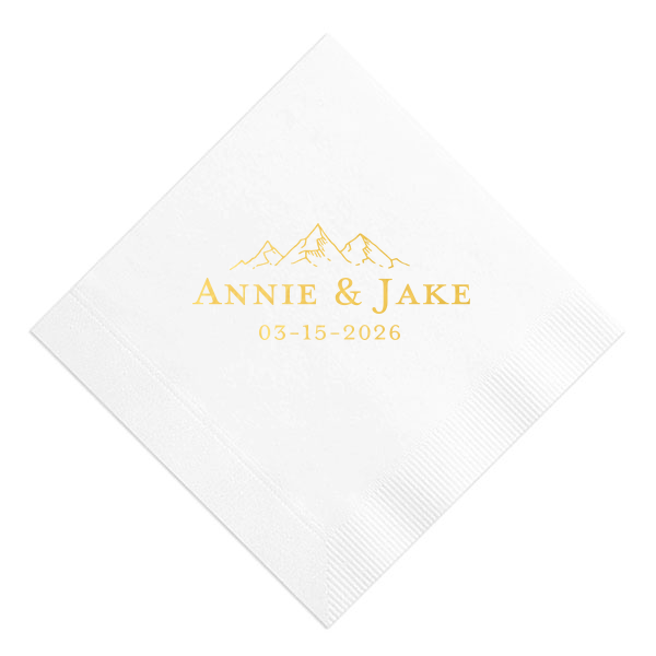 Zoom Show guides Loading product Mountain Range Date Napkin Diamond Cocktail Napkin Design ID: 901226 Click on swatch to see options Choose Your Napkin Color Active Color 3 ply 3 ply Top quality 3 ply. Dyed tissue. Sand Black Slate Platinum Platinum Pin Dot Dove Gray Dove Gray Borderless White White Borderless White Pin Dot White Scallop Ivory Ivory Borderless Mimosa Lemon Pin Dot Kiwi Kiwi Pin Dot Leaf Pin Dot Spruce Pin Dot Olive Pin Dot Light Navy Dark Turquoise Pin Dot Turquoise Powder Blue Pin Dot Lavender Lavender Pin Dot Purple Merlot Pin Dot Candy Pink Antique Pink Pin Dot Ballet Pink Ballet Pink Borderless Convertible Red Light Coral Merlot Out Until: 2025-12-22 Fuchsia Out Until: 2026-01-05 Linen Like* - Premium Product Linen Like* - Premium Product Absorbent. Dyed tissue. Airlaid. Premium pricing applies. Pebble Kraft Ash Grey Black Charcoal Stone Gray Metallic Silver Fog White Cream Buttercream Lemon Moss Green Hunter Green Pastel Green Lime Eucalyptus Dark Turquoise Bright Sky Powder Blue Navy Lavender Magenta Pastel Pink Pink Terracotta Peach Mango Metallic Copper Out Until: 2026-01-08 Brown Out Until: 2025-12-26 Ivory Out Until: 2026-01-02 Metallic Gold Out Until: 2025-12-24 Olive Green Out Until: 2025-12-24 Berry Out Until: 2025-12-28 Merlot Out Until: 2025-12-25 Lipstick Red Out Until: 2025-12-19 Crosshatch* - Premium Product Crosshatch* - Premium Product Absorbent. Printed tissue. Airlaid. Premium pricing applies. Crosshatch Black Crosshatch Gray Crosshatch Green Crosshatch Turquoise Crosshatch Violet Crosshatch Lipstick Red Crosshatch Stone Out Until: 2025-12-15 Crosshatch Key Lime Out Until: 2026-01-01 Crosshatch Navy Out Until: 2026-01-01 Crosshatch Fuchsia Out Until: 2025-12-27 Woven* - Premium Product Woven* - Premium Product Basketweave texture. Single-sided color. Premium pricing applies. Woven Sand Woven Copper Woven Black Woven Slate Woven Silver Woven Stone Woven Vanilla Woven White Woven Gold Woven Sage Woven Spruce Woven Powder Blue Woven Navy Woven Mauve Woven Convertible Red Woven Tumeric Patterned* - Premium Product Patterned* - Premium Product Exclusive FYP patterns. Single-sided color. Pindot embossed edge. Product pricing applies. Oak Wood Walnut Wood Ebony Wood Ash Wood Birch Wood Marble Sand Marble Gray Marble Navy Marble Taupe Marble Blush Ombre Black Ombre Navy Ombre Robin’s Egg Blue Ombre Rose petal Ombre Coral Watercolor Sea Glass Watercolor Ocean Watercolor Nightfall Watercolor Sangria Watercolor Hibiscus Watercolor Rose Watercolor Sunrise Leaf Sand Leaf Fern Leaf Rain Leaf Rose Tie Dye Sunflower Tie Dye Leaf Tie Dye Turquoise Tie Dye Fuchsia Shimmer* - Premium Product Shimmer* - Premium Product Elegant European Stardream with iridescent finish. Single-sided color. Pindot embossed edge. Premium pricing applies. Champagne Soft Black Galvanized Silver Crystal White Ivory Pearl Gold Sage Navy Amethyst Herringbone* - Premium Product Herringbone* - Premium Product Absorbent. Printed Herringbone pattern. Airlaid. Premium pricing applies. Herringbone Vanilla Mocha Herringbone Gray Onyx Choose Your Imprint Foil Color Active Color Shiny Foil Shiny Foil Metallic, lustrous finish. *Specialty patterned foil may vary on final print Shiny Champagne Shiny Sterling Silver Shiny 18 Kt Gold Shiny Kiwi / Lime Shiny Leaf Shiny Jade Shiny Royal Blue Shiny Amethyst Shiny Fuchsia Shiny Rose Quartz Shiny Rose Gold NEW Shiny Merlot Shiny Convertible Red Shiny Poppy Shiny Copper *Shiny Holographic Gold *Shiny Holographic Silver *Shiny Rainbow Matte Foil Matte Foil Flat finish. Matte NEW Chocolate Matte Black Matte Slate Gray Matte Dove Grey Matte White Matte Ivory Matte Mimosa Yellow Matte Sunflower Matte Key Lime Matte Leaf Matte Spruce Matte Teal/Peacock Matte Azure Matte Royal Blue Matte Navy Matte Amethyst Matte Pastel Pink Matte Ballet Pink Matte Fuchsia Matte Lipstick Red Matte Merlot Matte Tangerine Satin Foil Satin Foil Muted sheen, brushed finish. Satin Sterling Silver Satin 18 Kt. Gold Satin Copper Penny Satin Fuchsia Satin Lipstick Red Satin Leaf Satin Teal / Peacock Satin French Blue Satin Plum Personalize Your Text Line 1 Line 2 Personalize further with different fonts, graphics, positioning, and sizes. (Optional) Customize More Choose Your Quantity Subtotal PRICE INCLUDES: Select a Proof Option: Print As Is I confirm that I have reviewed my design and I understand it will be produced as shown and no proof will be provided. Digital Proof + $15 I would like an expert FYP designer to look at my design, make minor corrections if necessary, and send me a black and white proof before the order is produced. Orders delivered as soon as 12.19.2025. Exclusions apply. Share Your Design About This Design The Mountain Range Date Napkin brings nature's majesty to your event. Featuring a subtle background of three mountain peaks, it signifies the couple's affinity for mountains or celebrates a mountainous event locale. Below, the couple's names and event date, convey a sense of groundedness, perfectly blending the grandeur of nature with the simplicity of love. Product Details Product Details Classic 3-ply tissue, 4.75” or 5” square Colors vary Signature foil stamp included Bulk discounts available Expedited shipping options available. Product Description Product Description Classic Cocktail Napkins are the perfect companion for any event. Add a touch of refinement to your cocktail parties, weddings, or birthday celebrations. Whether you're sipping a Martini, Old Fashioned, or a signature cocktail, these beverage napkins are the perfect accompaniment to elevate your drink service to new heights.Traditionally designed with a classic pleated edge, highly absorbent, durable, crafted from high-quality, premium-grade paper, our Classic Cocktail Napkins are an excellent, timeless choice. They are soft to the touch, keeping your guests' hands dry and your furniture protected. Once used, simply discard them, making cleanup a breeze. Explore our Cocktail Napkins Collection t