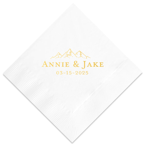 Zoom Show guides Loading product Mountain Range Date Napkin Diamond Cocktail Napkin Design ID: 901226 Click on swatch to see options Choose Your Napkin Color Active Color 3 ply 3 ply Top quality 3 ply. Dyed tissue. Sand Black Slate Platinum Platinum Pin Dot Dove Gray Dove Gray Borderless White White Borderless White Pin Dot White Scallop Ivory Ivory Borderless Mimosa Lemon Pin Dot Kiwi Kiwi Pin Dot Leaf Pin Dot Olive Pin Dot Light Navy Dark Turquoise Pin Dot Turquoise Powder Blue Pin Dot Lavender Purple Merlot Pin Dot Candy Pink Antique Pink Pin Dot Ballet Pink Ballet Pink Borderless Convertible Red Light Coral Spruce Pin Dot Out Until: 2025-12-14 Lavender Pin Dot Out Until: 2025-12-14 Merlot Out Until: 2025-12-22 Fuchsia Out Until: 2025-12-29 Tangerine Out Until: 2025-11-29 Linen Like* - Premium Product Linen Like* - Premium Product Absorbent. Dyed tissue. Airlaid. Premium pricing applies. Pebble Kraft Metallic Copper Ash Grey Black Charcoal Stone Gray Metallic Silver Fog White Ivory Cream Buttercream Lemon Moss Green Hunter Green Pastel Green Lime Eucalyptus Dark Turquoise Bright Sky Powder Blue Navy Lavender Magenta Pastel Pink Pink Terracotta Peach Mango Brown Out Until: 2025-12-26 Metallic Gold Out Until: 2025-12-24 Olive Green Out Until: 2025-12-24 Berry Out Until: 2025-12-28 Merlot Out Until: 2025-12-25 Lipstick Red Out Until: 2025-12-19 Crosshatch* - Premium Product Crosshatch* - Premium Product Absorbent. Printed tissue. Airlaid. Premium pricing applies. Crosshatch Black Crosshatch Gray Crosshatch Turquoise Crosshatch Violet Crosshatch Lipstick Red Crosshatch Stone Out Until: 2025-12-15 Crosshatch Key Lime Out Until: 2025-11-30 Crosshatch Green Out Until: 2025-12-03 Crosshatch Navy Out Until: 2025-11-30 Crosshatch Fuchsia Out Until: 2025-12-27 Woven* - Premium Product Woven* - Premium Product Basketweave texture. Single-sided color. Premium pricing applies. Woven Sand Woven Copper Woven Black Woven Slate Woven Silver Woven Stone Woven Vanilla Woven White Woven Gold Woven Sage Woven Spruce Woven Powder Blue Woven Navy Woven Mauve Woven Convertible Red Woven Tumeric Patterned* - Premium Product Patterned* - Premium Product Exclusive FYP patterns. Single-sided color. Pindot embossed edge. Product pricing applies. Oak Wood Walnut Wood Ebony Wood Ash Wood Birch Wood Marble Sand Marble Gray Marble Navy Marble Taupe Marble Blush Ombre Black Ombre Navy Ombre Robin’s Egg Blue Ombre Rose petal Ombre Coral Watercolor Sea Glass Watercolor Ocean Watercolor Nightfall Watercolor Sangria Watercolor Hibiscus Watercolor Rose Watercolor Sunrise Leaf Sand Leaf Fern Leaf Rain Leaf Rose Tie Dye Sunflower Tie Dye Leaf Tie Dye Turquoise Tie Dye Fuchsia Shimmer* - Premium Product Shimmer* - Premium Product Elegant European Stardream with iridescent finish. Single-sided color. Pindot embossed edge. Premium pricing applies. Champagne Soft Black Galvanized Silver Crystal White Ivory Pearl Gold Sage Navy Amethyst Herringbone* - Premium Product Herringbone* - Premium Product Absorbent. Printed Herringbone pattern. Airlaid. Premium pricing applies. Herringbone Vanilla Mocha Herringbone Gray Onyx Choose Your Imprint Foil Color Active Color Shiny Foil Shiny Foil Metallic, lustrous finish. *Specialty patterned foil may vary on final print Shiny Champagne Shiny Sterling Silver Shiny 18 Kt Gold Shiny Kiwi / Lime Shiny Leaf Shiny Jade Shiny Royal Blue Shiny Amethyst Shiny Fuchsia Shiny Rose Quartz Shiny Rose Gold NEW Shiny Merlot Shiny Convertible Red Shiny Poppy Shiny Copper *Shiny Holographic Gold *Shiny Holographic Silver *Shiny Rainbow Matte Foil Matte Foil Flat finish. Matte NEW Chocolate Matte Black Matte Slate Gray Matte Dove Grey Matte White Matte Ivory Matte Mimosa Yellow Matte Sunflower Matte Key Lime Matte Leaf Matte Spruce Matte Teal/Peacock Matte Azure Matte Royal Blue Matte Navy Matte Amethyst Matte Pastel Pink Matte Ballet Pink Matte Fuchsia Matte Lipstick Red Matte Merlot Matte Tangerine Satin Foil Satin Foil Muted sheen, brushed finish. Satin Sterling Silver Satin 18 Kt. Gold Satin Copper Penny Satin Fuchsia Satin Lipstick Red Satin Leaf Satin Teal / Peacock Satin French Blue Satin Plum Personalize Your Text Line 1 Line 2 Personalize further with different fonts, graphics, positioning, and sizes. (Optional) Customize More Choose Your Quantity Subtotal PRICE INCLUDES: Select a Proof Option: Print As Is I confirm that I have reviewed my design and I understand it will be produced as shown and no proof will be provided. Digital Proof + $15 I would like an expert FYP designer to look at my design, make minor corrections if necessary, and send me a black and white proof before the order is produced. Orders delivered as soon as 12.08.2025. Exclusions apply. Share Your Design About This Design The Mountain Range Date Napkin brings nature's majesty to your event. Featuring a subtle background of three mountain peaks, it signifies the couple's affinity for mountains or celebrates a mountainous event locale. Below, the couple's names and event date, convey a sense of groundedness, perfectly blending the grandeur of nature with the simplicity of love. Product Details Product Details Classic 3-ply tissue, 4.75” or 5” square Colors vary Signature foil stamp included Bulk discounts available Expedited shipping options available. Product Description Product Description Classic Cocktail Napkins are the perfect companion for any event. Add a touch of refinement to your cocktail parties, weddings, or birthday celebrations. Whether you're sipping a Martini, Old Fashioned, or a signature cocktail, these beverage napkins are the perfect accompaniment to elevate your drink service to new heights.Traditionally designed with a classic pleated edge, highly absorbent, durable, crafted from high-quality, premium-grade paper, our Classic Cocktail Napkins are an excellent, timeless choice. They are soft to the touch, keeping your guests' hands dry and your furniture protected. Once used, simply discard them, making clean