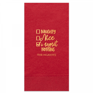 Zoom Show guides Loading product Naughty or Nice Napkin Square Linen Like Cocktail Napkin Design ID: 2584342 Click on swatch to see options Choose Your Product Color Active Color Linen Like* - Premium Product Linen Like* - Premium Product Absorbent. Dyed tissue. Airlaid. Premium pricing applies. Pebble Kraft Ash Grey Brown Black Charcoal Stone Gray Fog White Ivory Cream Buttercream Moss Green Olive Green Hunter Green Pastel Green Lime Eucalyptus Dark Turquoise Bright Sky Powder Blue Navy Lavender Magenta Pink Pastel Pink Lipstick Red Terracotta Peach Mango Metallic Silver Metallic Gold Metallic Copper Lemon Out Until: 2026-05-19 Berry Out Until: 2026-05-15 Merlot Crosshatch* - Premium Product Crosshatch* - Premium Product Absorbent. Printed tissue. Airlaid. Premium pricing applies. Crosshatch Black Crosshatch Gray Crosshatch Stone Crosshatch Key Lime Crosshatch Green Crosshatch Turquoise Crosshatch Navy Crosshatch Fuchsia Crosshatch Violet Out Until: 2026-05-14 Crosshatch Lipstick Red Out Until: 2026-05-16 Herringbone* - Premium Product Herringbone* - Premium Product Absorbent. Printed Herringbone pattern. Airlaid. Premium pricing applies. Herringbone Gray Onyx Herringbone Vanilla Mocha Out Until: 2026-04-21 Choose Your Imprint Foil Color Active Color Shiny Foil Shiny Foil Metallic, lustrous finish. *Specialty patterned foil may vary on final print Shiny Champagne Shiny Sterling Silver Shiny 18 Kt Gold Shiny Kiwi / Lime Shiny Leaf Shiny Spruce Shiny Jade Shiny Royal Blue Shiny Amethyst Shiny Fuchsia Shiny Rose Quartz Shiny Rose Gold NEW Shiny Merlot Shiny Convertible Red Shiny Poppy Shiny Copper *Shiny Holographic Gold *Shiny Holographic Silver *Shiny Rainbow Matte Foil Matte Foil Flat finish. Matte NEW Chocolate Matte Black Matte Slate Gray Matte Dove Grey Matte White Matte Ivory Matte Mimosa Yellow Matte Sunflower Matte Key Lime Matte Leaf Matte Teal/Peacock Matte Azure Matte Royal Blue Matte Navy Matte Amethyst Matte Pastel Pink Matte Ballet Pink Matte Fuchsia Matte Lipstick Red Matte Merlot Matte Tangerine Satin Foil Satin Foil Muted sheen, brushed finish. Satin Sterling Silver Satin 18 Kt. Gold Satin Copper Penny Satin Fuchsia Satin Lipstick Red Satin Leaf Satin Teal / Peacock Satin French Blue Satin Plum Personalize Your Text Line 1 Personalize further with different fonts, graphics, positioning, and sizes. (Optional) Customize More Choose Your Quantity Subtotal PRICE INCLUDES: Select a Proof Option: Print As Is I confirm that I have reviewed my design and I understand it will be produced as shown and no proof will be provided. Digital Proof + $15 I would like an expert FYP designer to look at my design, make minor corrections if necessary, and send me a black and white proof before the order is produced. Orders delivered as soon as 05.05.2026. Exclusions apply. Share Your Design About This Design ForYourParty's personalized Convertible Red Cocktail Napkin with Shiny 18 Kt Gold Foil has a Naughty Nice graphic and is good for use in Christmas, Holiday, Words themed parties and will add that special attention to detail that cannot be overlooked. Product Details Product Details Deluxe air laid paper Measures approximately 5" x 5" Signature foil stamp included Bulk discounts available Expedited shipping options available. Product Description Product Description Introducing our custom Linen-Like Cocktail Napkins, the epitome of elegance and refinement for your sophisticated gatherings. Whether you're hosting a formal wedding reception or a chic cocktail soirée, these linen cocktail napkins effortlessly complement any table setting. Their soft and gentle touch will leave a lasting impression on guests, showcasing your commitment to providing a truly upscale experience. Meticulously crafted, these napkins exude the luxurious look and feel of fine linen while offering the convenience of being disposable. Crafted from premium-quality materials, they are highly absorbent and the same dimensions as our classic cocktail napkins. With the perfect blend of functionality and elegance, you can elevate any upscale bar or lounge. Product Options Square Linen Like Cocktail Napkin Square Cocktail Napkin Paper Guest Towel Paper Guest Towel Shimmer Guest Hand Towel Square Petite Napkin Square Luncheon Napkin Related Products Square Linen Like Cocktail Napkin Square Cocktail Napkin Paper Guest Towel Paper Guest Towel Shimmer Guest Hand Towel Square Petite Napkin Square Luncheon Napkin