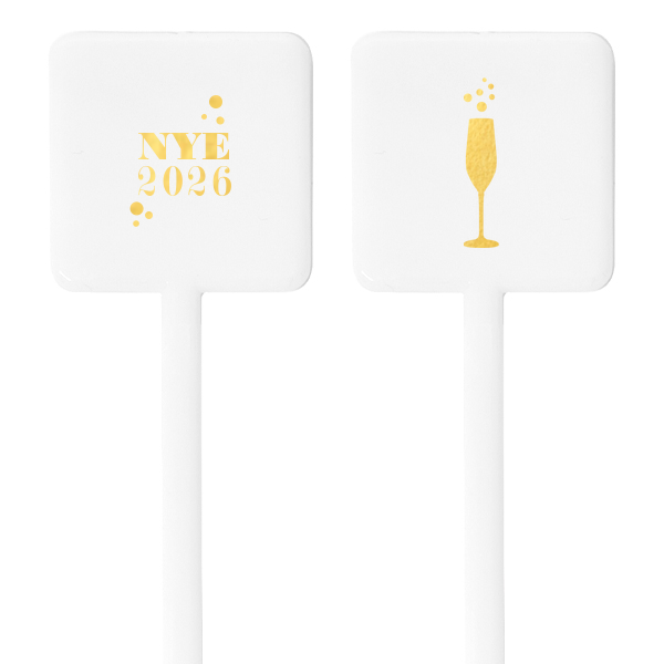 Zoom Show guides Loading product NYE Champagne Stir Stick Round Stir Stick Design ID: 15191 Click on swatch to see options Choose Your Imprint Foil Color Active Color Shiny Foil Shiny Foil Metallic, lustrous finish. *Specialty patterned foil may vary on final print Shiny Champagne Shiny Sterling Silver Shiny 18 Kt Gold Shiny Kiwi / Lime Shiny Leaf Shiny Jade Shiny Royal Blue Shiny Amethyst Shiny Fuchsia Shiny Rose Quartz Shiny Rose Gold NEW Shiny Merlot Shiny Convertible Red Shiny Poppy Shiny Copper *Shiny Holographic Gold *Shiny Holographic Silver *Shiny Rainbow Matte Foil Matte Foil Flat finish. Matte NEW Chocolate Matte Black Matte Slate Gray Matte Dove Grey Matte White Matte Ivory Matte Mimosa Yellow Matte Sunflower Matte Key Lime Matte Leaf Matte Spruce Matte Teal/Peacock Matte Azure Matte Royal Blue Matte Navy Matte Amethyst Matte Pastel Pink Matte Ballet Pink Matte Fuchsia Matte Lipstick Red Matte Merlot Matte Tangerine Satin Foil Satin Foil Muted sheen, brushed finish. Satin Sterling Silver Satin 18 Kt. Gold Satin Copper Penny Satin Fuchsia Satin Lipstick Red Satin Leaf Satin Teal / Peacock Satin French Blue Satin Plum Personalize Your Text Line 1 Personalize further with different fonts, graphics, positioning, and sizes. (Optional) Customize More Choose Your Quantity Subtotal PRICE INCLUDES: Select a Proof Option: Print As Is I confirm that I have reviewed my design and I understand it will be produced as shown and no proof will be provided. Digital Proof + $15 I would like an expert FYP designer to look at my design, make minor corrections if necessary, and send me a black and white proof before the order is produced. Orders delivered as soon as 01.07.2026. Exclusions apply. Share Your Design About This Design Add a pop of festivity to your New Year's toast with the NYE Champagne Stir Stick. Celebrate the countdown with 'NYE' and the year amidst lively bubbles, while a chic champagne flute on the back promises a sparkling start to the year ahead. Product Details Product Details Minimum order of 100 Made from natural wood Measures 6" tall with a 1" wide head Expedited shipping options available. Product Description Product Description Our Stir Sticks are biodegradable with a beautiful wood finish. Available in three shapes, you can personalize the head of this product with one of our premade designs or create something from scratch in the FYP Customizer. As these are a natural item, variations and splintering may occur on these eco friendly stir sticks. For a different option, explore our plastic stir sticks. Their glossy finish and sturdy build make them a durable choice and add a modern look to your signature cocktails. Personalize your Stir Sticks with text and illustrations from our extensive, designer-curated collection. With over 100 paper colors, 150 fonts, 50 foil colors and 1,300 clipart images, you can create the perfect party accessories for your event. You also have the option to Upload Your Own Art for a truly unique product. Please note that because of their size, only certain designs will fit on your Stir Sticks. Product Options Round Stir Stick Square Plastic Stir Stick Rectangle Stir Stick Round Plastic Stir Stick Oval Stir Stick Related Products Round Stir Stick Square Plastic Stir Stick Rectangle Stir Stick Round Plastic Stir Stick Oval Stir Stick