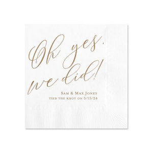 Zoom Show guides Loading product Oh Yes We Did Wedding Napkin Cocktail Napkin Design ID: 2013328 Click on swatch to see options Choose Your Product Color Active Color 3 ply 3 ply Top quality 3 ply. Dyed tissue. Sand Black Slate Platinum Dove Gray Platinum Pin Dot Dove Gray Borderless White White Borderless White Pin Dot White Scallop Ivory Ivory Borderless Mimosa Lemon Pin Dot Kiwi Kiwi Pin Dot Leaf Pin Dot Spruce Pin Dot Light Navy Olive Pin Dot Dark Turquoise Pin Dot Turquoise Powder Blue Pin Dot Lavender Lavender Pin Dot Merlot Fuchsia Candy Pink Antique Pink Pin Dot Ballet Pink Ballet Pink Borderless Convertible Red Light Coral Purple Out Until: 2025-12-04 Merlot Pin Dot Out Until: 2025-12-03 Tangerine Out Until: 2025-11-29 Linen Like* - Premium Product Linen Like* - Premium Product Absorbent. Dyed tissue. Airlaid. Premium pricing applies. Pebble Kraft Ash Grey Brown Black Charcoal Stone Gray Fog White Cream Buttercream Lemon Moss Green Hunter Green Pastel Green Lime Eucalyptus Dark Turquoise Bright Sky Powder Blue Navy Out Until: 2025-12-01 Lavender Berry Merlot Magenta Pastel Pink Pink Lipstick Red Terracotta Peach Mango Metallic Silver Metallic Gold Metallic Copper Ivory Out Until: 2025-12-03 Olive Green Out Until: 2025-12-04 Plum Out Until: 2025-11-13 Crosshatch* - Premium Product Crosshatch* - Premium Product Absorbent. Printed tissue. Airlaid. Premium pricing applies. Crosshatch Black Crosshatch Gray Crosshatch Stone Crosshatch Turquoise Crosshatch Violet Crosshatch Fuchsia Crosshatch Lipstick Red Crosshatch Key Lime Out Until: 2025-11-26 Crosshatch Green Out Until: 2025-12-03 Crosshatch Navy Out Until: 2025-11-24 Woven* - Premium Product Woven* - Premium Product Basketweave texture. Single-sided color. Premium pricing applies. Woven Sand Woven Copper Woven Black Woven Slate Woven Silver Woven Stone Woven Vanilla Woven White Woven Gold Woven Sage Woven Spruce Woven Powder Blue Woven Navy Woven Mauve Woven Convertible Red Woven Tumeric Patterned* - Premium Product Patterned* - Premium Product Exclusive FYP patterns. Single-sided color. Pindot embossed edge. Product pricing applies. Oak Wood Walnut Wood Ebony Wood Ash Wood Birch Wood Marble Sand Marble Gray Marble Navy Marble Taupe Marble Blush Ombre Black Ombre Navy Ombre Robin’s Egg Blue Ombre Rose Petal Ombre Coral Watercolor Sea Glass Watercolor Ocean Watercolor Nightfall Watercolor Sangria Watercolor Hibiscus Watercolor Rose Watercolor Sunrise Leaf Sand Leaf Fern Leaf Rain Leaf Rose Tie Dye Sunflower Tie Dye Leaf Tie Dye Turquoise Tie Dye Fuchsia Shimmer* - Premium Product Shimmer* - Premium Product Elegant European Stardream with iridescent finish. Single-sided color. Pindot embossed edge. Premium pricing applies. Champagne Soft Black Galvanized Silver Crystal White Ivory Pearl Gold Sage Navy Amethyst Choose Your Imprint Foil Color Active Color Shiny Foil Shiny Foil Metallic, lustrous finish. *Specialty patterned foil may vary on final print Shiny Champagne Shiny Sterling Silver Shiny 18 Kt Gold Shiny Kiwi / Lime Shiny Leaf Shiny Jade Shiny Royal Blue Shiny Amethyst Shiny Fuchsia Shiny Rose Quartz Shiny Rose Gold NEW Shiny Merlot Shiny Convertible Red Shiny Poppy Shiny Copper *Shiny Holographic Gold *Shiny Holographic Silver *Shiny Rainbow Matte Foil Matte Foil Flat finish. Matte NEW Chocolate Matte Black Matte Slate Gray Matte Dove Grey Matte White Matte Ivory Matte Mimosa Yellow Matte Sunflower Matte Key Lime Matte Leaf Matte Spruce Matte Teal/Peacock Matte Azure Matte Royal Blue Matte Navy Matte Amethyst Matte Pastel Pink Matte Ballet Pink Matte Fuchsia Matte Lipstick Red Matte Merlot Matte Tangerine Satin Foil Satin Foil Muted sheen, brushed finish. Satin Sterling Silver Satin 18 Kt. Gold Satin Copper Penny Satin Fuchsia Satin Lipstick Red Satin Leaf Satin Teal / Peacock Satin French Blue Satin Plum Personalize Your Text Line 1 Line 2 Personalize further with different fonts, graphics, positioning, and sizes. (Optional) Customize More Choose Your Quantity Subtotal PRICE INCLUDES: Select a Proof Option: Print As Is I confirm that I have reviewed my design and I understand it will be produced as shown and no proof will be provided. Digital Proof + $15 I would like an expert FYP designer to look at my design, make minor corrections if necessary, and send me a black and white proof before the order is produced. Orders delivered as soon as 11.11.2025. Exclusions apply. Share Your Design About This Design Oh yes, we did! Celebrate your wedding day with this custom cocktail napkin. Product Details Product Details Classic 3-ply tissue 4.75” or 5” Square, Colors Vary Signature Foil Stamp Included Volume discounts Expedited options available Product Description Product Description Our Large Print Cocktail Napkins are designed to capture attention. The large print design effortlessly becomes the focal point of your table setting, making these napkins a conversation starter. Embrace the vibrant charm of these napkins and infuse your gatherings with style that won't go unnoticed.While these napkins offer a bold visual impact, they are also designed for convenience. They are disposable, allowing for easy cleanup once the party is over. Printed on our Classic Cocktail Napkins, this product is made from premium-quality materials that offers a soft feel ensuring a comfortable touch for your guests.Due to the complexities of manufacturing, the size of the embossed border on our 3-ply napkins may vary slightly. These discrepancies are a natural part of the manufacturing process and do not impact the overall quality or functionality of the napkins. Product Options Cocktail Napkin Square Cocktail Napkin Patterned Square Cocktail Napkin Woven Square Cocktail Napkin Square Petite Napkin Square Cocktail Napkin 4 ply Square Linen Like Cocktail Napkin Related Products Cocktail Napkin Square Cocktail Napkin Patterned Square Cocktail Napkin Woven Square Cocktail Napkin Square Petite Napkin Square Cocktail Napkin 4 ply Square Linen Like Cockt