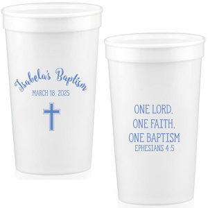 Zoom Show guides Loading product One Baptism Cup 16-oz.Stadium Cup Design ID: 1343391 Click on swatch to see options Choose Your Product Color Active Color Cup Colors Cup Colors Clear Gold Black Silver White Yellow Lime Green Teal Navy Royal Blue Powder Blue Purple Maroon Hot Pink Light Pink Red Orange Choose Your Screen Print Active Color Metallic Cup Ink Metallic Cup Ink Silver Ink Gold Ink Copper Ink Matte Cup Ink Matte Cup Ink Matte Chocolate Ink Matte Black Ink Matte Slate Gray Ink Matte White Ink Matte Sunflower Ink Matte Moss Green Ink Matte Sage Ink Matte Leaf Ink Matte Spruce Matte Teal/Peacock Ink Matte Sky Blue Ink Matte French Blue Ink Matte Royal Blue Ink Matte Navy Ink Matte Cobalt Ink Matte Lavender Ink Matte Ballet Pink Ink Matte Fuchsia Ink Matte Lipstick Red Ink Matte Merlot Ink Matte Tangerine Ink Personalize Your Text Line 1 - FRONT Line 2 - FRONT Personalize further with different fonts, graphics, positioning, and sizes. (Optional) Customize More Choose Your Quantity Subtotal PRICE INCLUDES: Select a Proof Option: Print As Is I confirm that I have reviewed my design and I understand it will be produced as shown and no proof will be provided. Digital Proof + $15 I would like an expert FYP designer to look at my design, make minor corrections if necessary, and send me a black and white proof before the order is produced. Orders delivered as soon as 12.12.2025. Exclusions apply. Share Your Design About This Design Our personalized One Baptism Cup with custom Ink Colors has a Cross graphic and is good for use in Christian Symbols themed parties and can be personalized to match your party's exact theme and tempo. Product Details Product Details Minimum order of 50 Measures 4.375" tall and 3.6" wide at the top Thin manufacturer mark may appear 0.75" to 1" from the bottom of the cup Ideal for beer BPA-free and recyclable Shatterproof and top-rack dishwasher safe Bulk discounts available Expedited shipping options available. Product Description Product Description Want a cup that’s reminiscent of fun parties, fall sports, and great times? Our stadium cups are made of sturdy colorful plastic and are perfect for birthdays, home entertaining, or casual get-togethers. Like our 22 oz. stadium cups, our 16 oz. stadium cups are made of reusable, dishwasher-safe plastic, and are available in colors to match any home or team. Use them for beer or soft drinks at your next tailgate! Product Options 16-oz.Stadium Cup 22-oz. Stadium Cup 32-oz. Stadium Cup Related Products 16-oz.Stadium Cup 22-oz. Stadium Cup 32-oz. Stadium Cup