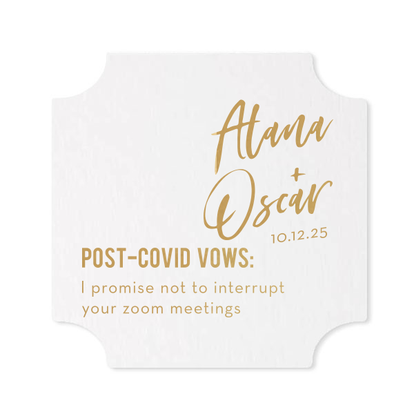 Zoom Show guides Loading product Post-Covid Vows Coaster Square Coaster Design ID: 1415289 Click on swatch to see options Choose Your Product Color Active Color Coaster Colors Coaster Colors Black White Eggshell Choose Your Imprint Foil Color Active Color Shiny Foil Shiny Foil Metallic, lustrous finish. *Specialty patterned foil may vary on final print Shiny Champagne Shiny Sterling Silver Shiny 18 Kt Gold Shiny Kiwi / Lime Shiny Leaf Shiny Jade Shiny Royal Blue Shiny Amethyst Shiny Fuchsia Shiny Rose Quartz Shiny Rose Gold NEW Shiny Merlot Shiny Convertible Red Shiny Poppy Shiny Copper *Shiny Holographic Gold *Shiny Holographic Silver *Shiny Rainbow Matte Foil Matte Foil Flat finish. Matte NEW Chocolate Matte Black Matte Slate Gray Matte Dove Grey Matte White Matte Ivory Matte Mimosa Yellow Matte Sunflower Matte Key Lime Matte Leaf Matte Spruce Matte Teal/Peacock Matte Azure Matte Royal Blue Matte Navy Matte Amethyst Matte Pastel Pink Matte Ballet Pink Matte Fuchsia Matte Lipstick Red Matte Merlot Matte Tangerine Satin Foil Satin Foil Muted sheen, brushed finish. Satin Sterling Silver Satin 18 Kt. Gold Satin Copper Penny Satin Fuchsia Satin Lipstick Red Satin Leaf Satin Teal / Peacock Satin French Blue Satin Plum Personalize Your Text Line 1 Line 2 Line 3 Line 4 Line 5 Personalize further with different fonts, graphics, positioning, and sizes. (Optional) Customize More Choose Your Quantity Subtotal PRICE INCLUDES: Select a Proof Option: Print As Is I confirm that I have reviewed my design and I understand it will be produced as shown and no proof will be provided. Digital Proof + $15 I would like an expert FYP designer to look at my design, make minor corrections if necessary, and send me a black and white proof before the order is produced. Orders delivered as soon as 11.06.2025. Exclusions apply. Share Your Design About This Design ForYourParty's chic Eggshell Square Coaster with Satin 18 Kt. Gold Foil will add that special attention to detail that cannot be overlooked. Product Details Product Details Minimum order of 50 Measures 4" square Made from reusable uncoated pulp board Bulk discounts available Expedited shipping options available. Product Description Product Description Custom Square Coasters are the perfect choice to elevate your event's ambiance while protecting your surfaces in style. These customizable coasters are a versatile addition to weddings, anniversary parties, cocktail soirées, and more. They not only shield your furniture but also serve as chic décor pieces that impress your guests. Crafted from pulp board, our Square Coasters exude premium quality, featuring a smooth texture that adds a touch of elegance to any setting and are made for multiple uses. Their square shape provides ample space for glasses and mugs of all sizes, ensuring convenience during your event. Personalize these coasters with your unique design or event details, making them a memorable keepsake for your guests. Explore our other barware. Product Options Square Coaster Deco Square Leather Coaster Related Products Square Coaster Deco Square Leather Coaster Material Pulp Board