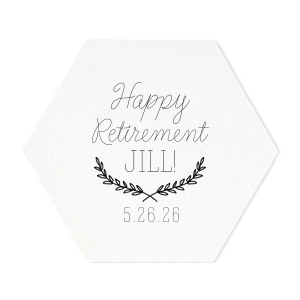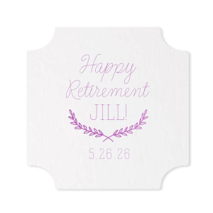 Zoom Show guides Loading product Retirement Branch Coaster Nouveau Design ID: 2944 Click on swatch to see options Choose Your Product Color Active Color Coaster Colors Coaster Colors Black White Choose Your Imprint Foil Color Active Color Shiny Foil Shiny Foil Metallic, lustrous finish. *Specialty patterned foil may vary on final print Shiny Champagne Shiny Sterling Silver Shiny 18 Kt Gold Shiny Kiwi / Lime Shiny Leaf Shiny Jade Shiny Royal Blue Shiny Amethyst Shiny Fuchsia Shiny Rose Quartz Shiny Rose Gold NEW Shiny Merlot Shiny Convertible Red Shiny Poppy Shiny Copper *Shiny Holographic Gold *Shiny Holographic Silver *Shiny Rainbow Matte Foil Matte Foil Flat finish. Matte NEW Chocolate Matte Black Matte Slate Gray Matte Dove Grey Matte White Matte Ivory Matte Mimosa Yellow Matte Sunflower Matte Key Lime Matte Leaf Matte Spruce Matte Teal/Peacock Matte Azure Matte Royal Blue Matte Navy Matte Amethyst Matte Pastel Pink Matte Ballet Pink Matte Fuchsia Matte Lipstick Red Matte Merlot Matte Tangerine Satin Foil Satin Foil Muted sheen, brushed finish. Satin Sterling Silver Satin 18 Kt. Gold Satin Copper Penny Satin Fuchsia Satin Lipstick Red Satin Leaf Satin Teal / Peacock Satin French Blue Satin Plum Personalize Your Text Line 3 Line 4 Personalize further with different fonts, graphics, positioning, and sizes. (Optional) Customize More Choose Your Quantity Subtotal PRICE INCLUDES: Select a Proof Option: Print As Is I confirm that I have reviewed my design and I understand it will be produced as shown and no proof will be provided. Digital Proof + $15 I would like an expert FYP designer to look at my design, make minor corrections if necessary, and send me a black and white proof before the order is produced. Orders delivered as soon as 12.19.2025. Exclusions apply. Share Your Design About This Design ForYourParty's chic Silver with Black back Nouveau Coaster with Satin Plum Foil Color has a Branch Frame 2 graphic and is good for use in Floral themed parties and will make your guests swoon. Personalize your party's theme today. Product Details Product Details Minimum order of 50 Measures 4" wide Made from reusable uncoated pulp board Bulk discounts available Expedited shipping options available. Product Description Product Description Fancy Coasters are the perfect companion for any barware need. The nouveau shape of the coaster adds a bit of flair for your cocktail party, wedding, anniversary, engagement party or reunion. Whether you’re sipping a Manhattan, Whiskey Sour, or a signature cocktail, these coasters are the perfect accompaniment to elevate your bar accessories to new heights. The fancy coaster is designed on uncoated pulp board making it durable for several reuses. One side of the coaster is kraft color and the other side is blush. You get to decide which color is used to have writing and artwork added to it. The coaster will keep your furniture protected as guests place down drinks as they are chatting with family and/or friends. Once used, you can keep them as a memento or discard them, making cleanup a breeze. Product Options Nouveau Deco Hexagon Coaster Round 4" Related Products Nouveau Deco Hexagon Coaster Round 4" Material Pulp Board