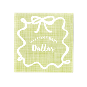 Zoom Show guides Loading product Ribbon Frame Welcome Baby Napkin Cocktail Napkin Design ID: 2777841 Click on swatch to see options Choose Your Product Color Active Color 3 ply 3 ply Top quality 3 ply. Dyed tissue. Sand Black Slate Dove Gray Platinum Pin Dot Dove Gray Borderless White White Borderless White Pin Dot White Scallop Ivory Ivory Borderless Kiwi Pin Dot Leaf Pin Dot Spruce Pin Dot Light Navy Olive Pin Dot Dark Navy Pin Dot Dark Turquoise Pin Dot Turquoise Powder Blue Pin Dot Lavender Pin Dot Merlot Pin Dot Antique Pink Pin Dot Ballet Pink Ballet Pink Borderless Convertible Red Light Coral Tangerine Pin Dot Platinum Out Until: 2026-05-20 Mimosa Out Until: 2026-05-23 Lemon Pin Dot Out Until: 2026-05-13 Kiwi Out Until: 2026-05-20 Lavender Out Until: 2026-04-17 Merlot Out Until: 2026-05-13 Fuchsia Out Until: 2026-05-27 Linen Like* - Premium Product Linen Like* - Premium Product Absorbent. Dyed tissue. Airlaid. Premium pricing applies. Pebble Kraft Ash Grey Brown Black Stone Gray Fog White Ivory Cream Olive Green Hunter Green Pastel Green Lime Eucalyptus Dark Turquoise Bright Sky Powder Blue Navy Lavender Magenta Pastel Pink Pink Lipstick Red Terracotta Peach Mango Metallic Silver Metallic Gold Metallic Copper Charcoal Out Until: 2026-05-23 Buttercream Out Until: 2026-05-24 Lemon Out Until: 2026-05-19 Moss Green Out Until: 2026-05-28 Berry Out Until: 2026-05-15 Merlot Crosshatch* - Premium Product Crosshatch* - Premium Product Absorbent. Printed tissue. Airlaid. Premium pricing applies. Crosshatch Black Crosshatch Gray Crosshatch Stone Crosshatch Key Lime Crosshatch Green Crosshatch Turquoise Crosshatch Navy Crosshatch Violet Crosshatch Fuchsia Crosshatch Lipstick Red Woven* - Premium Product Woven* - Premium Product Basketweave texture. Single-sided color. Premium pricing applies. Woven Sand Woven Copper Woven Black Woven Slate Woven Silver Woven Stone Woven Vanilla Woven White Woven Gold Woven Sage Woven Spruce Woven Powder Blue Woven Navy Woven Mauve Woven Convertible Red Woven Tumeric Patterned* - Premium Product Patterned* - Premium Product Exclusive FYP patterns. Single-sided color. Pindot embossed edge. Product pricing applies. Oak Wood Walnut Wood Ebony Wood Ash Wood Birch Wood Marble Sand Marble Gray Marble Navy Marble Taupe Marble Blush Ombre Black Ombre Navy Ombre Robin’s Egg Blue Ombre Rose Petal Ombre Coral Watercolor Sea Glass Watercolor Ocean Watercolor Nightfall Watercolor Sangria Watercolor Hibiscus Watercolor Rose Watercolor Sunrise Leaf Sand Leaf Fern Leaf Rain Leaf Rose Tie Dye Sunflower Tie Dye Leaf Tie Dye Turquoise Tie Dye Fuchsia Shimmer* - Premium Product Shimmer* - Premium Product Elegant European Stardream with iridescent finish. Single-sided color. Pindot embossed edge. Premium pricing applies. Champagne Soft Black Galvanized Silver Crystal White Ivory Pearl Gold Sage Navy Amethyst Out Until: 2026-05-22 Choose Your Imprint Foil Color Active Color Shiny Foil Shiny Foil Metallic, lustrous finish. *Specialty patterned foil may vary on final print Shiny Champagne Shiny Sterling Silver Shiny 18 Kt Gold Shiny Kiwi / Lime Shiny Leaf Shiny Spruce Shiny Jade Shiny Royal Blue Shiny Amethyst Shiny Fuchsia Shiny Rose Quartz Shiny Rose Gold NEW Shiny Merlot Shiny Convertible Red Shiny Poppy Shiny Copper *Shiny Holographic Gold *Shiny Holographic Silver *Shiny Rainbow Matte Foil Matte Foil Flat finish. Matte NEW Chocolate Matte Black Matte Slate Gray Matte Dove Grey Matte White Matte Ivory Matte Mimosa Yellow Matte Sunflower Matte Key Lime Matte Leaf Matte Teal/Peacock Matte Azure Matte Royal Blue Matte Navy Matte Amethyst Matte Pastel Pink Matte Ballet Pink Matte Fuchsia Matte Lipstick Red Matte Merlot Matte Tangerine Satin Foil Satin Foil Muted sheen, brushed finish. Satin Sterling Silver Satin 18 Kt. Gold Satin Copper Penny Satin Fuchsia Satin Lipstick Red Satin Leaf Satin Teal / Peacock Satin French Blue Satin Plum Personalize Your Text Line 1 Line 2 Personalize further with different fonts, graphics, positioning, and sizes. (Optional) Customize More Choose Your Quantity Subtotal PRICE INCLUDES: Select a Proof Option: Print As Is I confirm that I have reviewed my design and I understand it will be produced as shown and no proof will be provided. Digital Proof + $15 I would like an expert FYP designer to look at my design, make minor corrections if necessary, and send me a black and white proof before the order is produced. Orders delivered as soon as 05.12.2026. Exclusions apply. Share Your Design About This Design Welcome the newest addition with the Ribbon Frame Welcome Baby Napkin, customizable with the baby's name, and adorned with the affectionate phrase "welcome baby," set within a ribbon-crafted frame and topped with a charming bow graphic. Perfect for stylish and tender baby shower celebrations. Product Details Product Details Classic 3-ply tissue 4.75” or 5” Square, Colors Vary Signature Foil Stamp Included Volume discounts Expedited options available Product Description Product Description Our Large Print Cocktail Napkins are designed to capture attention. The large print design effortlessly becomes the focal point of your table setting, making these napkins a conversation starter. Embrace the vibrant charm of these napkins and infuse your gatherings with style that won't go unnoticed.While these napkins offer a bold visual impact, they are also designed for convenience. They are disposable, allowing for easy cleanup once the party is over. Printed on our Classic Cocktail Napkins, this product is made from premium-quality materials that offers a soft feel ensuring a comfortable touch for your guests.Due to the complexities of manufacturing, the size of the embossed border on our 3-ply napkins may vary slightly. These discrepancies are a natural part of the manufacturing process and do not impact the overall quality or functionality of the napkins. Product Options Cocktail Napkin Square Crosshatch Cocktail Napkin Square Petite Napkin Woven Square Co