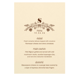 Zoom Show guides Loading product Rose Laurel Menu Menu 5"x7" Design ID: 9701 Click on swatch to see options Choose Your Paper Color Active Color Natural Natural Smooth, matte finish. Double-sided color. 100lb+ cover stock. Natural NEW Sand Natural Khaki Natural NEW Kraft Natural Mushroom Natural NEW Chocolate Natural Black Natural Slate Natural Gray Natural Smoke Natural NEW Frost White Natural Ivory Natural Olive Natural Dark Sage Natural Eucalyptus Natural Fern Natural Leaf Natural Spruce Natural Dark Teal Natural Royal Blue Natural NEW Amethyst Natural Scarlet Natural Antique Rose Natural Terracotta Natural Harvest Shiny Shiny Smooth, high-gloss finish. Single-sided color. 100lb+ cover stock. Shiny Black Shiny White Shiny Navy Blue Shiny Fuchsia Shiny Convertible Red Linen Linen Slightly textured, matte finish. Double-sided color. 100lb+ cover stock. Linen Convertible Red Linen Black Linen Slate Linen Antique Gray Linen White Linen Eggshell Linen Ivory Linen Pearl Cream Linen Navy Blue Stardream Stardream European Stardream with iridescent finish. Double-sided color. 105lb+ cover stock. Stardream NEW Black Stardream Galvanized Silver Stardream Silver Stardream Crystal White Stardream Ivory Stardream 18k Gold Stardream Champagne Stardream Old Gold Stardream Super Gold Stardream Orange Stardream Rose Gold Stardream Blush Stardream Ballet Pink Stardream Violet Stardream Lavender Stardream Denim Stardream NEW Peacock Stardream Robin's Egg Blue Poptone Poptone Soft felt texture with matte finish. Double-sided color. 100lb+ cover stock. Poptone Ballet Pink Poptone NEW Fuchsia Poptone Convertible Red Poptone Tangerine Poptone Sunflower Poptone Yellow Poptone Mimosa Poptone Mint Poptone Kiwi Poptone Robin’s Egg Blue Poptone Dark Turquoise Poptone Sky Blue Poptone NEW French Blue Poptone Lavender Poptone Lilac Textured Textured Variety of textures. Single-sided color. 110lb+ cover stock. Oak Wood Walnut Wood Ebony Wood Ash Wood Birch Wood Leather Like Tan Leather Like Black Leather Like Pearl Leather Like White Leather Like Night Blue Leather Like Lipstick Red Horizontal White Glitter* - Premium Product Glitter* - Premium Product Sparkly with a slightly textured finish. Single-sided with a white back and 100lb+ cover stock. Premium pricing applies. Glitter NEW Black Glitter NEW Silver Glitter Champagne Glitter Rose Copper Glitter Night Fall Patterned* - Premium Product Patterned* - Premium Product Smooth, matte finish. Single-sided pattern with white back. Pattern and color may vary between products. 100 lb paper. Premium pricing applies. Marble Sand Marble Gray Marble Navy Marble Taupe Marble Blush Watercolor Seaglass Watercolor Ocean Watercolor Night Fall Watercolor Sangria Watercolor Hibiscus Watercolor Rose Watercolor Sunrise Leaf Sand Leaf Fern Leaf Rain Leaf Rose Blank Stock Blank Stock Blank Stock Choose Your Imprint Foil Color Active Color Shiny Foil Shiny Foil Metallic, lustrous finish. *Specialty patterned foil may vary on final print Shiny Champagne Shiny Sterling Silver Shiny 18 Kt Gold Shiny Kiwi / Lime Shiny Leaf Shiny Spruce Shiny Jade Shiny Royal Blue Shiny Amethyst Shiny Fuchsia Shiny Rose Quartz Shiny Rose Gold NEW Shiny Merlot Shiny Convertible Red Shiny Poppy Shiny Copper *Shiny Holographic Gold *Shiny Holographic Silver *Shiny Rainbow Matte Foil Matte Foil Flat finish. Matte NEW Chocolate Matte Black Matte Slate Gray Matte Dove Grey Matte White Matte Ivory Matte Mimosa Yellow Matte Sunflower Matte Key Lime Matte Leaf Matte Teal/Peacock Matte Azure Matte Royal Blue Matte Navy Matte Amethyst Matte Pastel Pink Matte Ballet Pink Matte Fuchsia Matte Lipstick Red Matte Merlot Matte Tangerine Satin Foil Satin Foil Muted sheen, brushed finish. Satin Sterling Silver Satin 18 Kt. Gold Satin Copper Penny Satin Fuchsia Satin Lipstick Red Satin Leaf Satin Teal / Peacock Satin French Blue Satin Plum Personalize Your Text Line 1 Line 2 Line 3 Line 4 Line 5 Line 6 Line 7 Line 8 Line 9 Line 10 Line 11 Line 12 Line 13 Personalize further with different fonts, graphics, positioning, and sizes. (Optional) Customize More Choose Your Quantity Subtotal PRICE INCLUDES: Select a Proof Option: Print As Is I confirm that I have reviewed my design and I understand it will be produced as shown and no proof will be provided. Digital Proof + $15 I would like an expert FYP designer to look at my design, make minor corrections if necessary, and send me a black and white proof before the order is produced. Orders delivered as soon as 05.04.2026. Exclusions apply. Share Your Design About This Design Present a feast for the eyes with the Rose Laurel Menu, crowned by an arch of hand-drawn blooms and foliage. Thirteen lines await your gourmet selections, framing each course with an air of elegance befitting the finest gatherings. Product Details Product Details Minimum order of 25 Measures 5" wide by 7" high Signature foil stamp included Bulk discounts available Expedited shipping options available. Product Description Product Description Our Custom Classic Menu 4.75" x 6.75" is the perfect addition to elevate your party experience! Tailored to your unique theme, this customizable menu adds a touch of elegance and personalization to your celebrations. Whether it's a lavish wedding reception, a milestone birthday bash, or a corporate gala, our Classic Menu enhances the aesthetic of your event. Choose from a wide range of designs and fonts to create a menu that perfectly complements your style. Explore our customizable options at For Your Party to make your event truly unforgettable. Crafted with the utmost quality and attention to detail, our Classic Menu boasts a premium texture that exudes sophistication. Printed on durable, high-grade paper, it withstands the test of time while maintaining its pristine look. With its compact size, it's both convenient to handle and easy to display, ensuring a seamless experience for both hosts and guests. The Classic Menu not only adds an air of refinement to your event bu