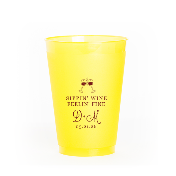 Zoom Show guides Loading product Sippin' Wine Cup 10-oz.Frosted Cup Design ID: 287513 Click on swatch to see options Choose Your Screen Print Active Color Metallic Cup Ink Metallic Cup Ink Silver Ink Gold Ink Copper Ink Matte Cup Ink Matte Cup Ink Matte Chocolate Ink Matte Black Ink Matte Slate Gray Ink Matte White Ink Matte Sunflower Ink Matte Moss Green Ink Matte Sage Ink Matte Leaf Ink Matte Spruce Ink Matte Teal/Peacock Ink Matte Sky Blue Ink Matte French Blue Ink Matte Royal Blue Ink Matte Navy Ink Matte Cobalt Ink Matte Lavender Ink Matte Ballet Pink Ink Matte Fuchsia Ink Matte Lipstick Red Ink Matte Merlot Ink Matte Tangerine Ink Personalize Your Text Line 1 Line 2 Personalize further with different fonts, graphics, positioning, and sizes. (Optional) Customize More Choose Your Quantity Subtotal PRICE INCLUDES: Select a Proof Option: Print As Is I confirm that I have reviewed my design and I understand it will be produced as shown and no proof will be provided. Digital Proof + $15 I would like an expert FYP designer to look at my design, make minor corrections if necessary, and send me a black and white proof before the order is produced. Orders delivered as soon as 05.05.2026. Exclusions apply. Share Your Design About This Design Custom Matte Dark Magenta Ink 10 oz Frost Flex Cup with Matte Dark Magenta Ink Cup Ink Colors has a Wine Toast graphic and is good for use in Drinks themed parties and are a must-have for your next event—whatever the celebration! Product Details Product Details Minimum order of 50 Measures 3.75" tall and 3" wide at the top Holds 9.56 oz flush fill volume Perfect for wine and signature drinks BPA-free and recyclable Shatterproof and top-rack dishwasher safe Bulk discounts available Expedited shipping options available. Product Description Product Description Custom printed frost flex cups from For Your Party are a classic standby for any event, from weddings to birthdays. Their translucent plastic complements any drink or decor, and are reusable, so your guests can have a keepsake from your special day. Like our 9 oz. frost flex cups, our 10 oz. frost flex cups are made in the USA, BPA free, and can be hand-washed again and again to remember your event. Our 10 oz. size is taller and narrower than our 9 oz, great for wine or drinks on the rocks, and has a flush fill volume of 9.6 oz. Product Options 10-oz.Frosted Cup 12-oz. Frosted Cup 12oz Frost Flex Color Related Products 10-oz.Frosted Cup 12-oz. Frosted Cup 12oz Frost Flex Color