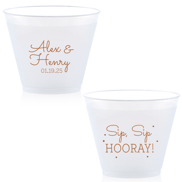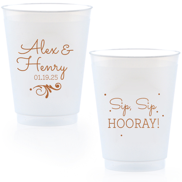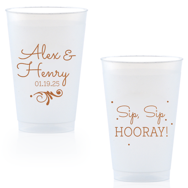 Zoom Show guides Loading product Spring Fever Flourish Cup 12-oz. Frosted Cup Design ID: 465669 Click on swatch to see options Choose Your Screen Print Active Color Metallic Cup Ink Metallic Cup Ink Silver Ink Gold Ink Copper Ink Matte Cup Ink Matte Cup Ink Matte Chocolate Ink Matte Black Ink Matte Slate Gray Ink Matte White Ink Matte Sunflower Ink Matte Moss Green Ink Matte Sage Ink Matte Leaf Ink Matte Spruce Matte Teal/Peacock Ink Matte Sky Blue Ink Matte French Blue Ink Matte Royal Blue Ink Matte Navy Ink Matte Cobalt Ink Matte Lavender Ink Matte Ballet Pink Ink Matte Fuchsia Ink Matte Lipstick Red Ink Matte Merlot Ink Matte Tangerine Ink Personalize Your Text Line 1 Line 2 Line 3 Personalize further with different fonts, graphics, positioning, and sizes. (Optional) Customize More Choose Your Quantity Subtotal PRICE INCLUDES: Select a Proof Option: Print As Is I confirm that I have reviewed my design and I understand it will be produced as shown and no proof will be provided. Digital Proof + $15 I would like an expert FYP designer to look at my design, make minor corrections if necessary, and send me a black and white proof before the order is produced. Orders delivered as soon as 11.06.2025. Exclusions apply. Share Your Design About This Design ForYourParty's personalized 12 oz Frosted Plastic Cup with Copper Ink Cup Ink Colors has a Decorative Flourish graphic and is good for use in Engagement, Bridal Shower and Wedding themed parties and couldn't be more perfect. It's time to show off your impeccable taste. Product Details Product Details Minimum order of 50 Measures 4.25" tall and 3.25" wide at the top Holds 11.10 oz flush fill volume Perfect for mixed drinks and signature cocktails BPA-free and recyclable Shatterproof and top-rack dishwasher safe Bulk discounts available Expedited shipping options available. Product Description Product Description Frost flex cups from For Your Party are a perfect accessory for any event, from weddings to birthdays. Their translucent plastic complements any drink or color scheme, and can have any art you can imagine. They’re also reusable, so your guests can have a keepsake from your special day. Like our 10 oz. frost flex cups, our 12 oz. frost flex cups are made in the USA, BPA free, and can be hand-washed again and again to remember your event. Our 12 oz. size has the same shape as our 10 oz. size, and is perfect for when you want just a little more space. It has a flush fill volume of 11.1 oz. Product Options 12-oz. Frosted Cup 14-oz.Frosted Cup 16-oz. Frosted Cup 9-oz. Frosted Cup 10-oz.Frosted Cup 24-oz. Frosted Cup Related Products 12-oz. Frosted Cup 14-oz.Frosted Cup 16-oz. Frosted Cup 9-oz. Frosted Cup 10-oz.Frosted Cup 24-oz. Frosted Cup