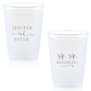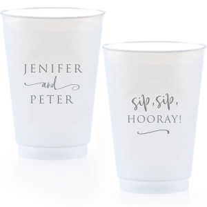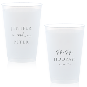 Zoom Show guides Loading product Stacked and Swirled/Sip Sip Hooray Cup 12-oz. Frosted Cup Design ID: 393451 Click on swatch to see options Choose Your Screen Print Active Color Metallic Cup Ink Metallic Cup Ink Silver Ink Gold Ink Copper Ink Matte Cup Ink Matte Cup Ink Matte Chocolate Ink Matte Black Ink Matte Slate Gray Ink Matte White Ink Matte Sunflower Ink Matte Moss Green Ink Matte Sage Ink Matte Leaf Ink Matte Spruce Ink Matte Teal/Peacock Ink Matte Sky Blue Ink Matte French Blue Ink Matte Royal Blue Ink Matte Navy Ink Matte Cobalt Ink Matte Lavender Ink Matte Ballet Pink Ink Matte Fuchsia Ink Matte Lipstick Red Ink Matte Merlot Ink Matte Tangerine Ink Personalize Your Text Line 1 - Front Line 2 - Front Personalize further with different fonts, graphics, positioning, and sizes. (Optional) Customize More Choose Your Quantity Subtotal PRICE INCLUDES: Select a Proof Option: Print As Is I confirm that I have reviewed my design and I understand it will be produced as shown and no proof will be provided. Digital Proof + $15 I would like an expert FYP designer to look at my design, make minor corrections if necessary, and send me a black and white proof before the order is produced. Orders delivered as soon as 04.28.2026. Exclusions apply. Share Your Design About This Design Raise your cups to cheer with the Stacked and Swirled/Sip Sip Hooray Frosted Cup—a design that celebrates love with elegance and a playful twist. Names are gracefully stacked, connected by a swirling flourish, while the reverse side exclaims "Sip Sip Hooray!", infusing joy into every toast. Product Details Product Details Minimum order of 50 Measures 4.25" tall and 3.25" wide at the top Holds 11.10 oz flush fill volume Perfect for mixed drinks and signature cocktails BPA-free and recyclable Shatterproof and top-rack dishwasher safe Bulk discounts available Expedited shipping options available. Product Description Product Description Frost flex cups from For Your Party are a perfect accessory for any event, from weddings to birthdays. Their translucent plastic complements any drink or color scheme, and can have any art you can imagine. They’re also reusable, so your guests can have a keepsake from your special day. Like our 10 oz. frost flex cups, our 12 oz. frost flex cups are made in the USA, BPA free, and can be hand-washed again and again to remember your event. Our 12 oz. size has the same shape as our 10 oz. size, and is perfect for when you want just a little more space. It has a flush fill volume of 11.1 oz. Product Options 12-oz. Frosted Cup 9-oz. Frosted Cup 10-oz.Frosted Cup 14-oz.Frosted Cup 20-oz. Frosted Cup Related Products 12-oz. Frosted Cup 9-oz. Frosted Cup 10-oz.Frosted Cup 14-oz.Frosted Cup 20-oz. Frosted Cup