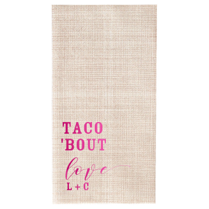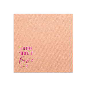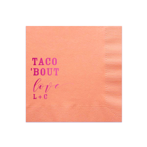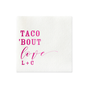 Zoom Show guides Loading product Taco Love Napkin Square Cocktail Napkin Design ID: 165006 Click on swatch to see options Choose Your Product Color Active Color 3 ply 3 ply Top quality 3 ply. Dyed tissue. Sand Black Slate Platinum Pin Dot Dove Gray Dove Gray Borderless White White Borderless White Pin Dot White Scallop Ivory Ivory Borderless Kiwi Pin Dot Spruce Pin Dot Olive Pin Dot Dark Navy Pin Dot Light Navy Dark Turquoise Pin Dot Turquoise Powder Blue Pin Dot Lavender Pin Dot Merlot Pin Dot Antique Pink Pin Dot Ballet Pink Ballet Pink Borderless Convertible Red Light Coral Tangerine Pin Dot Platinum Out Until: 2026-04-18 Mimosa Out Until: 2026-05-04 Lemon Pin Dot Out Until: 2026-04-13 Kiwi Out Until: 2026-04-14 Leaf Pin Dot Out Until: 2026-04-25 Lavender Out Until: 2026-04-17 Merlot Out Until: 2026-04-05 Fuchsia Out Until: 2026-04-21 Candy Pink Out Until: 2026-05-01 Linen Like* - Premium Product Linen Like* - Premium Product Absorbent. Dyed tissue. Airlaid. Premium pricing applies. Pebble Kraft Metallic Copper Ash Grey Brown Black Charcoal Stone Gray Metallic Silver Fog White Ivory Cream Buttercream Metallic Gold Lemon Moss Green Olive Green Hunter Green Pastel Green Lime Eucalyptus Dark Turquoise Bright Sky Powder Blue Navy Lavender Berry Magenta Pink Pastel Pink Lipstick Red Terracotta Peach Mango Merlot Crosshatch* - Premium Product Crosshatch* - Premium Product Absorbent. Printed tissue. Airlaid. Premium pricing applies. Crosshatch Black Crosshatch Gray Crosshatch Stone Crosshatch Key Lime Crosshatch Green Crosshatch Navy Crosshatch Turquoise Out Until: 2026-05-10 Crosshatch Violet Out Until: 2026-05-03 Crosshatch Fuchsia Out Until: 2026-01-29 Crosshatch Lipstick Red Out Until: 2026-04-16 Woven* - Premium Product Woven* - Premium Product Basketweave texture. Single-sided color. Premium pricing applies. Woven Sand Woven Copper Woven Black Woven Slate Woven Silver Woven Stone Woven Vanilla Woven White Woven Gold Woven Sage Woven Spruce Woven Powder Blue Woven Navy Woven Mauve Woven Convertible Red Woven Tumeric Patterned* - Premium Product Patterned* - Premium Product Exclusive FYP patterns. Single-sided color. Pindot embossed edge. Product pricing applies. Oak Wood Walnut Wood Ebony Wood Ash Wood Birch Wood Marble Sand Marble Gray Marble Navy Marble Taupe Marble Blush Ombre Black Ombre Navy Ombre Robin’s Egg Blue Ombre Rose Petal Ombre Coral Watercolor Sea Glass Watercolor Ocean Watercolor Nightfall Watercolor Sangria Watercolor Hibiscus Watercolor Rose Watercolor Sunrise Leaf Sand Leaf Fern Leaf Rain Leaf Rose Tie Dye Sunflower Tie Dye Leaf Tie Dye Turquoise Tie Dye Fuchsia Shimmer* - Premium Product Shimmer* - Premium Product Elegant European Stardream with iridescent finish. Single-sided color. Pindot embossed edge. Premium pricing applies. Champagne Soft Black Galvanized Silver Crystal White Ivory Pearl Gold Sage Navy Amethyst Herringbone* - Premium Product Herringbone* - Premium Product Absorbent. Printed Herringbone pattern. Airlaid. Premium pricing applies. Herringbone Gray Onyx Herringbone Vanilla Mocha Out Until: 2026-04-21 Choose Your Imprint Foil Color Active Color Shiny Foil Shiny Foil Metallic, lustrous finish. *Specialty patterned foil may vary on final print Shiny Champagne Shiny Sterling Silver Shiny 18 Kt Gold Shiny Kiwi / Lime Shiny Leaf Shiny Spruce Shiny Jade Shiny Royal Blue Shiny Amethyst Shiny Fuchsia Shiny Rose Quartz Shiny Rose Gold NEW Shiny Merlot Shiny Convertible Red Shiny Poppy Shiny Copper *Shiny Holographic Gold *Shiny Holographic Silver *Shiny Rainbow Matte Foil Matte Foil Flat finish. Matte NEW Chocolate Matte Black Matte Slate Gray Matte Dove Grey Matte White Matte Ivory Matte Mimosa Yellow Matte Sunflower Matte Key Lime Matte Leaf Matte Teal/Peacock Matte Azure Matte Royal Blue Matte Navy Matte Amethyst Matte Pastel Pink Matte Ballet Pink Matte Fuchsia Matte Lipstick Red Matte Merlot Matte Tangerine Satin Foil Satin Foil Muted sheen, brushed finish. Satin Sterling Silver Satin 18 Kt. Gold Satin Copper Penny Satin Fuchsia Satin Lipstick Red Satin Leaf Satin Teal / Peacock Satin French Blue Satin Plum Personalize Your Text Line 1 Personalize further with different fonts, graphics, positioning, and sizes. (Optional) Customize More Choose Your Quantity Subtotal PRICE INCLUDES: Select a Proof Option: Print As Is I confirm that I have reviewed my design and I understand it will be produced as shown and no proof will be provided. Digital Proof + $15 I would like an expert FYP designer to look at my design, make minor corrections if necessary, and send me a black and white proof before the order is produced. Orders delivered as soon as 04.22.2026. Exclusions apply. Share Your Design About This Design The Taco Love Napkin is a witty and fun design. This design playfully makes the whimsical foodie declaration: "Taco 'Bout Love!" It's a clever, upbeat nod of bold block and lively script fonts, inviting guests to savor both the food and the sweet romance in the air. Product Details Product Details Classic 3-ply tissue, 4.75” or 5” square Colors vary Signature foil stamp included Bulk discounts available Expedited shipping options available. Product Description Product Description Classic Cocktail Napkins are the perfect companion for any event. Add a touch of refinement to your cocktail parties, weddings, or birthday celebrations. Whether you're sipping a Martini, Old Fashioned, or a signature cocktail, these beverage napkins are the perfect accompaniment to elevate your drink service to new heights.Traditionally designed with a classic pleated edge, highly absorbent, durable, crafted from high-quality, premium-grade paper, our Classic Cocktail Napkins are an excellent, timeless choice. They are soft to the touch, keeping your guests' hands dry and your furniture protected. Once used, simply discard them, making cleanup a breeze. Explore our Cocktail Napkins Collection to find the perfect option for your event. Due to the complexities of manufacturing