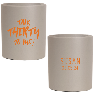 Zoom Show guides Loading product Talk Thirty to Me Birthday Can Cooler Flat Can Cooler Design ID: 208901 Click on swatch to see options Choose Your Product Color Active Color Cup Colors Cup Colors Pebble Khaki Dark Taupe Chocolate Brown Black Slate Gray Gray Frost White Yellow Sunflower Neon Green Green Apple Spring Green Leaf Dark Green Dark Olive Sage Mint Dark Teal Robin's Egg Blue Neon Blue Powder Blue Cerulean Royal Blue Navy Purple Orchid Raspberry Neon Pink Hot Pink Vintage Pink Dusty Pink Burgundy Rust Red Bright Coral Coral Orange Sherbert Orange Burnt Orange Country Camo Camo Pink Camo Choose Your Screen Print Active Color Metallic Cup Ink Metallic Cup Ink Silver Ink Gold Ink Copper Ink Matte Cup Ink Matte Cup Ink Matte Chocolate Ink Matte Black Ink Matte Slate Gray Ink Matte White Ink Matte Sunflower Ink Matte Moss Green Ink Matte Sage Ink Matte Leaf Ink Matte Spruce Matte Teal/Peacock Ink Matte Sky Blue Ink Matte French Blue Ink Matte Royal Blue Ink Matte Navy Ink Matte Cobalt Ink Matte Lavender Ink Matte Ballet Pink Ink Matte Fuchsia Ink Matte Lipstick Red Ink Matte Merlot Ink Matte Tangerine Ink Personalize Your Text Line 1 - Back Line 2 -Back Personalize further with different fonts, graphics, positioning, and sizes. (Optional) Customize More Choose Your Quantity Subtotal PRICE INCLUDES: Select a Proof Option: Print As Is I confirm that I have reviewed my design and I understand it will be produced as shown and no proof will be provided. Digital Proof + $15 I would like an expert FYP designer to look at my design, make minor corrections if necessary, and send me a black and white proof before the order is produced. Orders delivered as soon as 11.19.2025. Exclusions apply. Share Your Design About This Design Keep your drinks cool and your party cooler with the Talk Thirty to Me Birthday Can Cooler. This playful design embraces the milestone with the popular phrase "Talk Thirty to Me," turning the entry into "serious adulting" into a fun, festive toast. The Big 3-Oh Never Tasted So Good! Product Details Product Details Minimum order of 12 Top-quality neoprene Measures 4" tall and 3.75" wide Screen printed Reusable Bulk discounts available Expedited shipping options available. Product Description Product Description Want to make your party unforgettable? Custom printed can coolers give any party a dose of fun. They’re of course great for home entertaining, but we also love them as an unexpected souvenir for even the most formal weddings. Like our slim can coolers, our flat can coolers are made of premium neoprene, and pack flat for easy travel. They’re customizable on both sides and can be used again and again to keep your drinks cold. We’ve got colors for every party or event, so take a look today! Product Options Flat Can Cooler Round Can Cooler Slim Can Cooler Related Products Flat Can Cooler Round Can Cooler Slim Can Cooler