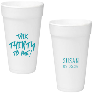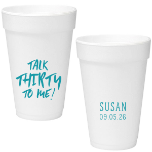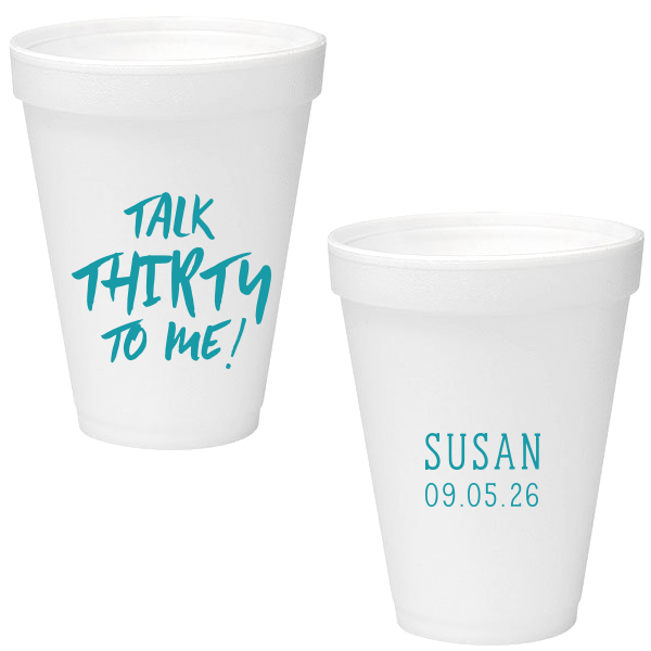 Zoom Show guides Loading product Talk Thirty to Me Birthday Cup 12-oz. Styrofoam Cup Design ID: 208882 Click on swatch to see options Choose Your Screen Print Active Color Matte Cup Ink Matte Cup Ink Matte Black Ink Matte Slate Gray Ink Matte Moss Green Ink Matte Leaf Ink Matte Spruce Matte Sky Blue Ink Matte Royal Blue Ink Matte Navy Ink Matte Cobalt Ink Matte Ballet Pink Ink Matte Fuchsia Ink Matte Lipstick Red Ink Matte Merlot Ink Metallic Cup Ink Metallic Cup Ink Silver Ink Gold Ink Copper Ink Personalize Your Text Line 1 - Back Line 2 - Back Personalize further with different fonts, graphics, positioning, and sizes. (Optional) Customize More Choose Your Quantity Subtotal PRICE INCLUDES: Select a Proof Option: Print As Is I confirm that I have reviewed my design and I understand it will be produced as shown and no proof will be provided. Digital Proof + $15 I would like an expert FYP designer to look at my design, make minor corrections if necessary, and send me a black and white proof before the order is produced. Orders delivered as soon as 12.19.2025. Exclusions apply. Share Your Design About This Design Celebrate the big 3-0 with the Talk Thirty to Me Birthday Cup. This playful design embraces the milestone with the popular phrase "Talk Thirty to Me," turning the fear of the unknown into a fun, festive toast. Personalize the reverse side with the celebrant’s name and event date for a memorable celebration! Product Details Product Details Minimum order of 50 Measures 4.5" tall and 3.5" wide at the top Ideal for coffee and tea Recyclable Bulk discounts available Expedited shipping options available. Product Description Product Description Want the customization of our custom cups, but easier clean-up? Our styrofoam cups are the answer. Custom printed cups are great for your bachelorette party, or any time where you’re on the go and can’t stop to clean! Like their frost flex siblings, these are a compact 12 oz. package that can be customized with your art. Recyclable styrofoam is great for convenience and versatility—these cups can serve up hot or cold drinks, and no washing needed. Try them for coffee or mixed drinks at your next party! Product Options 12-oz. Styrofoam Cup 16-oz. Styrofoam Cup 20-oz. Styrofoam Cup Related Products 12-oz. Styrofoam Cup 16-oz. Styrofoam Cup 20-oz. Styrofoam Cup