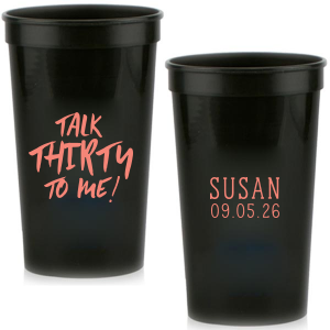 Zoom Show guides Loading product Talk Thirty To Me Cup 16-oz.Stadium Cup Design ID: 208856 Click on swatch to see options Choose Your Product Color Active Color Cup Colors Cup Colors Clear Gold Black Silver White Yellow Lime Green Teal Navy Royal Blue Powder Blue Purple Maroon Hot Pink Light Pink Red Orange Choose Your Screen Print Active Color Metallic Cup Ink Metallic Cup Ink Silver Ink Gold Ink Copper Ink Matte Cup Ink Matte Cup Ink Matte Chocolate Ink Matte Black Ink Matte Slate Gray Ink Matte White Ink Matte Sunflower Ink Matte Moss Green Ink Matte Sage Ink Matte Leaf Ink Matte Spruce Matte Teal/Peacock Ink Matte Sky Blue Ink Matte French Blue Ink Matte Royal Blue Ink Matte Navy Ink Matte Cobalt Ink Matte Lavender Ink Matte Ballet Pink Ink Matte Fuchsia Ink Matte Lipstick Red Ink Matte Merlot Ink Matte Tangerine Ink Personalize Your Text Line 1 - Back Line 2 - Back Personalize further with different fonts, graphics, positioning, and sizes. (Optional) Customize More Choose Your Quantity Subtotal PRICE INCLUDES: Select a Proof Option: Print As Is I confirm that I have reviewed my design and I understand it will be produced as shown and no proof will be provided. Digital Proof + $15 I would like an expert FYP designer to look at my design, make minor corrections if necessary, and send me a black and white proof before the order is produced. Orders delivered as soon as 12.22.2025. Exclusions apply. Share Your Design About This Design Our custom Black 16 oz Stadium Cup with Matte Light Coral Ink Cup Ink Colors can be customized to complement every last detail of your party. Product Details Product Details Minimum order of 50 Measures 4.375" tall and 3.6" wide at the top Thin manufacturer mark may appear 0.75" to 1" from the bottom of the cup Ideal for beer BPA-free and recyclable Shatterproof and top-rack dishwasher safe Bulk discounts available Expedited shipping options available. Product Description Product Description Want a cup that’s reminiscent of fun parties, fall sports, and great times? Our stadium cups are made of sturdy colorful plastic and are perfect for birthdays, home entertaining, or casual get-togethers. Like our 22 oz. stadium cups, our 16 oz. stadium cups are made of reusable, dishwasher-safe plastic, and are available in colors to match any home or team. Use them for beer or soft drinks at your next tailgate! Product Options 16-oz.Stadium Cup 22-oz. Stadium Cup 32-oz. Stadium Cup 16-oz. Color Changing Cup Related Products 16-oz.Stadium Cup 22-oz. Stadium Cup 32-oz. Stadium Cup 16-oz. Color Changing Cup