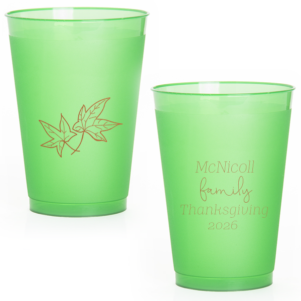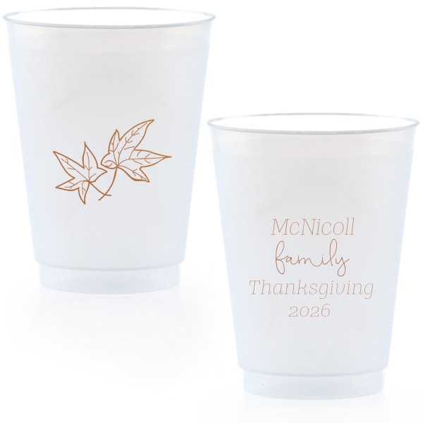 Zoom Show guides Loading product Thanksgiving Fall Leaves Cup 14-oz.Frosted Cup Design ID: 280142 Click on swatch to see options Choose Your Screen Print Active Color Metallic Cup Ink Metallic Cup Ink Silver Ink Gold Ink Copper Ink Matte Cup Ink Matte Cup Ink Matte Chocolate Ink Matte Black Ink Matte Slate Gray Ink Matte White Ink Matte Sunflower Ink Matte Moss Green Ink Matte Sage Ink Matte Leaf Ink Matte Spruce Matte Teal/Peacock Ink Matte Sky Blue Ink Matte French Blue Ink Matte Royal Blue Ink Matte Navy Ink Matte Cobalt Ink Matte Lavender Ink Matte Ballet Pink Ink Matte Fuchsia Ink Matte Lipstick Red Ink Matte Merlot Ink Matte Tangerine Ink Personalize Your Text Line 1 - Back Line 2 - Back Line 3 - Back Line 4 - Back Personalize further with different fonts, graphics, positioning, and sizes. (Optional) Customize More Choose Your Quantity Subtotal PRICE INCLUDES: Select a Proof Option: Print As Is I confirm that I have reviewed my design and I understand it will be produced as shown and no proof will be provided. Digital Proof + $15 I would like an expert FYP designer to look at my design, make minor corrections if necessary, and send me a black and white proof before the order is produced. Orders delivered as soon as 12.19.2025. Exclusions apply. Share Your Design About This Design Elevate your autumn gatherings with the Thanksgiving Fall Leaves Cup! Two elegant fall leaves float gracefully, adding a touch of seasonal charm. Personalize the reverse side with four dynamic lines, each in playful fonts. Perfect for sipping and celebrating in style. Cheers to a well-scripted harvest! Product Details Product Details Minimum order of 25 Measures 4.5" tall and 3.2" wide at the top Holds 13.8 oz flush fill volume Perfect for mixed drinks and signature cocktails BPA-free and recyclable Shatterproof and top-rack dishwasher safe Bulk discounts available Expedited shipping options available. Product Description Product Description Frost flex cups from For Your Party are a perfect accent to any event, from weddings to birthdays. Their translucent plastic complements any drink or color scheme, and can have any art you can imagine. They’re also reusable, so your guests can have a keepsake from your special day. Like our 12 oz. frost flex cups, our 14 oz. frost flex cups are made in the USA, BPA free, and can be hand-washed again and again to remember your event. Our 14 oz. size is perfect for mixed drinks and signature cocktails, and has a flush fill volume of 13.8 oz. Product Options 14-oz.Frosted Cup 16-oz. Frosted Cup 16oz Frost Flex Color 24-oz. Frosted Cup 12oz Frost Flex Color 12-oz. Frosted Cup 10-oz.Frosted Cup 9-oz. Frosted Cup Related Products 14-oz.Frosted Cup 16-oz. Frosted Cup 16oz Frost Flex Color 24-oz. Frosted Cup 12oz Frost Flex Color 12-oz. Frosted Cup 10-oz.Frosted Cup 9-oz. Frosted Cup