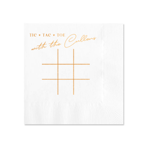 Zoom Show guides Loading product Tic Tac Toe Napkin Square Cocktail Napkin Design ID: 1991846 Click on swatch to see options Choose Your Product Color Active Color 3 ply 3 ply Top quality 3 ply. Dyed tissue. Sand Black Slate Platinum Pin Dot Dove Gray Dove Gray Borderless White White Borderless White Pin Dot White Scallop Ivory Ivory Borderless Kiwi Pin Dot Spruce Pin Dot Olive Pin Dot Dark Navy Pin Dot Light Navy Dark Turquoise Pin Dot Turquoise Powder Blue Pin Dot Lavender Pin Dot Merlot Pin Dot Antique Pink Pin Dot Ballet Pink Ballet Pink Borderless Convertible Red Light Coral Tangerine Pin Dot Platinum Out Until: 2026-04-18 Mimosa Out Until: 2026-05-04 Lemon Pin Dot Out Until: 2026-04-13 Kiwi Out Until: 2026-04-14 Leaf Pin Dot Out Until: 2026-04-25 Lavender Out Until: 2026-04-17 Merlot Out Until: 2026-04-05 Fuchsia Out Until: 2026-04-21 Candy Pink Out Until: 2026-05-01 Linen Like* - Premium Product Linen Like* - Premium Product Absorbent. Dyed tissue. Airlaid. Premium pricing applies. Pebble Kraft Metallic Copper Ash Grey Brown Black Charcoal Stone Gray Metallic Silver Fog White Ivory Cream Buttercream Metallic Gold Lemon Moss Green Olive Green Hunter Green Pastel Green Lime Eucalyptus Dark Turquoise Bright Sky Powder Blue Navy Lavender Berry Magenta Pink Pastel Pink Lipstick Red Terracotta Peach Mango Merlot Crosshatch* - Premium Product Crosshatch* - Premium Product Absorbent. Printed tissue. Airlaid. Premium pricing applies. Crosshatch Black Crosshatch Gray Crosshatch Stone Crosshatch Key Lime Crosshatch Green Crosshatch Navy Crosshatch Turquoise Out Until: 2026-05-10 Crosshatch Violet Out Until: 2026-05-03 Crosshatch Fuchsia Out Until: 2026-01-29 Crosshatch Lipstick Red Out Until: 2026-04-16 Woven* - Premium Product Woven* - Premium Product Basketweave texture. Single-sided color. Premium pricing applies. Woven Sand Woven Copper Woven Black Woven Slate Woven Silver Woven Stone Woven Vanilla Woven White Woven Gold Woven Sage Woven Spruce Woven Powder Blue Woven Navy Woven Mauve Woven Convertible Red Woven Tumeric Patterned* - Premium Product Patterned* - Premium Product Exclusive FYP patterns. Single-sided color. Pindot embossed edge. Product pricing applies. Oak Wood Walnut Wood Ebony Wood Ash Wood Birch Wood Marble Sand Marble Gray Marble Navy Marble Taupe Marble Blush Ombre Black Ombre Navy Ombre Robin’s Egg Blue Ombre Rose Petal Ombre Coral Watercolor Sea Glass Watercolor Ocean Watercolor Nightfall Watercolor Sangria Watercolor Hibiscus Watercolor Rose Watercolor Sunrise Leaf Sand Leaf Fern Leaf Rain Leaf Rose Tie Dye Sunflower Tie Dye Leaf Tie Dye Turquoise Tie Dye Fuchsia Shimmer* - Premium Product Shimmer* - Premium Product Elegant European Stardream with iridescent finish. Single-sided color. Pindot embossed edge. Premium pricing applies. Champagne Soft Black Galvanized Silver Crystal White Ivory Pearl Gold Sage Navy Amethyst Herringbone* - Premium Product Herringbone* - Premium Product Absorbent. Printed Herringbone pattern. Airlaid. Premium pricing applies. Herringbone Gray Onyx Herringbone Vanilla Mocha Out Until: 2026-04-21 Choose Your Imprint Foil Color Active Color Shiny Foil Shiny Foil Metallic, lustrous finish. *Specialty patterned foil may vary on final print Shiny Champagne Shiny Sterling Silver Shiny 18 Kt Gold Shiny Kiwi / Lime Shiny Leaf Shiny Spruce Shiny Jade Shiny Royal Blue Shiny Amethyst Shiny Fuchsia Shiny Rose Quartz Shiny Rose Gold NEW Shiny Merlot Shiny Convertible Red Shiny Poppy Shiny Copper *Shiny Holographic Gold *Shiny Holographic Silver *Shiny Rainbow Matte Foil Matte Foil Flat finish. Matte NEW Chocolate Matte Black Matte Slate Gray Matte Dove Grey Matte White Matte Ivory Matte Mimosa Yellow Matte Sunflower Matte Key Lime Matte Leaf Matte Teal/Peacock Matte Azure Matte Royal Blue Matte Navy Matte Amethyst Matte Pastel Pink Matte Ballet Pink Matte Fuchsia Matte Lipstick Red Matte Merlot Matte Tangerine Satin Foil Satin Foil Muted sheen, brushed finish. Satin Sterling Silver Satin 18 Kt. Gold Satin Copper Penny Satin Fuchsia Satin Lipstick Red Satin Leaf Satin Teal / Peacock Satin French Blue Satin Plum Personalize Your Text Line 1 Line 2 Personalize further with different fonts, graphics, positioning, and sizes. (Optional) Customize More Choose Your Quantity Subtotal PRICE INCLUDES: Select a Proof Option: Print As Is I confirm that I have reviewed my design and I understand it will be produced as shown and no proof will be provided. Digital Proof + $15 I would like an expert FYP designer to look at my design, make minor corrections if necessary, and send me a black and white proof before the order is produced. Orders delivered as soon as 04.22.2026. Exclusions apply. Share Your Design About This Design Play Tic Tac Toe on this napkin! This cheeky napkin is a fun wedding party accessory to have at cocktail hour. Your guests can play tic tac toe and have a ball. Product Details Product Details Classic 3-ply tissue, 4.75” or 5” square Colors vary Signature foil stamp included Bulk discounts available Expedited shipping options available. Product Description Product Description Classic Cocktail Napkins are the perfect companion for any event. Add a touch of refinement to your cocktail parties, weddings, or birthday celebrations. Whether you're sipping a Martini, Old Fashioned, or a signature cocktail, these beverage napkins are the perfect accompaniment to elevate your drink service to new heights.Traditionally designed with a classic pleated edge, highly absorbent, durable, crafted from high-quality, premium-grade paper, our Classic Cocktail Napkins are an excellent, timeless choice. They are soft to the touch, keeping your guests' hands dry and your furniture protected. Once used, simply discard them, making cleanup a breeze. Explore our Cocktail Napkins Collection to find the perfect option for your event. Due to the complexities of manufacturing, the size of the embossed border on our 3-ply napkins may vary slightly. These discrepancies ar