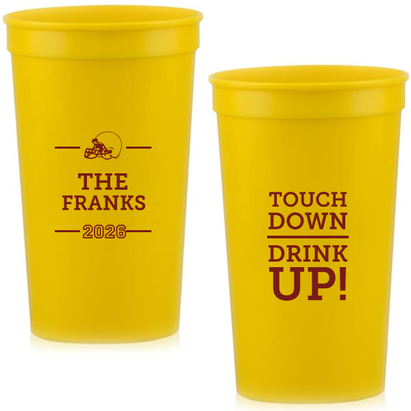 Zoom Show guides Loading product Touchdown Family Name Cup 22-oz. Stadium Cup Design ID: 320301 Click on swatch to see options Choose Your Product Color Active Color Cup Colors Cup Colors Clear Black White Royal Blue Navy Choose Your Screen Print Active Color Metallic Cup Ink Metallic Cup Ink Silver Ink Gold Ink Copper Ink Matte Cup Ink Matte Cup Ink Matte Chocolate Ink Matte Black Ink Matte Slate Gray Ink Matte White Ink Matte Sunflower Ink Matte Moss Green Ink Matte Sage Ink Matte Leaf Ink Matte Spruce Matte Teal/Peacock Ink Matte Sky Blue Ink Matte French Blue Ink Matte Royal Blue Ink Matte Navy Ink Matte Cobalt Ink Matte Lavender Ink Matte Ballet Pink Ink Matte Fuchsia Ink Matte Lipstick Red Ink Matte Merlot Ink Matte Tangerine Ink Personalize Your Text Line 1 - Front Line 2 - Front Personalize further with different fonts, graphics, positioning, and sizes. (Optional) Customize More Choose Your Quantity Subtotal PRICE INCLUDES: Select a Proof Option: Print As Is I confirm that I have reviewed my design and I understand it will be produced as shown and no proof will be provided. Digital Proof + $15 I would like an expert FYP designer to look at my design, make minor corrections if necessary, and send me a black and white proof before the order is produced. Orders delivered as soon as 12.19.2025. Exclusions apply. Share Your Design About This Design Elevate your game-day experience with the Touchdown Family Name Cup. One side boasts a helmet graphic, crowned by your family name and the season year stacked below. On game day toast to "Touchdown, Drink Up!" with each winning play—perfect for the ultimate football-loving hosts! Product Details Product Details Minimum order of 50 Measures 5.7" tall and 3.6" wide at the top Thin manufacturer mark may appear 0.75" to 1" from the bottom of the cup Ideal for beer, soft drinks, and water BPA-free and recyclable Shatterproof and top-rack dishwasher safe Bulk discounts available Expedited shipping options available. Product Description Product Description Want a cup that says party, but in a bigger size? Our stadium cups are made of sturdy colorful plastic and are perfect for birthdays, home entertaining, or casual get-togethers. They come in colors for every team, and are a great way to party in style. Like our frost flex cups, our 22 oz. stadium cups are great for beer, soda, or water. They’re made of reusable, dishwasher-safe plastic, and are made in the USA like our entire cup range. Try them for beer or soft drinks at your next tailgate! Product Options 22-oz. Stadium Cup 32-oz. Stadium Cup 16-oz.Stadium Cup 16-oz. Color Changing Cup Related Products 22-oz. Stadium Cup 32-oz. Stadium Cup 16-oz.Stadium Cup 16-oz. Color Changing Cup