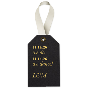 Zoom Show guides Loading product We Do, We Dance Gift Tag Round Arch Gift Tag Design ID: 1573177 Click on swatch to see options Choose Your Paper Color Active Color Natural Natural Smooth, matte finish. Double-sided color. 100lb+ cover stock. Natural NEW Sand Natural Khaki Natural NEW Kraft Natural Mushroom Natural NEW Chocolate Natural Black Natural Slate Natural Gray Natural Smoke Natural NEW Frost White Natural Ivory Natural Olive Natural Dark Sage Natural Eucalyptus Natural Fern Natural Leaf Natural Spruce Natural Dark Teal Natural Royal Blue Natural NEW Amethyst Natural Scarlet Natural Antique Rose Natural Terracotta Natural Harvest Shiny Shiny Smooth, high-gloss finish. Single-sided color. 100lb+ cover stock. Shiny Black Shiny White Shiny Navy Blue Shiny Fuchsia Shiny Convertible Red Linen Linen Slightly textured, matte finish. Double-sided color. 100lb+ cover stock. Linen Convertible Red Linen Black Linen Slate Linen Antique Gray Linen White Linen Eggshell Linen Ivory Linen Pearl Cream Linen Navy Blue Stardream Stardream European Stardream with iridescent finish. Double-sided color. 105lb+ cover stock. Stardream NEW Black Stardream Galvanized Silver Stardream Silver Stardream Crystal White Stardream Ivory Stardream 18k Gold Stardream Champagne Stardream Old Gold Stardream Super Gold Stardream Orange Stardream Rose Gold Stardream Blush Stardream Ballet Pink Stardream Violet Stardream Lavender Stardream Denim Stardream NEW Peacock Stardream Robin's Egg Blue Poptone Poptone Soft felt texture with matte finish. Double-sided color. 100lb+ cover stock. Poptone Ballet Pink Poptone NEW Fuchsia Poptone Convertible Red Poptone Tangerine Poptone Sunflower Poptone Yellow Poptone Mimosa Poptone Mint Poptone Kiwi Poptone Robin’s Egg Blue Poptone Dark Turquoise Poptone Sky Blue Poptone NEW French Blue Poptone Lavender Poptone Lilac Textured Textured Variety of textures. Single-sided color. 110lb+ cover stock. Oak Wood Walnut Wood Ebony Wood Ash Wood Birch Wood Leather Like Tan Leather Like Black Leather Like Pearl Leather Like White Leather Like Night Blue Leather Like Lipstick Red Horizontal White Glitter* - Premium Product Glitter* - Premium Product Sparkly with a slightly textured finish. Single-sided with a white back and 100lb+ cover stock. Premium pricing applies. Glitter NEW Black Glitter NEW Silver Glitter Champagne Glitter Rose Copper Glitter Night Fall Patterned* - Premium Product Patterned* - Premium Product Smooth, matte finish. Single-sided pattern with white back. Pattern and color may vary between products. 100 lb paper. Premium pricing applies. Marble Sand Marble Gray Marble Navy Marble Taupe Marble Blush Watercolor Seaglass Watercolor Ocean Watercolor Night Fall Watercolor Sangria Watercolor Hibiscus Watercolor Rose Watercolor Sunrise Leaf Sand Leaf Fern Leaf Rain Leaf Rose Blank Stock Blank Stock Blank Stock Choose Your Imprint Foil Color Active Color Shiny Foil Shiny Foil Metallic, lustrous finish. *Specialty patterned foil may vary on final print Shiny Champagne Shiny Sterling Silver Shiny 18 Kt Gold Shiny Kiwi / Lime Shiny Leaf Shiny Spruce Shiny Jade Shiny Royal Blue Shiny Amethyst Shiny Fuchsia Shiny Rose Quartz Shiny Rose Gold NEW Shiny Merlot Shiny Convertible Red Shiny Poppy Shiny Copper *Shiny Holographic Gold *Shiny Holographic Silver *Shiny Rainbow Matte Foil Matte Foil Flat finish. Matte NEW Chocolate Matte Black Matte Slate Gray Matte Dove Grey Matte White Matte Ivory Matte Mimosa Yellow Matte Sunflower Matte Key Lime Matte Leaf Matte Teal/Peacock Matte Azure Matte Royal Blue Matte Navy Matte Amethyst Matte Pastel Pink Matte Ballet Pink Matte Fuchsia Matte Lipstick Red Matte Merlot Matte Tangerine Satin Foil Satin Foil Muted sheen, brushed finish. Satin Sterling Silver Satin 18 Kt. Gold Satin Copper Penny Satin Fuchsia Satin Lipstick Red Satin Leaf Satin Teal / Peacock Satin French Blue Satin Plum Choose Your Ribbon Color Active Color Ribbons - Additional Charge Ribbons - Additional Charge Champagne Copper Brownie Espresso Black Slate Sterling Silver White Ivory Pearl Gold Mimosa Sunflower Gold Kiwi Leaf Forest Olive Pistachio Green Tea Peacock Robin’s Egg Blue Turquoise Dark Turquoise Royal Blue Glacier Blue Sky Blue Lavender Violet Amethyst Cranberry Merlot Plum Candy Pink Ballet Pink Rose Petal Fuchsia Convertible Red Brick Tangerine None Navy Out Until: 2026-05-22 Personalize Your Text Line 1 Line 2 Line 3 Personalize further with different fonts, graphics, positioning, and sizes. (Optional) Customize More Choose Your Quantity Subtotal PRICE INCLUDES: Select a Proof Option: Print As Is I confirm that I have reviewed my design and I understand it will be produced as shown and no proof will be provided. Digital Proof + $15 I would like an expert FYP designer to look at my design, make minor corrections if necessary, and send me a black and white proof before the order is produced. Orders delivered as soon as 05.04.2026. Exclusions apply. Share Your Design About This Design Our beautiful custom Natural Black Arch Gift Tag with Shiny 18 Kt Gold Foil will add that special attention to detail that cannot be overlooked. Product Details Product Details Minimum order of 25 Measures 2.4" wide by 4" high Bulk discounts available Expedited shipping options available. Product Description Product Description Our Arch Gift tags are the perfect way to say thank you to your wedding guests, give a gift with extra meaning or as a keepsake of your event. Guests will love that you're giving them something sentimental and practical. These high-quality, foil-stamped, paper tags come in a variety of shapes and colors and can be customized with a special message or sentiment. The tags already have a hole punched in them, making them simple to attach to any ribbon or twine. For an extra touch of elegance, you can also try our double-sided bridal satin ribbon, available in several coordinating colors. Product Options Round Arch Gift Tag Double Point Straw Tag Wine Bottle Gift Tag Rel