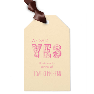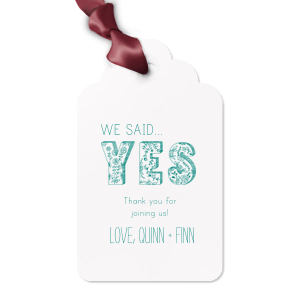 Zoom Show guides Loading product We Said Yes Letterpress Tag Double Point Straw Tag Design ID: 2142525 Click on swatch to see options Choose Your Paper Color Active Color Natural Natural Smooth, matte finish. Double-sided color. 100lb+ cover stock. Natural NEW Frost White Natural Ivory Choose Your Letterpress Inks Active Color Letterpress Inks Letterpress Inks Platinum Black Hot Pink Chocolate Ivy Mint Violet Slate Mint Light Coral Lipstick Red Navy Liberty Blue Teal/Peacock Mustard Gold Choose Your Ribbon Color Active Color Ribbons - Additional Charge Ribbons - Additional Charge Champagne Copper Brownie Espresso Black Slate Sterling Silver White Ivory Pearl Gold Mimosa Sunflower Kiwi Leaf Forest Olive Pistachio Green Tea Peacock Robin’s Egg Blue Turquoise Dark Turquoise Navy Royal Blue Glacier Blue Lavender Violet Cranberry Merlot Candy Pink Ballet Pink Rose Petal Fuchsia Brick Convertible Red Tangerine None Gold Out Until: 2025-10-30 Sky Blue Out Until: 2025-11-28 Amethyst Out Until: 2025-11-28 Plum Out Until: 2025-11-28 Coral Out Until: 2025-11-29 Personalize Your Text Line 4 Personalize further with different fonts, graphics, positioning, and sizes. (Optional) Customize More Choose Your Quantity Subtotal PRICE INCLUDES: Select a Proof Option: Print As Is I confirm that I have reviewed my design and I understand it will be produced as shown and no proof will be provided. Digital Proof + $15 I would like an expert FYP designer to look at my design, make minor corrections if necessary, and send me a black and white proof before the order is produced. Orders delivered as soon as 11.06.2025. Exclusions apply. Share Your Design About This Design Tie party favors with this cute custom gift tag for a personalized thank you! Combined with the happy couple's names, our Floral Yes word art in Gold foil with Sky Blue paper will make a beautiful wedding gift tag. Product Details Product Details 25 minimum 2.5" w X 4.125" h Volume discounts Expedited options available Product Description Product Description Experience the bespoke touch with our Custom Letterpress Double Point Gift Tags, tailored to mirror your unique style. Perfect for upscale weddings, milestone anniversaries, themed birthdays, and personalized corporate events, these tags are the quintessential mark of exclusivity. Exemplifying master craftsmanship, these tags exhibit the rich, tactile allure characteristic of letterpress. Their dual-point design ensures a distinctive look, while robustness guarantees longevity. Offering both personalization and elegance, these tags provide shoppers an unmatched blend of individuality and sophistication. Dive deeper into bespoke options on our custom gift bags collection. Product Options Double Point Straw Tag Round Arch Gift Tag Luggage Tag Related Products Double Point Straw Tag Round Arch Gift Tag Luggage Tag