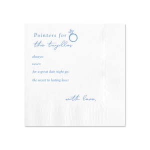 Zoom Show guides Loading product Wedding Advice Napkin Square Cocktail Napkin Design ID: 1986279 Click on swatch to see options Choose Your Product Color Active Color 3 ply 3 ply Top quality 3 ply. Dyed tissue. Sand Black Slate Platinum Pin Dot Dove Gray Dove Gray Borderless White White Borderless White Pin Dot White Scallop Ivory Ivory Borderless Kiwi Kiwi Pin Dot Leaf Pin Dot Spruce Pin Dot Olive Pin Dot Dark Navy Pin Dot Light Navy Dark Turquoise Pin Dot Turquoise Powder Blue Pin Dot Lavender Pin Dot Merlot Pin Dot Antique Pink Pin Dot Ballet Pink Ballet Pink Borderless Convertible Red Light Coral Tangerine Pin Dot Platinum Out Until: 2026-04-18 Mimosa Out Until: 2026-05-17 Lemon Pin Dot Out Until: 2026-05-13 Lavender Out Until: 2026-04-17 Merlot Out Until: 2026-05-13 Fuchsia Out Until: 2026-04-21 Candy Pink Out Until: 2026-05-01 Linen Like* - Premium Product Linen Like* - Premium Product Absorbent. Dyed tissue. Airlaid. Premium pricing applies. Pebble Kraft Metallic Copper Ash Grey Brown Black Charcoal Stone Gray Metallic Silver Fog White Ivory Cream Buttercream Metallic Gold Moss Green Olive Green Hunter Green Pastel Green Lime Eucalyptus Dark Turquoise Bright Sky Powder Blue Navy Lavender Magenta Pink Pastel Pink Lipstick Red Terracotta Peach Mango Lemon Out Until: 2026-05-19 Berry Out Until: 2026-05-15 Merlot Crosshatch* - Premium Product Crosshatch* - Premium Product Absorbent. Printed tissue. Airlaid. Premium pricing applies. Crosshatch Black Crosshatch Gray Crosshatch Stone Crosshatch Key Lime Crosshatch Green Crosshatch Navy Crosshatch Turquoise Out Until: 2026-05-10 Crosshatch Violet Out Until: 2026-05-14 Crosshatch Fuchsia Out Until: 2026-01-29 Crosshatch Lipstick Red Out Until: 2026-05-16 Woven* - Premium Product Woven* - Premium Product Basketweave texture. Single-sided color. Premium pricing applies. Woven Sand Woven Copper Woven Black Woven Slate Woven Silver Woven Stone Woven Vanilla Woven White Woven Gold Woven Sage Woven Spruce Woven Powder Blue Woven Navy Woven Mauve Woven Convertible Red Woven Tumeric Patterned* - Premium Product Patterned* - Premium Product Exclusive FYP patterns. Single-sided color. Pindot embossed edge. Product pricing applies. Oak Wood Walnut Wood Ebony Wood Ash Wood Birch Wood Marble Sand Marble Gray Marble Navy Marble Taupe Marble Blush Ombre Black Ombre Navy Ombre Robin’s Egg Blue Ombre Rose Petal Ombre Coral Watercolor Sea Glass Watercolor Ocean Watercolor Nightfall Watercolor Sangria Watercolor Hibiscus Watercolor Rose Watercolor Sunrise Leaf Sand Leaf Fern Leaf Rain Leaf Rose Tie Dye Sunflower Tie Dye Leaf Tie Dye Turquoise Tie Dye Fuchsia Shimmer* - Premium Product Shimmer* - Premium Product Elegant European Stardream with iridescent finish. Single-sided color. Pindot embossed edge. Premium pricing applies. Champagne Soft Black Galvanized Silver Crystal White Ivory Pearl Gold Sage Navy Amethyst Out Until: 2026-05-19 Herringbone* - Premium Product Herringbone* - Premium Product Absorbent. Printed Herringbone pattern. Airlaid. Premium pricing applies. Herringbone Gray Onyx Herringbone Vanilla Mocha Out Until: 2026-04-21 Choose Your Imprint Foil Color Active Color Shiny Foil Shiny Foil Metallic, lustrous finish. *Specialty patterned foil may vary on final print Shiny Champagne Shiny Sterling Silver Shiny 18 Kt Gold Shiny Kiwi / Lime Shiny Leaf Shiny Spruce Shiny Jade Shiny Royal Blue Shiny Amethyst Shiny Fuchsia Shiny Rose Quartz Shiny Rose Gold NEW Shiny Merlot Shiny Convertible Red Shiny Poppy Shiny Copper *Shiny Holographic Gold *Shiny Holographic Silver *Shiny Rainbow Matte Foil Matte Foil Flat finish. Matte NEW Chocolate Matte Black Matte Slate Gray Matte Dove Grey Matte White Matte Ivory Matte Mimosa Yellow Matte Sunflower Matte Key Lime Matte Leaf Matte Teal/Peacock Matte Azure Matte Royal Blue Matte Navy Matte Amethyst Matte Pastel Pink Matte Ballet Pink Matte Fuchsia Matte Lipstick Red Matte Merlot Matte Tangerine Satin Foil Satin Foil Muted sheen, brushed finish. Satin Sterling Silver Satin 18 Kt. Gold Satin Copper Penny Satin Fuchsia Satin Lipstick Red Satin Leaf Satin Teal / Peacock Satin French Blue Satin Plum Personalize Your Text Line 1 Line 2 Line 3 Line 4 Line 5 Line 6 Line 7 Personalize further with different fonts, graphics, positioning, and sizes. (Optional) Customize More Choose Your Quantity Subtotal PRICE INCLUDES: Select a Proof Option: Print As Is I confirm that I have reviewed my design and I understand it will be produced as shown and no proof will be provided. Digital Proof + $15 I would like an expert FYP designer to look at my design, make minor corrections if necessary, and send me a black and white proof before the order is produced. Orders delivered as soon as 04.30.2026. Exclusions apply. Share Your Design About This Design Looking for a creative wedding detail? Get your guests to give you wedding advice on personalized napkins! They can write advice for a date night idea, does, and don'ts. After you can have a memorable collage of all of the wedding advice from your guests! Product Details Product Details Classic 3-ply tissue, 4.75” or 5” square Colors vary Signature foil stamp included Bulk discounts available Expedited shipping options available. Product Description Product Description Classic Cocktail Napkins are the perfect companion for any event. Add a touch of refinement to your cocktail parties, weddings, or birthday celebrations. Whether you're sipping a Martini, Old Fashioned, or a signature cocktail, these beverage napkins are the perfect accompaniment to elevate your drink service to new heights.Traditionally designed with a classic pleated edge, highly absorbent, durable, crafted from high-quality, premium-grade paper, our Classic Cocktail Napkins are an excellent, timeless choice. They are soft to the touch, keeping your guests' hands dry and your furniture protected. Once used, simply discard them, making cleanup a breeze. Explore our Cocktail Napkins Collection to find the perfect opti
