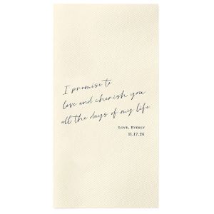 Zoom Show guides Loading product Wedding Vow Napkin Square Linen Like Cocktail Napkin Design ID: 1618176 Click on swatch to see options Choose Your Product Color Active Color Linen Like* - Premium Product Linen Like* - Premium Product Absorbent. Dyed tissue. Airlaid. Premium pricing applies. Pebble Kraft Ash Grey Brown Black Charcoal Stone Gray Fog White Ivory Cream Buttercream Lemon Moss Green Olive Green Hunter Green Pastel Green Lime Eucalyptus Dark Turquoise Bright Sky Powder Blue Navy Lavender Berry Magenta Pink Pastel Pink Lipstick Red Terracotta Peach Mango Metallic Silver Metallic Gold Metallic Copper Merlot Crosshatch* - Premium Product Crosshatch* - Premium Product Absorbent. Printed tissue. Airlaid. Premium pricing applies. Crosshatch Black Crosshatch Gray Crosshatch Stone Crosshatch Key Lime Crosshatch Green Crosshatch Navy Crosshatch Violet Crosshatch Turquoise Out Until: 2026-05-10 Crosshatch Fuchsia Out Until: 2026-01-29 Crosshatch Lipstick Red Out Until: 2026-04-16 Herringbone* - Premium Product Herringbone* - Premium Product Absorbent. Printed Herringbone pattern. Airlaid. Premium pricing applies. Herringbone Gray Onyx Herringbone Vanilla Mocha Out Until: 2026-04-21 Choose Your Imprint Foil Color Active Color Shiny Foil Shiny Foil Metallic, lustrous finish. *Specialty patterned foil may vary on final print Shiny Champagne Shiny Sterling Silver Shiny 18 Kt Gold Shiny Kiwi / Lime Shiny Leaf Shiny Spruce Shiny Jade Shiny Royal Blue Shiny Amethyst Shiny Fuchsia Shiny Rose Quartz Shiny Rose Gold NEW Shiny Merlot Shiny Convertible Red Shiny Poppy Shiny Copper *Shiny Holographic Gold *Shiny Holographic Silver *Shiny Rainbow Matte Foil Matte Foil Flat finish. Matte NEW Chocolate Matte Black Matte Slate Gray Matte Dove Grey Matte White Matte Ivory Matte Mimosa Yellow Matte Sunflower Matte Key Lime Matte Leaf Matte Teal/Peacock Matte Azure Matte Royal Blue Matte Navy Matte Amethyst Matte Pastel Pink Matte Ballet Pink Matte Fuchsia Matte Lipstick Red Matte Merlot Matte Tangerine Satin Foil Satin Foil Muted sheen, brushed finish. Satin Sterling Silver Satin 18 Kt. Gold Satin Copper Penny Satin Fuchsia Satin Lipstick Red Satin Leaf Satin Teal / Peacock Satin French Blue Satin Plum Personalize Your Text Line 1 Line 2 Line 3 Line 4 Line 5 Personalize further with different fonts, graphics, positioning, and sizes. (Optional) Customize More Choose Your Quantity Subtotal PRICE INCLUDES: Select a Proof Option: Print As Is I confirm that I have reviewed my design and I understand it will be produced as shown and no proof will be provided. Digital Proof + $15 I would like an expert FYP designer to look at my design, make minor corrections if necessary, and send me a black and white proof before the order is produced. Orders delivered as soon as 04.24.2026. Exclusions apply. Share Your Design About This Design Our custom Peach Linen Like Cocktail Napkin with Matte Navy Foil can be personalized to match your party's exact theme and tempo. Product Details Product Details Deluxe air laid paper Measures approximately 5" x 5" Signature foil stamp included Bulk discounts available Expedited shipping options available. Product Description Product Description Introducing our custom Linen-Like Cocktail Napkins, the epitome of elegance and refinement for your sophisticated gatherings. Whether you're hosting a formal wedding reception or a chic cocktail soirée, these linen cocktail napkins effortlessly complement any table setting. Their soft and gentle touch will leave a lasting impression on guests, showcasing your commitment to providing a truly upscale experience. Meticulously crafted, these napkins exude the luxurious look and feel of fine linen while offering the convenience of being disposable. Crafted from premium-quality materials, they are highly absorbent and the same dimensions as our classic cocktail napkins. With the perfect blend of functionality and elegance, you can elevate any upscale bar or lounge. Product Options Square Linen Like Cocktail Napkin Paper Guest Towel Square Left Scalloped Luncheon Napkin Related Products Square Linen Like Cocktail Napkin Paper Guest Towel Square Left Scalloped Luncheon Napkin