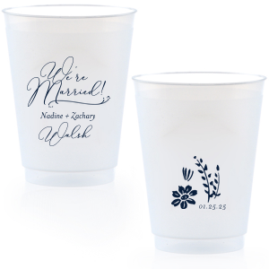 Zoom Show guides Loading product We're Married Bold Script Cup 14-oz.Frosted Cup Design ID: 879822 Click on swatch to see options Choose Your Screen Print Active Color Metallic Cup Ink Metallic Cup Ink Silver Ink Gold Ink Copper Ink Matte Cup Ink Matte Cup Ink Matte Chocolate Ink Matte Black Ink Matte Slate Gray Ink Matte White Ink Matte Sunflower Ink Matte Moss Green Ink Matte Sage Ink Matte Leaf Ink Matte Spruce Matte Teal/Peacock Ink Matte Sky Blue Ink Matte French Blue Ink Matte Royal Blue Ink Matte Navy Ink Matte Cobalt Ink Matte Lavender Ink Matte Ballet Pink Ink Matte Fuchsia Ink Matte Lipstick Red Ink Matte Merlot Ink Matte Tangerine Ink Personalize Your Text Line 1 - Front Line 2 - Front Line 1 - Back Personalize further with different fonts, graphics, positioning, and sizes. (Optional) Customize More Choose Your Quantity Subtotal PRICE INCLUDES: Select a Proof Option: Print As Is I confirm that I have reviewed my design and I understand it will be produced as shown and no proof will be provided. Digital Proof + $15 I would like an expert FYP designer to look at my design, make minor corrections if necessary, and send me a black and white proof before the order is produced. Orders delivered as soon as 11.07.2025. Exclusions apply. Share Your Design About This Design Personalized 14 oz Frost Flex Cup with Matte Stone Blue Ink Colors has a beautiful floral accent graphic and is good for use in wedding and reception themed parties and can be personalized to match your party's exact theme and tempo. Product Details Product Details Minimum order of 25 Measures 4.5" tall and 3.2" wide at the top Holds 13.8 oz flush fill volume Perfect for mixed drinks and signature cocktails BPA-free and recyclable Shatterproof and top-rack dishwasher safe Bulk discounts available Expedited shipping options available. Product Description Product Description Frost flex cups from For Your Party are a perfect accent to any event, from weddings to birthdays. Their translucent plastic complements any drink or color scheme, and can have any art you can imagine. They’re also reusable, so your guests can have a keepsake from your special day. Like our 12 oz. frost flex cups, our 14 oz. frost flex cups are made in the USA, BPA free, and can be hand-washed again and again to remember your event. Our 14 oz. size is perfect for mixed drinks and signature cocktails, and has a flush fill volume of 13.8 oz. Product Options 14-oz.Frosted Cup 16-oz. Frosted Cup 12-oz. Frosted Cup Related Products 14-oz.Frosted Cup 16-oz. Frosted Cup 12-oz. Frosted Cup