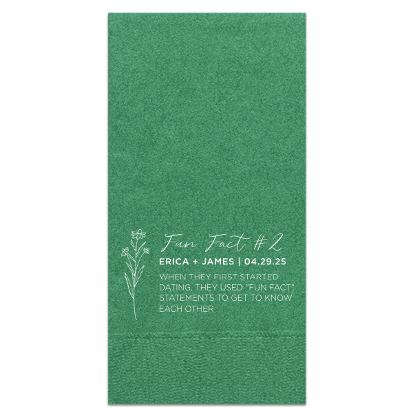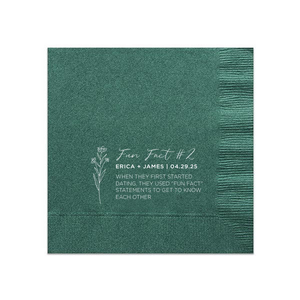 Zoom Show guides Loading product Wildflower Fun Fact Napkin Square Linen Like Cocktail Napkin Design ID: 1554815 Click on swatch to see options Choose Your Product Color Active Color Linen Like* - Premium Product Linen Like* - Premium Product Absorbent. Dyed tissue. Airlaid. Premium pricing applies. Pebble Kraft Ash Grey Black Charcoal Stone Gray Fog White Ivory Cream Buttercream Lemon Moss Green Olive Green Hunter Green Pastel Green Lime Eucalyptus Dark Turquoise Bright Sky Powder Blue Navy Lavender Berry Merlot Magenta Pink Pastel Pink Lipstick Red Terracotta Peach Mango Metallic Silver Metallic Gold Metallic Copper Brown Out Until: 2025-11-21 Plum Out Until: 2025-11-13 Crosshatch* - Premium Product Crosshatch* - Premium Product Absorbent. Printed tissue. Airlaid. Premium pricing applies. Crosshatch Black Crosshatch Gray Crosshatch Stone Crosshatch Green Crosshatch Turquoise Crosshatch Violet Crosshatch Fuchsia Crosshatch Lipstick Red Crosshatch Key Lime Out Until: 2025-11-26 Crosshatch Navy Out Until: 2025-11-24 Herringbone* - Premium Product Herringbone* - Premium Product Absorbent. Printed Herringbone pattern. Airlaid. Premium pricing applies. Herringbone Vanilla Mocha Herringbone Gray Onyx Choose Your Imprint Foil Color Active Color Shiny Foil Shiny Foil Metallic, lustrous finish. *Specialty patterned foil may vary on final print Shiny Champagne Shiny Sterling Silver Shiny 18 Kt Gold Shiny Kiwi / Lime Shiny Leaf Shiny Jade Shiny Royal Blue Shiny Amethyst Shiny Fuchsia Shiny Rose Quartz Shiny Rose Gold NEW Shiny Merlot Shiny Convertible Red Shiny Poppy Shiny Copper *Shiny Holographic Gold *Shiny Holographic Silver *Shiny Rainbow Matte Foil Matte Foil Flat finish. Matte NEW Chocolate Matte Black Matte Slate Gray Matte Dove Grey Matte White Matte Ivory Matte Mimosa Yellow Matte Sunflower Matte Key Lime Matte Leaf Matte Spruce Matte Teal/Peacock Matte Azure Matte Royal Blue Matte Navy Matte Amethyst Matte Pastel Pink Matte Ballet Pink Matte Fuchsia Matte Lipstick Red Matte Merlot Matte Tangerine Satin Foil Satin Foil Muted sheen, brushed finish. Satin Sterling Silver Satin 18 Kt. Gold Satin Copper Penny Satin Fuchsia Satin Lipstick Red Satin Leaf Satin Teal / Peacock Satin French Blue Satin Plum Personalize Your Text Line 1 Line 2 Line 3 Line 4 Line 5 Line 6 Personalize further with different fonts, graphics, positioning, and sizes. (Optional) Customize More Choose Your Quantity Subtotal PRICE INCLUDES: Select a Proof Option: Print As Is I confirm that I have reviewed my design and I understand it will be produced as shown and no proof will be provided. Digital Proof + $15 I would like an expert FYP designer to look at my design, make minor corrections if necessary, and send me a black and white proof before the order is produced. Orders delivered as soon as 11.04.2025. Exclusions apply. Share Your Design About This Design The ever-popular Hunter Green Linen Like Cocktail Napkin with Matte White Foil has a Stem Daisy Flower graphic and is good for use in Floral and Wedding themed parties and can be customized to complement every last detail of your party. Product Details Product Details Deluxe air laid paper Measures approximately 5" x 5" Signature foil stamp included Bulk discounts available Expedited shipping options available. Product Description Product Description Introducing our custom Linen-Like Cocktail Napkins, the epitome of elegance and refinement for your sophisticated gatherings. Whether you're hosting a formal wedding reception or a chic cocktail soirée, these linen cocktail napkins effortlessly complement any table setting. Their soft and gentle touch will leave a lasting impression on guests, showcasing your commitment to providing a truly upscale experience. Meticulously crafted, these napkins exude the luxurious look and feel of fine linen while offering the convenience of being disposable. Crafted from premium-quality materials, they are highly absorbent and the same dimensions as our classic cocktail napkins. With the perfect blend of functionality and elegance, you can elevate any upscale bar or lounge. Product Options Square Linen Like Cocktail Napkin Paper Guest Towel Square Luncheon Napkin Related Products Square Linen Like Cocktail Napkin Paper Guest Towel Square Luncheon Napkin